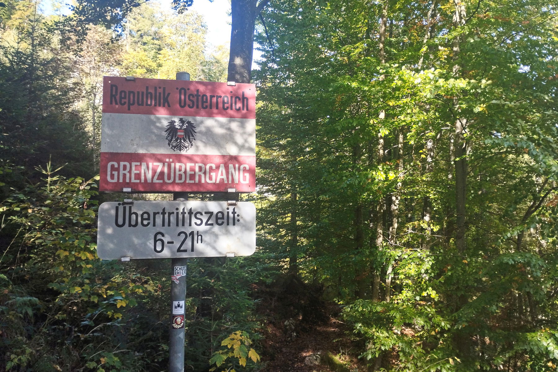 In Kössen wenden wir uns in Richtung Westen und erreichen dem Lauf der Straße Richtung Schleching und erreichen schnell eine sehr auffällige, überdachte Holzbrücke auf der wir die Großache – welche in Bayern Tiroler Ache genannt wird – überqueren. Nach der Brücke wenden wir uns nach rechts in nördliche Richtung und folgen im weiteren Sinne dem Flusslauf. Die letzten Häuser von Kössen liegen bald hinter uns und dichter Wald umschließt den Weg. In vergangenen Zeiten war dieser Weg bei Schmugglern von beiderseits der Grenze sehr beliebt. Geschmuggelt wurde so ziemlich alles über den insgesamt beschwerlichen Steig. Das ist heutzutage zum Glück nicht mehr nötig, von der Grenze ist nicht viel mehr als das obligatorische Hinweisschild geblieben.