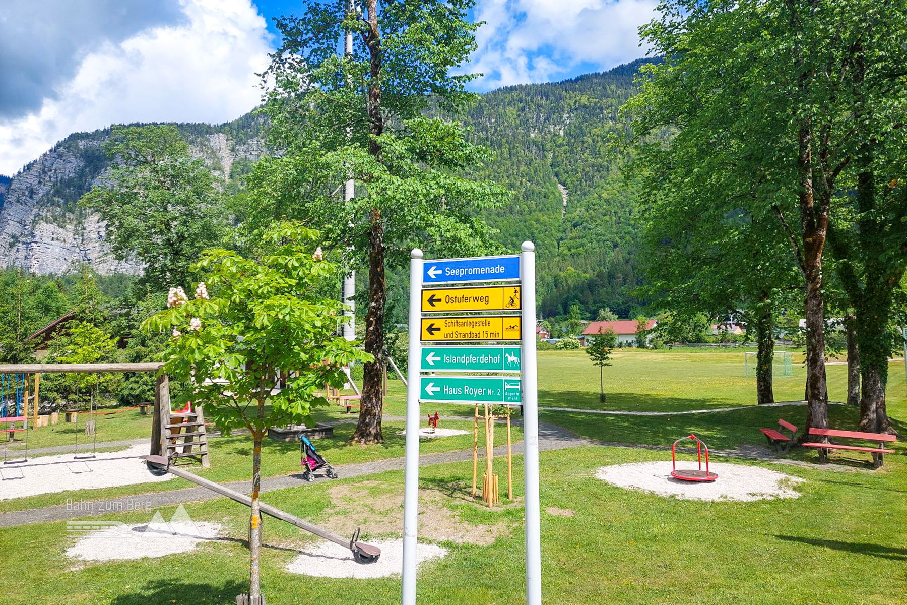 Gleich zu Beginn der Wanderung empfehle ich einen kleinen Umweg in Obertraun zu gehen, denn bei der Seepromenade ist der Blick auf das Seeufer und die dahinterliegenden Berge sehr schön. Vom Bahnhof Obertraun Dachsteinhöhlen geht man zuerst einen Weg zwischen Häusern durch bzw. die Schienen entlang in Richtung Osten, überquert dann nach rechts die Gleise und folgt dem Gehweg in Richtung Dachstein Krippenstein. Beim Spielplatz vor der Traunbrücke biegt man rechts ab und folgt dann dem Ostuferweg, der zum Teil auch der Radweg R2 ist.