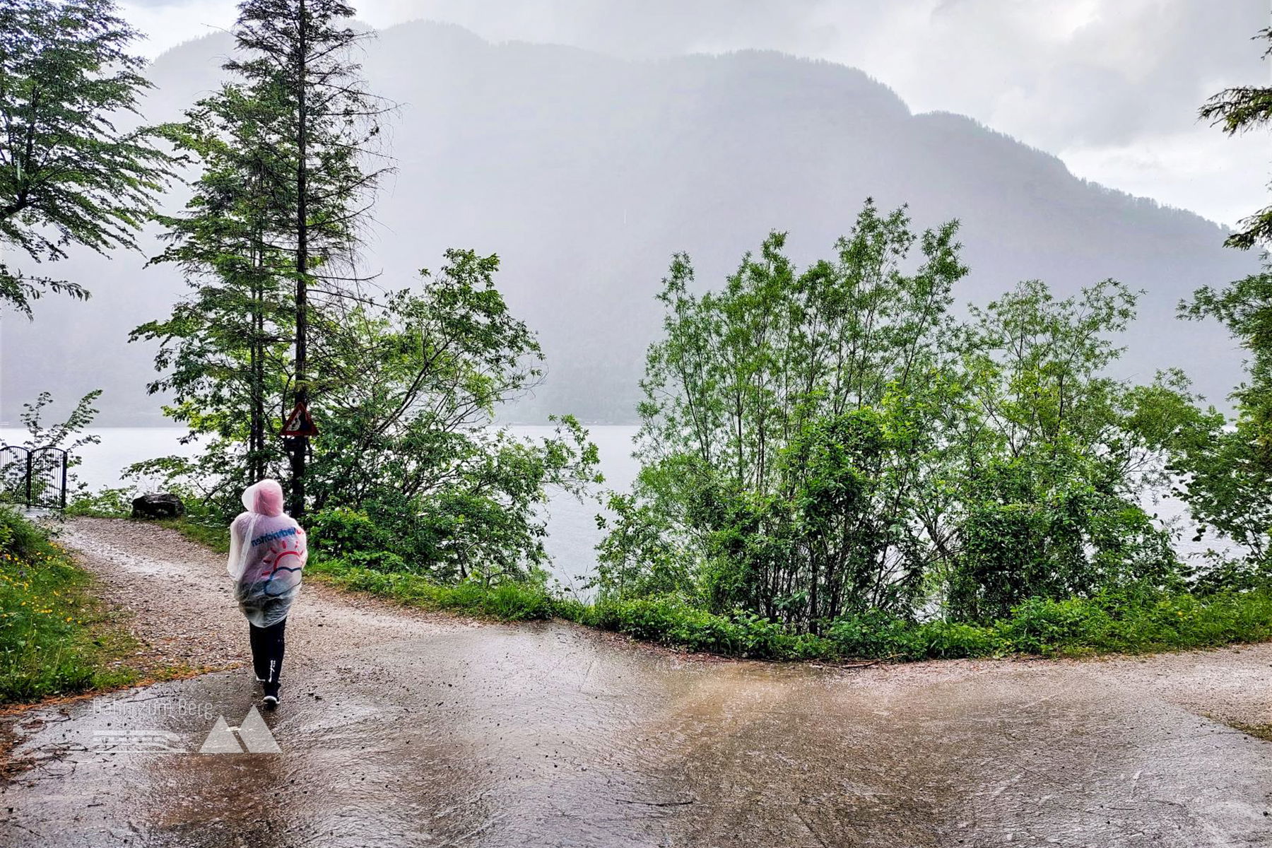 Der Weg ist eigentlich immer gut angeschrieben. Als wir im Bereich des Bahnhofs Hallstatt sind, wo auch die Schiffsanlegestelle ist, kommt der an diesem Tag angesagte Regen und begleitet uns für eine Weile. Ausgerüstet mit Regenjacken und Ponchos ist das nicht weiter schlimm und wir sind froh, dass es nicht während der ganzen Wanderung regnet. Weiter geht’s dann zum Teil auf Gummimatten, die das Ausrutschen verhindern sollen und bei uns auch tun.