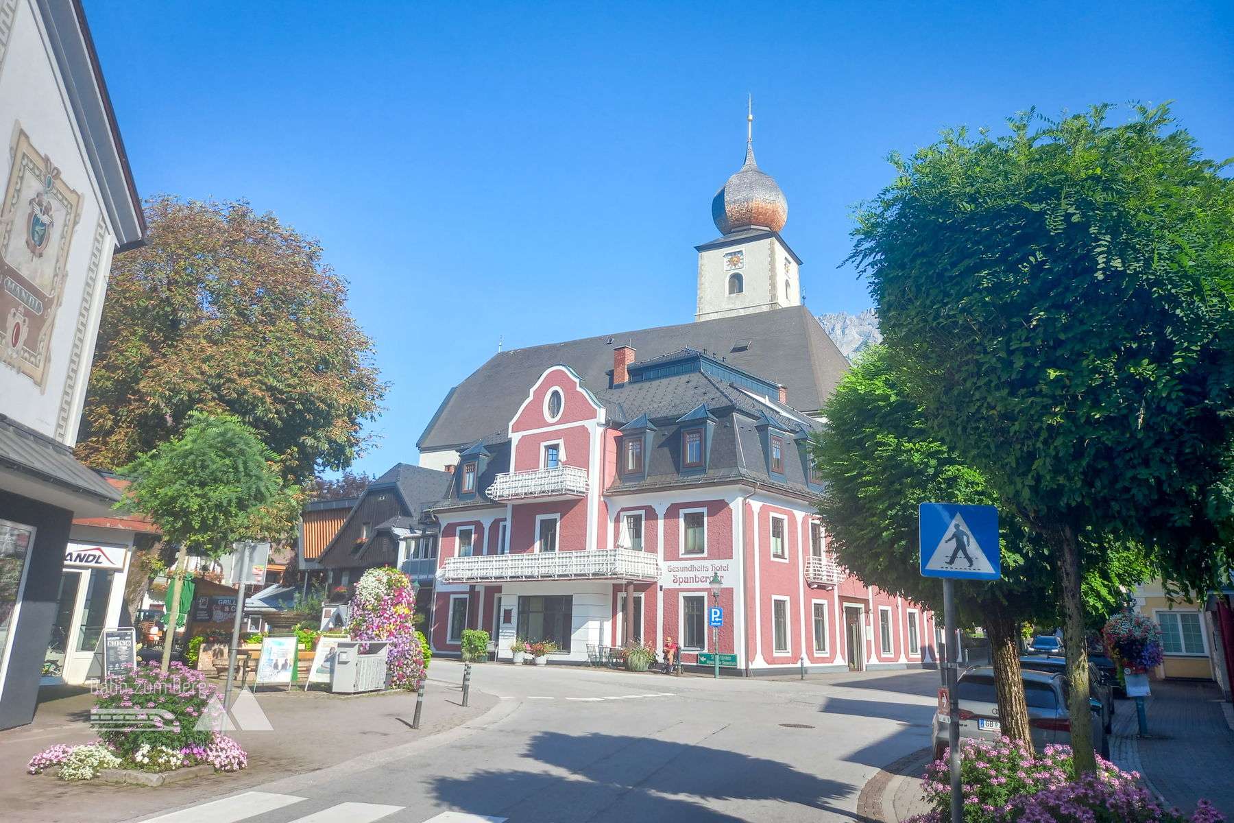 Ich starte meine Tour am Bahnhof von Gröbming. Dieser liegt etwas abseits vom Ort in Moosheim/Michaelerberg und ich strample zunächst vier Kilometer hinauf nach Gröbming. Vor der schmucken Kirche „Maria Himmelfahrt“ biege ich nach links ab. Ich folge der Stoderstraße und radle entlang des Gröbmingbaches bis nach Winkl, wo ich mich wieder links halte. Vorbei am Abenteuerpark Gröbming und der Mautstelle schraubt sich die Straße in vielen Kehren den Berg hinauf. Nach einer anfangs erfrischenden Fahrt im Schatten genieße ich ab der Ziplinekehre strahlenden Sonnenschein. Über die Rosemi Alm erreiche ich schließlich den letzten Parkplatz vor dem Berggasthof Steinerhaus. Hier finde ich schnell einen guten Abstellplatz für mein Rad und stärke mich erst einmal für den weiteren Aufstieg.