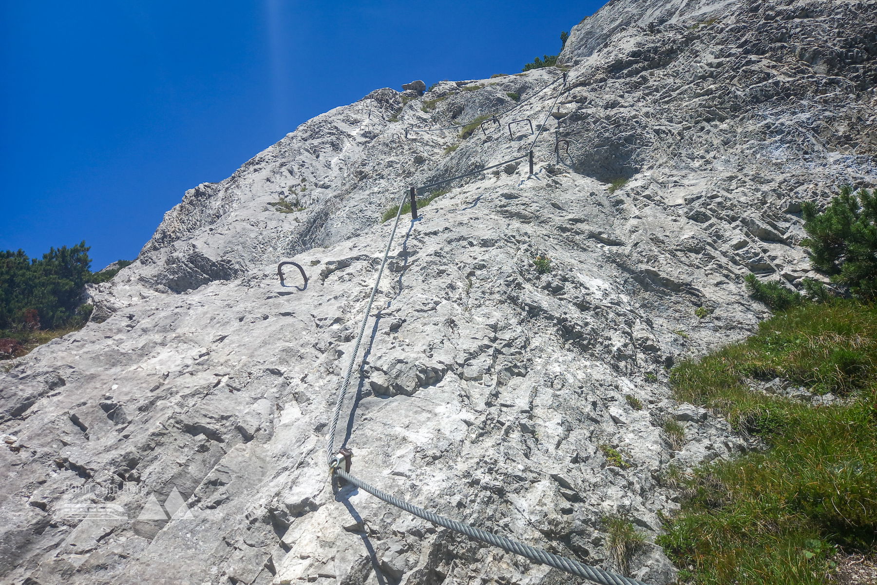 Gleich hinter dem Kircherl beginnt der Zustieg zum Klettersteigpark und zu den Klettersteigen Franz und Peter (Topo). Welcher es sein wird, entscheide ich nach der ersten langen Querung, denn bis dahin ist die Routenführung identisch. Beide Routen habe ich im Vorfeld ausgiebig studiert. Zuerst muss ich aber noch ein Stück absteigen. Kurz vor dem ersten Steilaufschwung, wo sich die Routen trennen, treffe ich auf zwei Kletterer, die an einer trittarmen A/B Stelle umgekehrt sind. Diese Stelle kann ich gut meistern, entscheide mich aber aus mehreren Gründen für den kürzeren Franz-Klettersteig. Der Aufstieg ist südseitig, es ist Mittag und ich habe immerhin schon 1.300 Höhenmeter Zustieg in den Beinen. Meine Entscheidung habe ich nicht bereut.