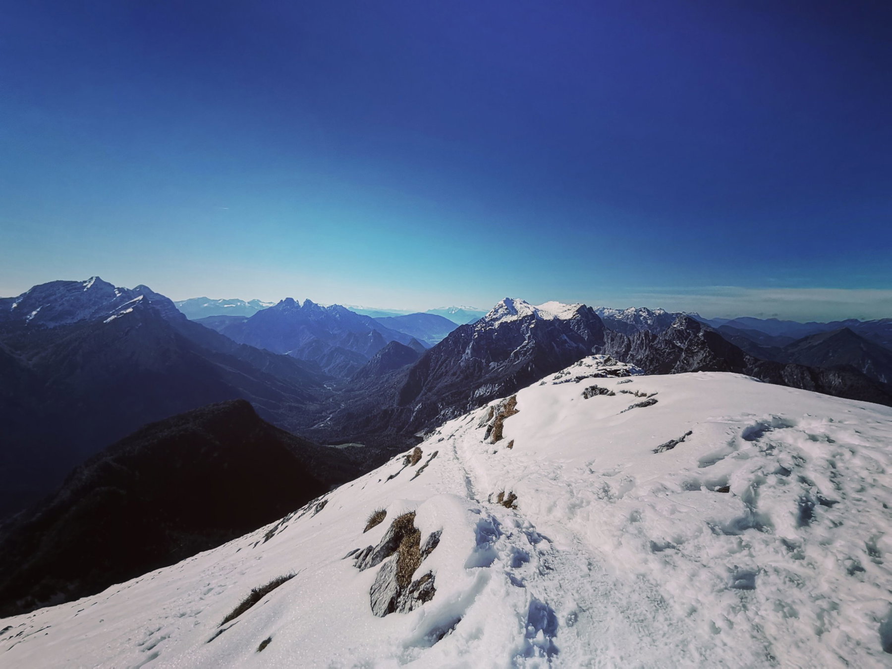 Oben am Gipfel grandiose Fernsicht in alle Richtungen. Heller Sonnenschein, dunkelgrüne Täler, schneebedeckte Gipfel – wie wunderschön!