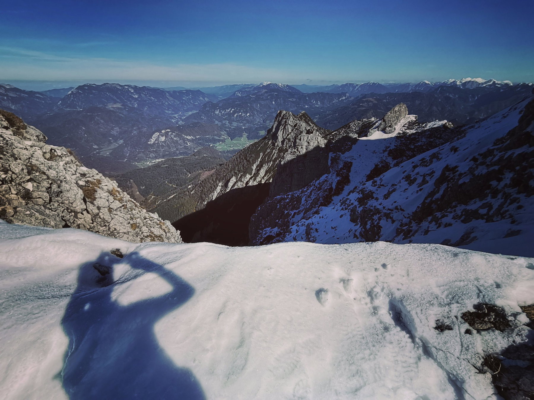 Nach einer kurzen Rast und Gipfelschau mach ich mich auf den Rückweg. Spätestens um 14.00 sollte ich das tun. Nachdem es knapp nach 13.30 ist, stehen die Chancen auf einen Belohnungsradler im Tal recht gut. Es gäbe die Möglichkeit vom Gipfel direkt zur Hochscheibenalm abzusteigen, aber der Weg ist extrem steil und nicht gespurt. Ich geh lieber zurück zur Ennstaler Hütte und bewundere die herrliche Gesäuse Landschaft.