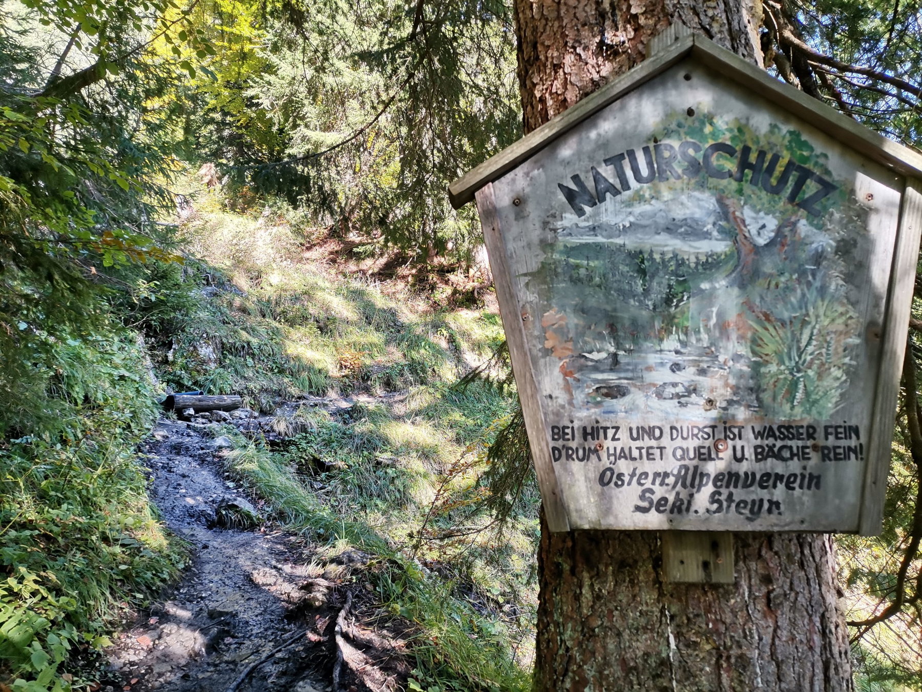 Zuerst führt ein Weg recht flach durch den Wald. Er mündet in eine Forststraße, die ich nun ein Weilchen hinauf wandere, vorbei am prachtvollen Gstatterbodenbauern. Die Abzweigung Richtung Kroisnalm und Hochscheibenalm lasse ich rechts liegen. Und erreiche die erste Quelle. Das Kropfbründl. Hier kann man den Wasservorrat auffüllen.