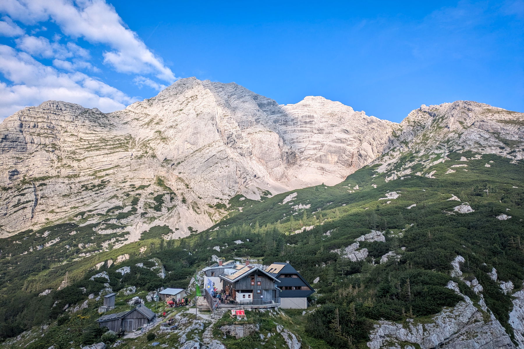 Richtig “durchschnaufen” kann man erst bei der Hesshütte. Dafür kann man es sich dann gleich so richtig gut gehen lassen auf der Sonnenterrasse der traditionsreichen Hütte. Will man die Aufenthaltsdauer im Gesäuse maximieren, ist eine Übernachtung auf der Hesshütte empfehlenswert. Wer schneller wieder im Tal sein will bzw. muss, kann auch den direkten Abstieg nach Johnsbach wählen, der hier beschrieben ist.