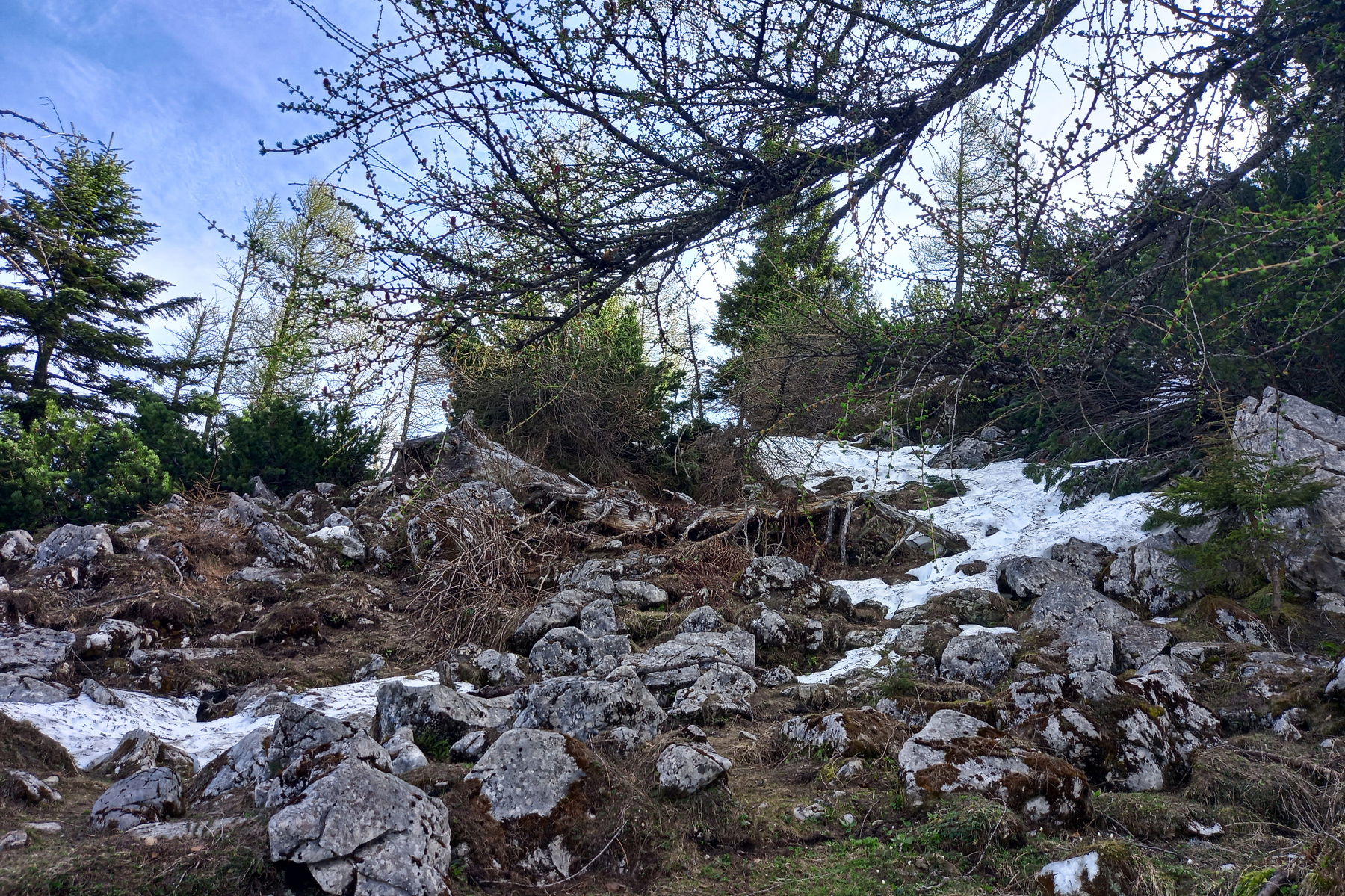 Die Route erfordert nun ein gewisses Maß an Orientierungssinn, da es keine markierten Wege gibt und auch einige Schneefelder die Wegfindung erschwerten. Trotzdem oder gerade deshalb fand ich diesen Teil der Wanderung besonders reizvoll und auch ein wenig abenteuerlich. Schließlich bin ich auch nicht auf dem Karleck, sondern auf einem namenlosen Vorgipfel gelandet.