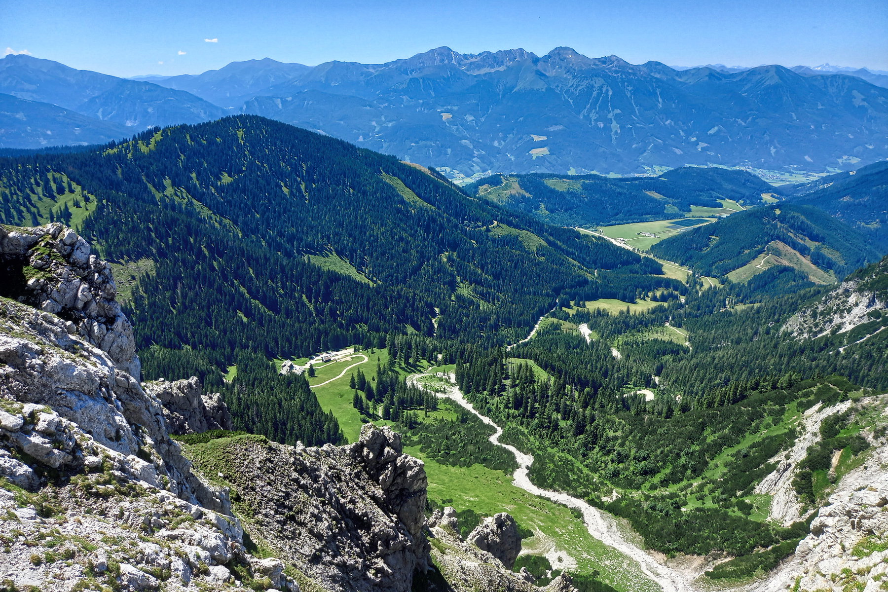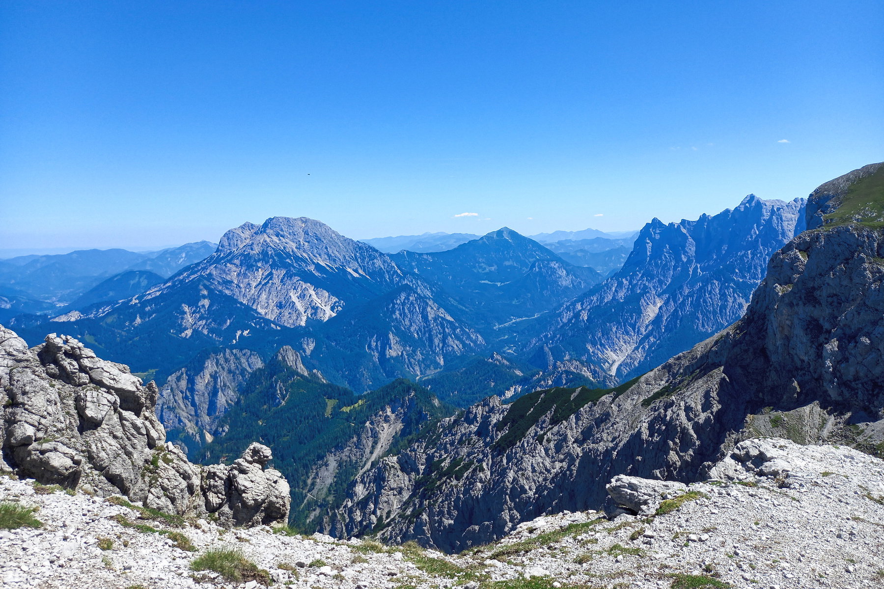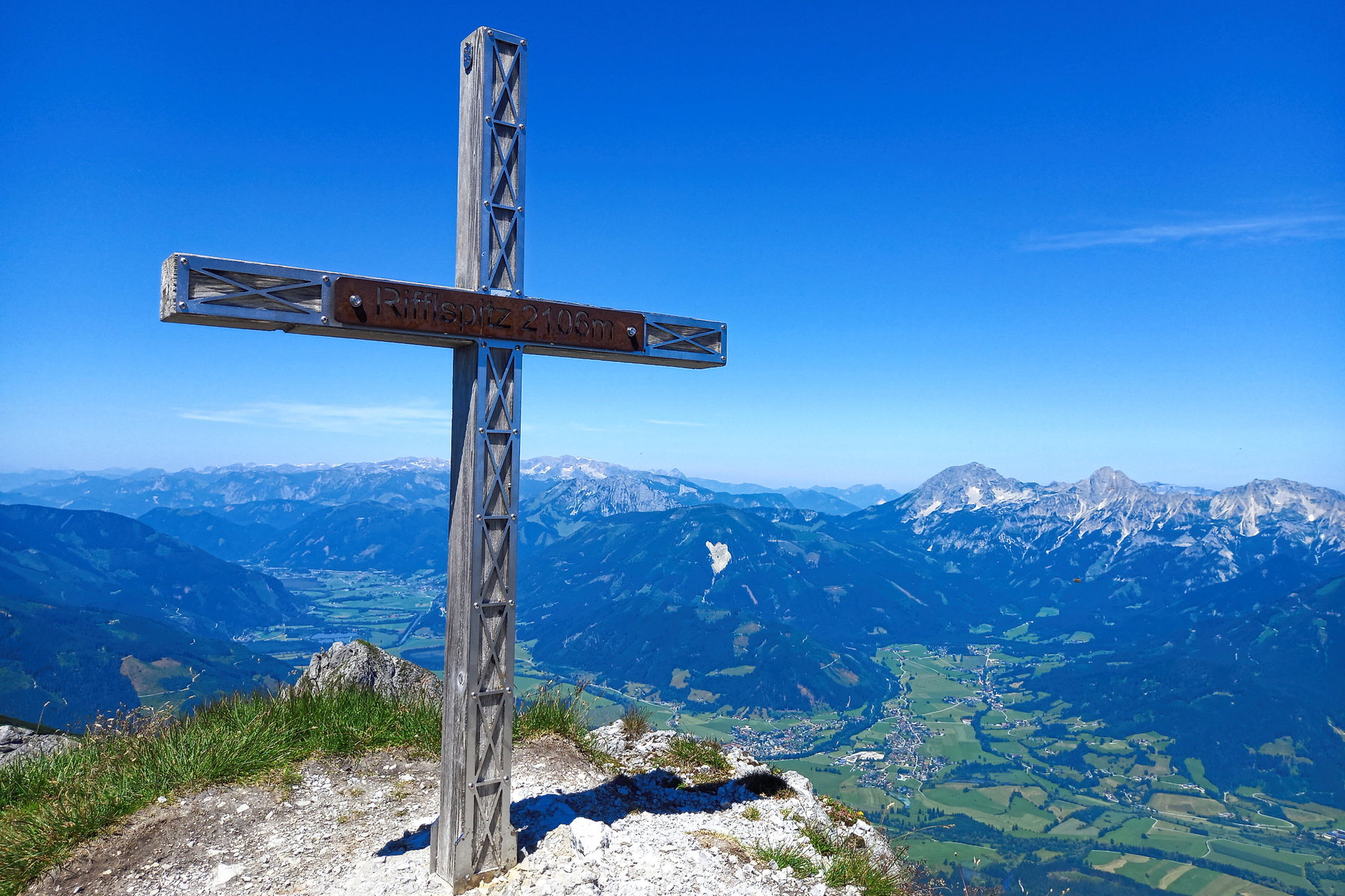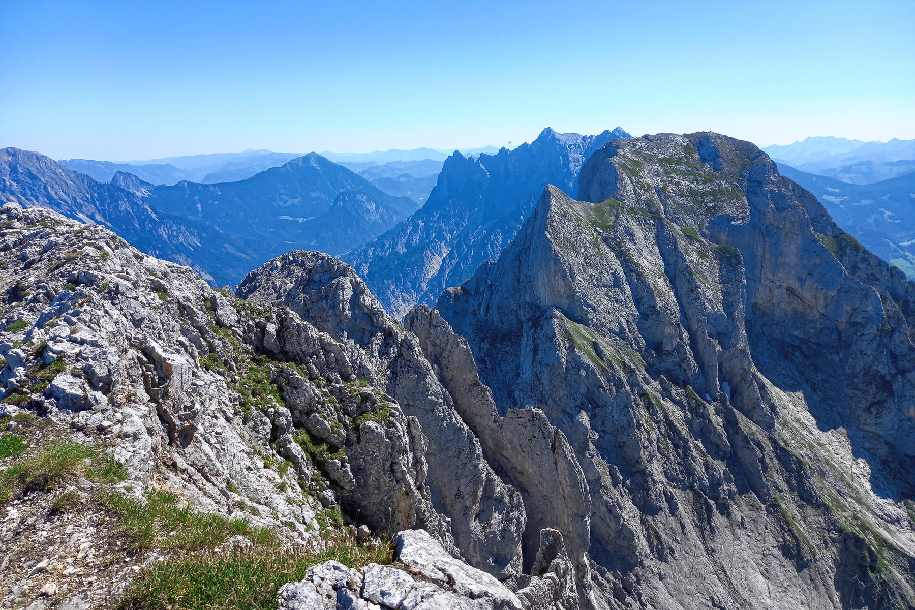 Schon beim Aufstieg auf den Kaibling ist die Aussicht atemberaubend – ich sehe den Dachstein, davor den Grimming. Und auch mein letztes Ziel – die Rifflspitze.