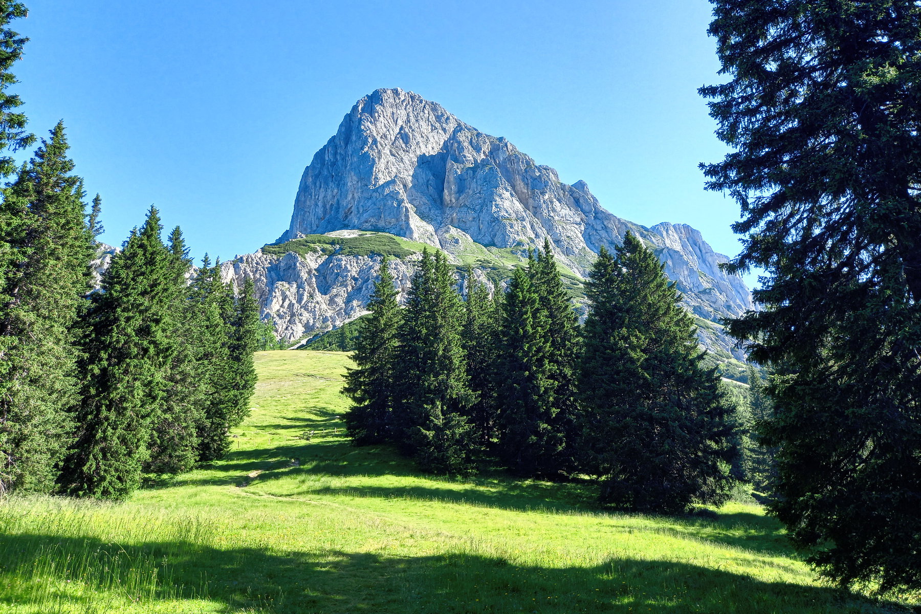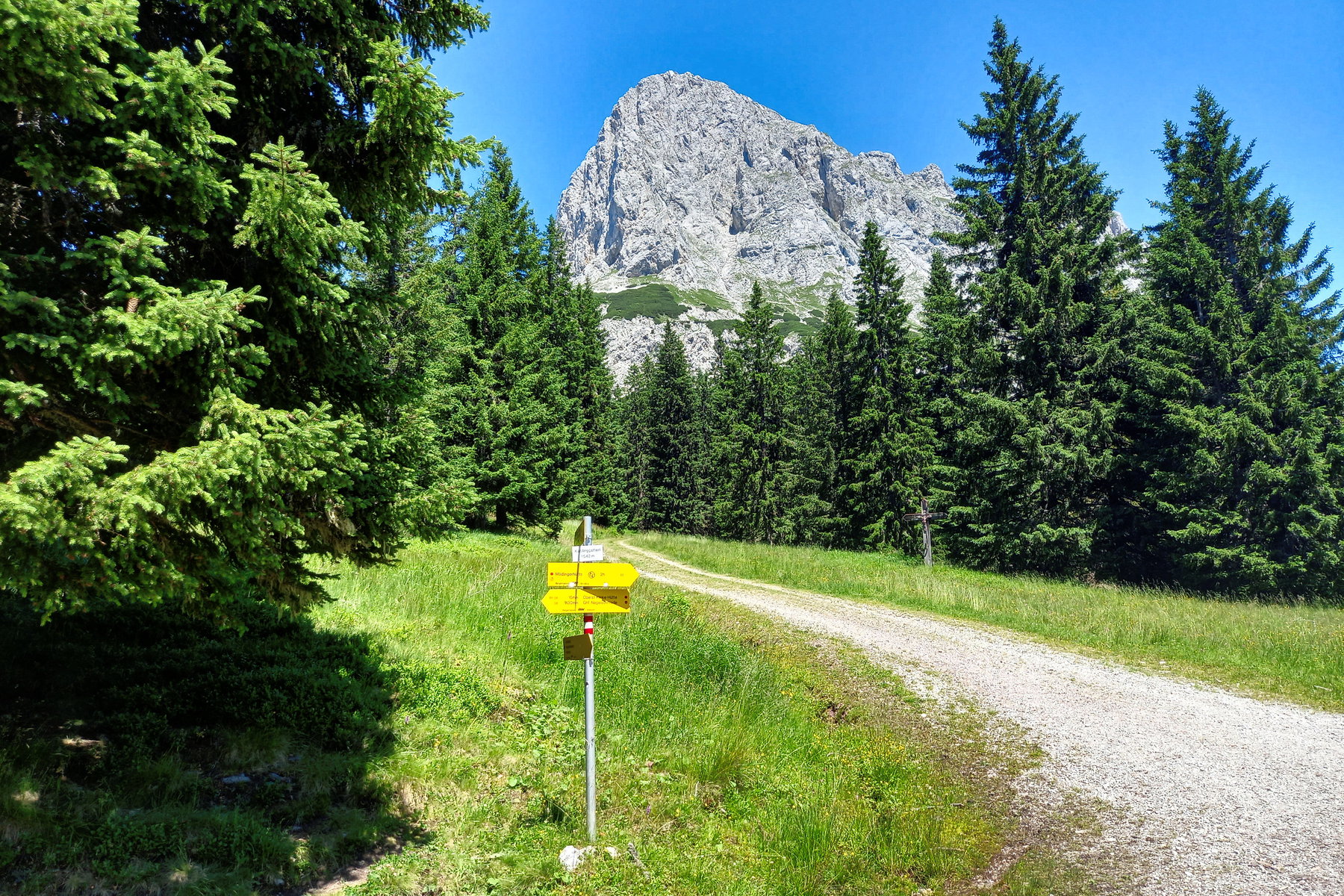 Zuerst wandere ich über eine Wiese, dann durch einen Latschengürtel zum Fuß der imposanten Südwand. Im Uhrzeigersinn führt der Weg unterhalb der Wand bis zu einer Weggabelung. Hier entscheide ich mich, die Gipfel in der Reihenfolge Kaibling, Sparafeld und Riffl zu besteigen. Umgekehrt ginge es auch. Die Gipfel liegen auf einem Plateau und lassen sich ohne großen Höhenverlust gut kombinieren.