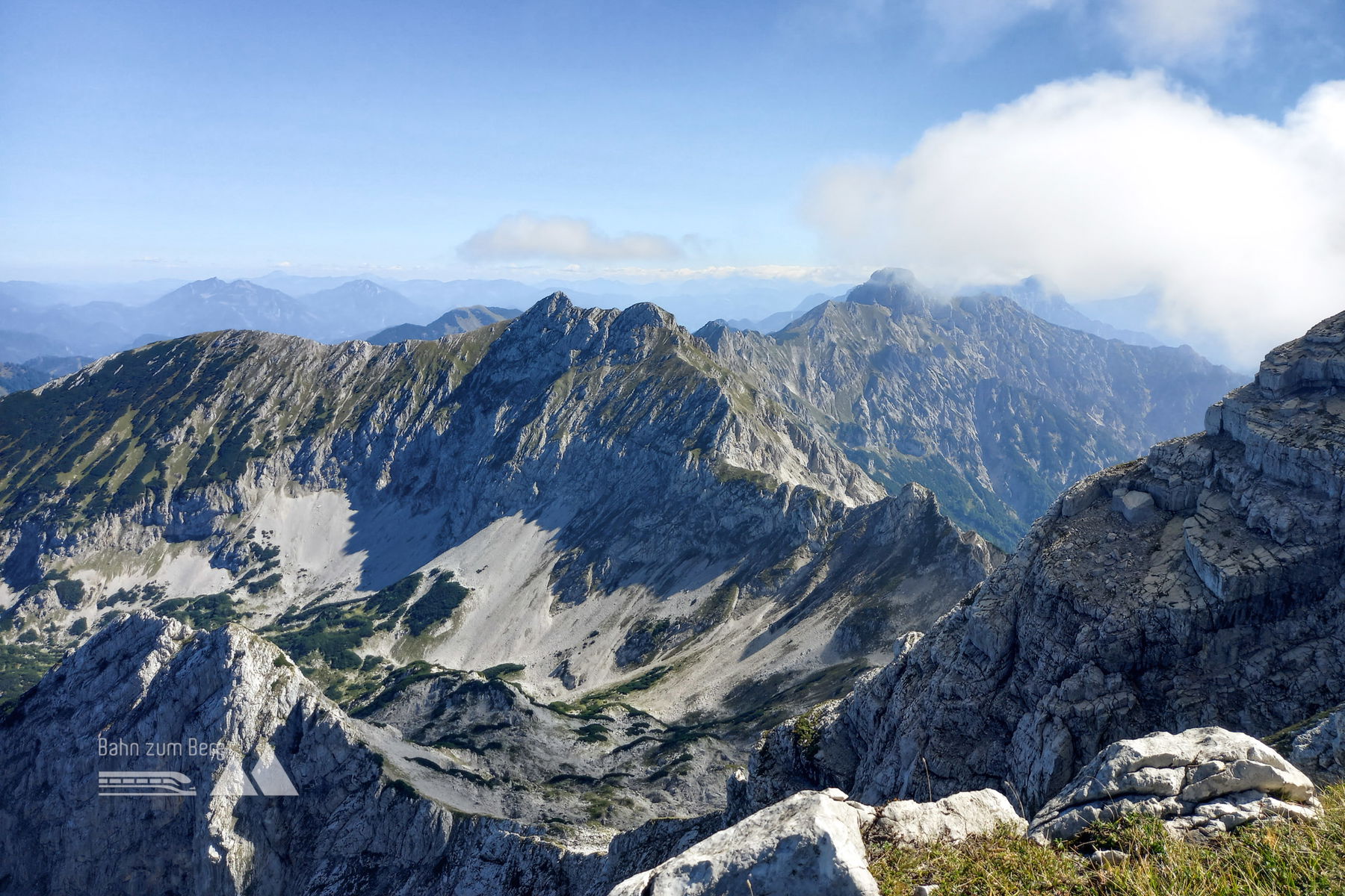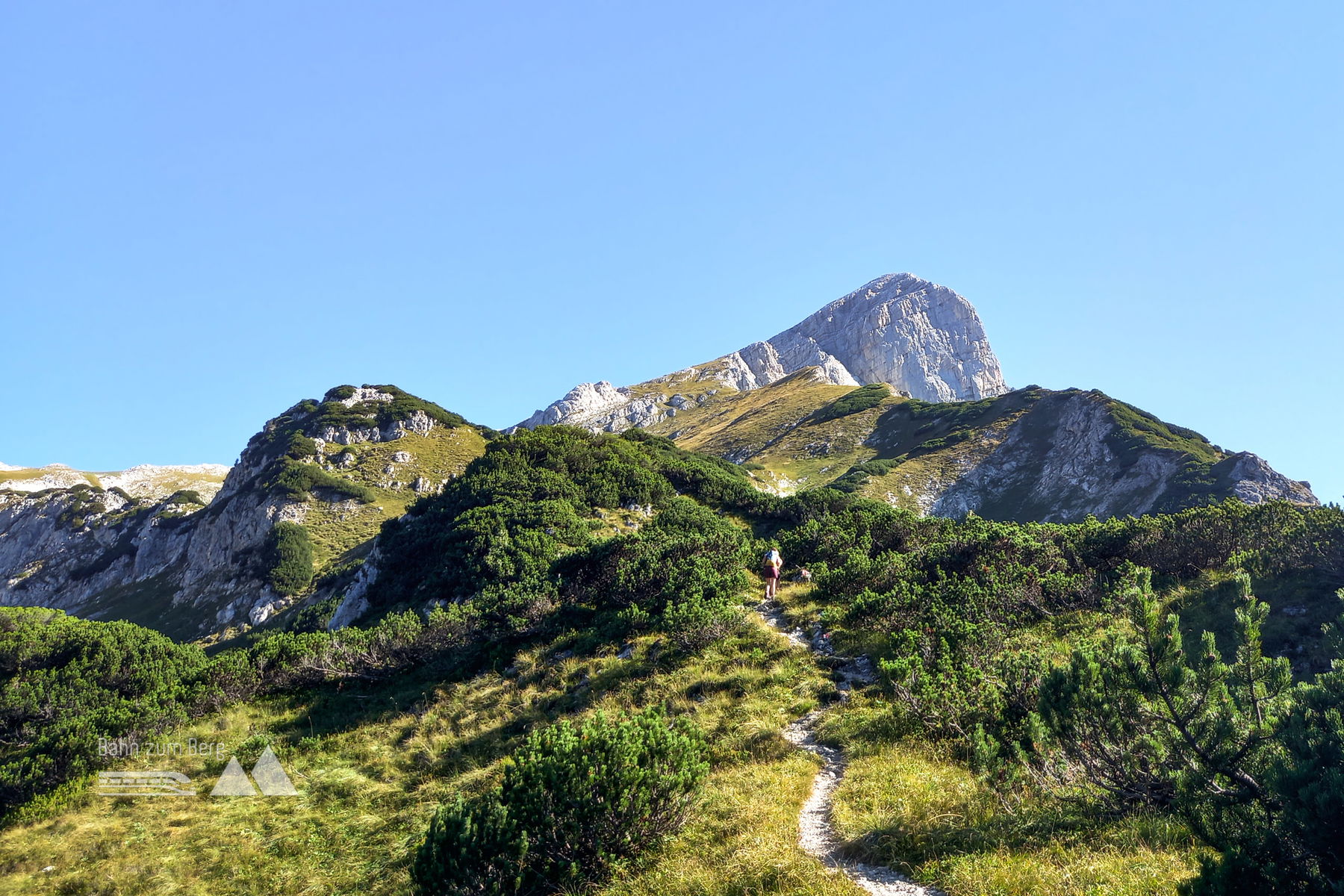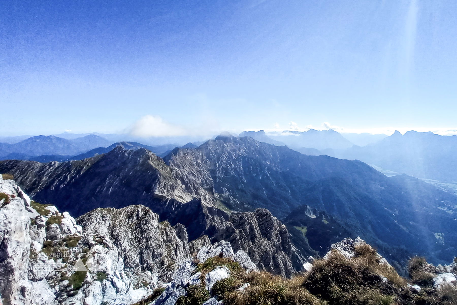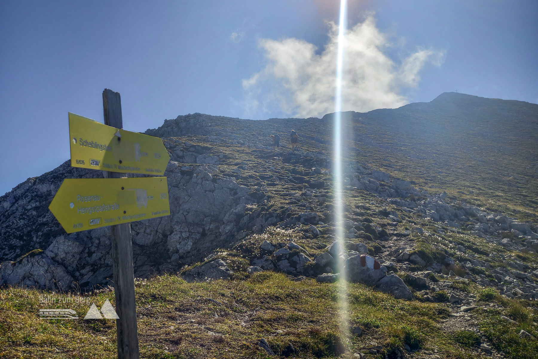 Durch Latschenfelder wandere ich nun der Markierung folgend weiter bergauf und erreiche schließlich über die sogenannte Lange Gasse (eine Art Rinne) einen Sattel. Ich halte mich rechts und steige über einen steilen, leicht ausgesetzten Grat die letzten Höhenmeter zum Gipfel auf.
