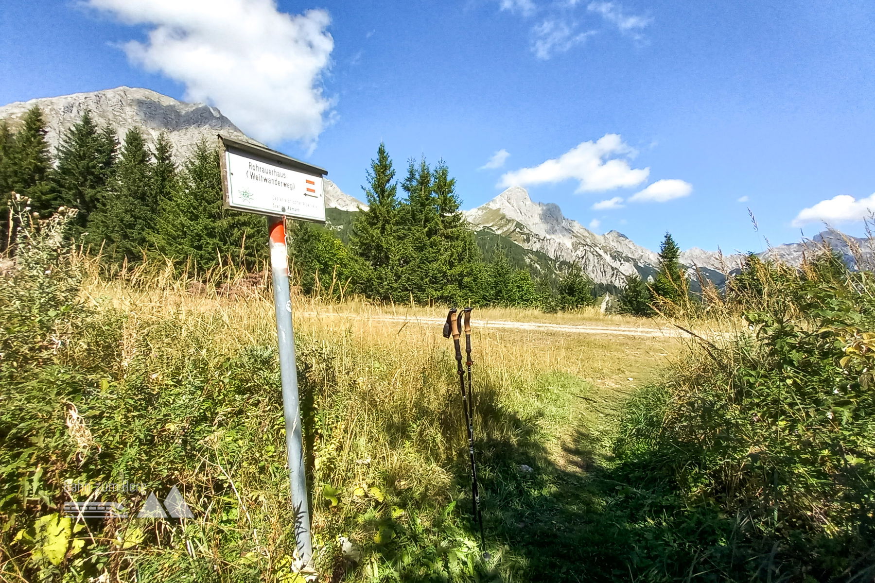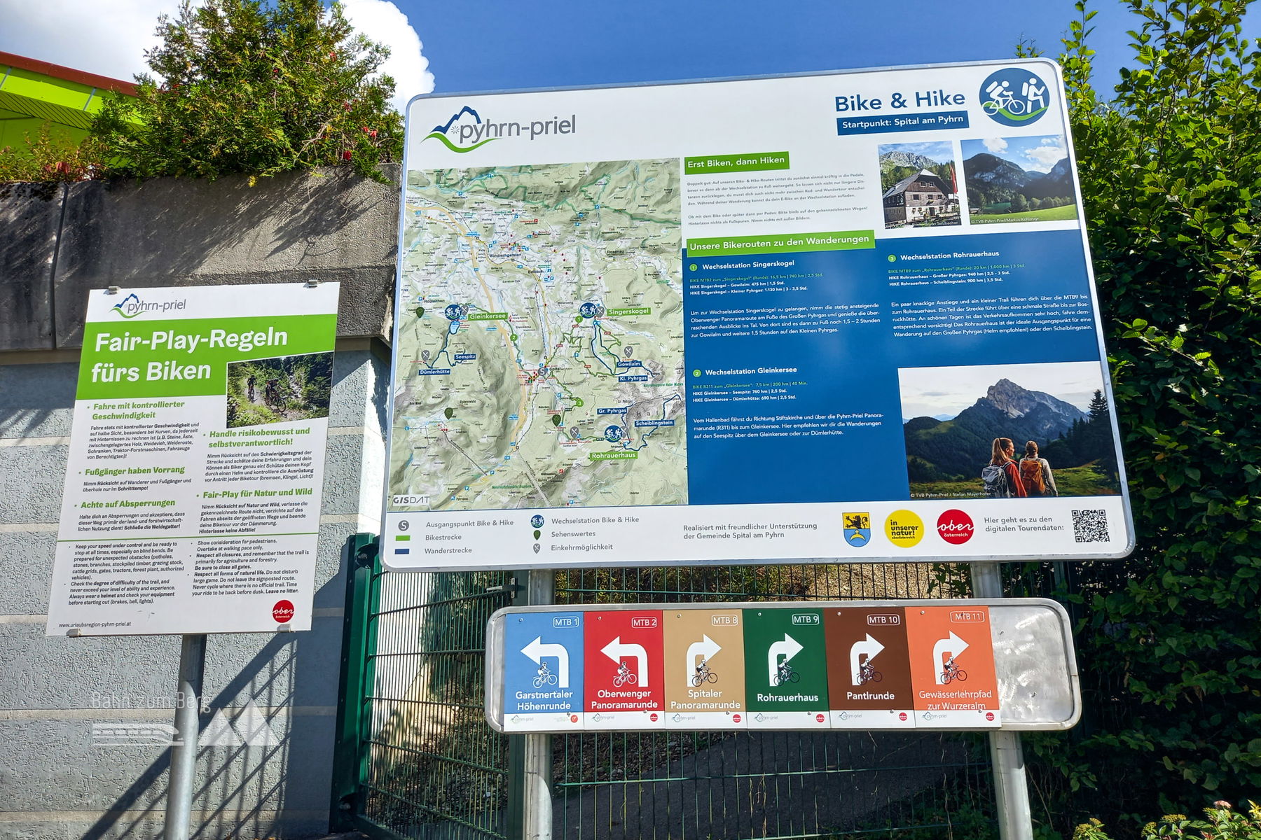 Mit dem Rad geht es zunächst zum Hallenbad, wo die offizielle Mountainbikestrecke zum Rohrauerhaus beginnt. Ich folge der Beschilderung MTB9 und radle über Grünau bergwärts.