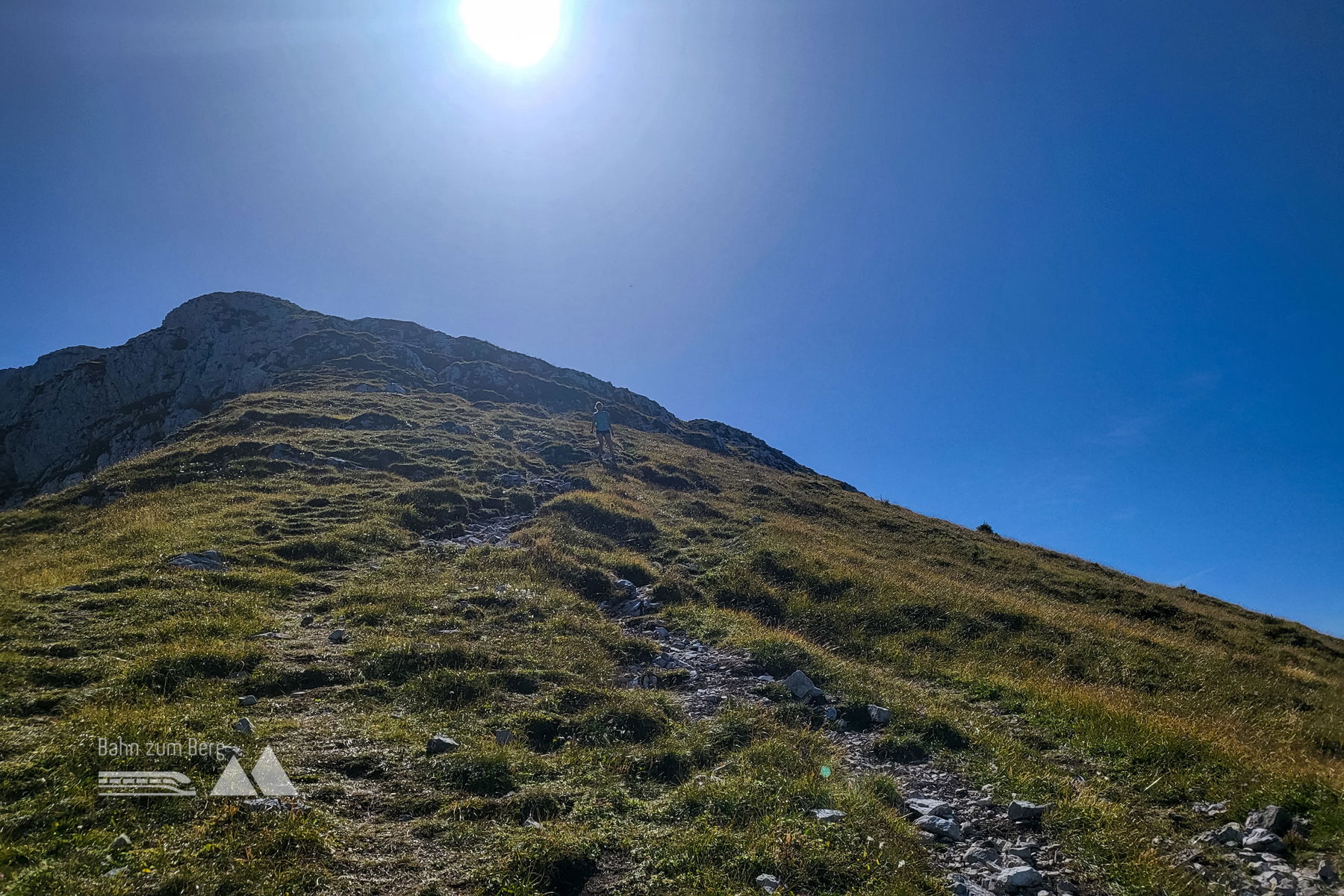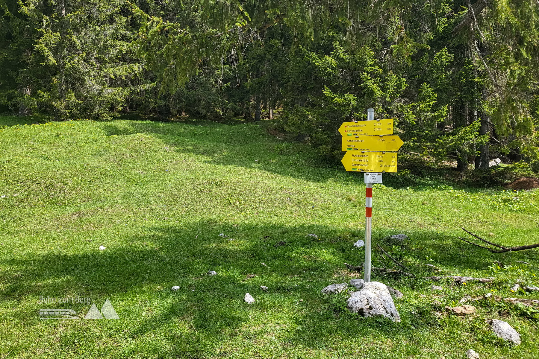 Nach rund zwei Stunden kommen wir auf der Hochscheibenalm an. Dort machen wir eine Trinkpause. Danach geht es für uns weiter Richtung Gipfel. Das erste Stück verläuft durch den Wald. Hier muss man den Weg ein bisschen suchen. Sobald man den Weg einmal gefunden hat, sollte es einfach sein, ihm zu folgen.