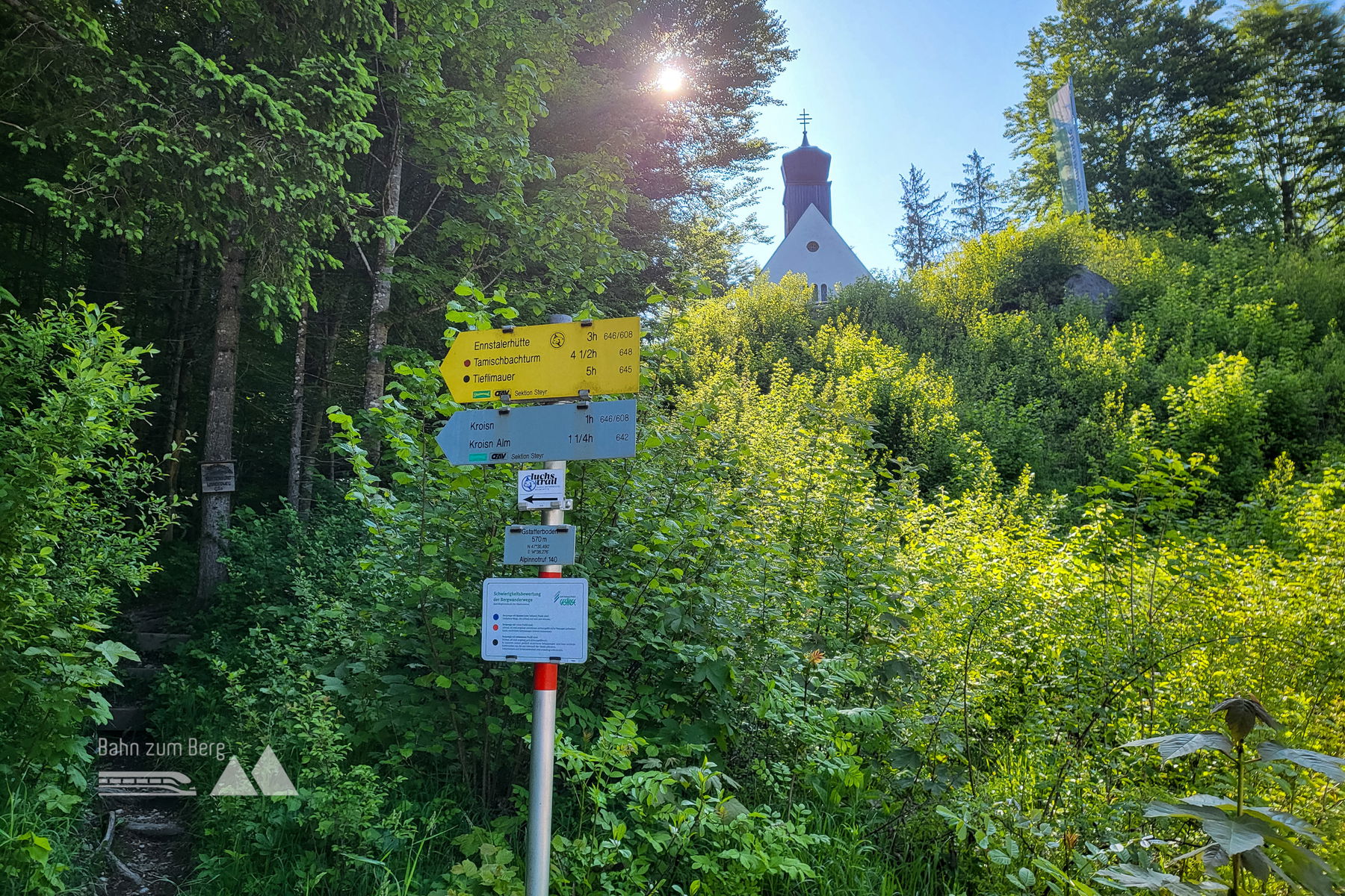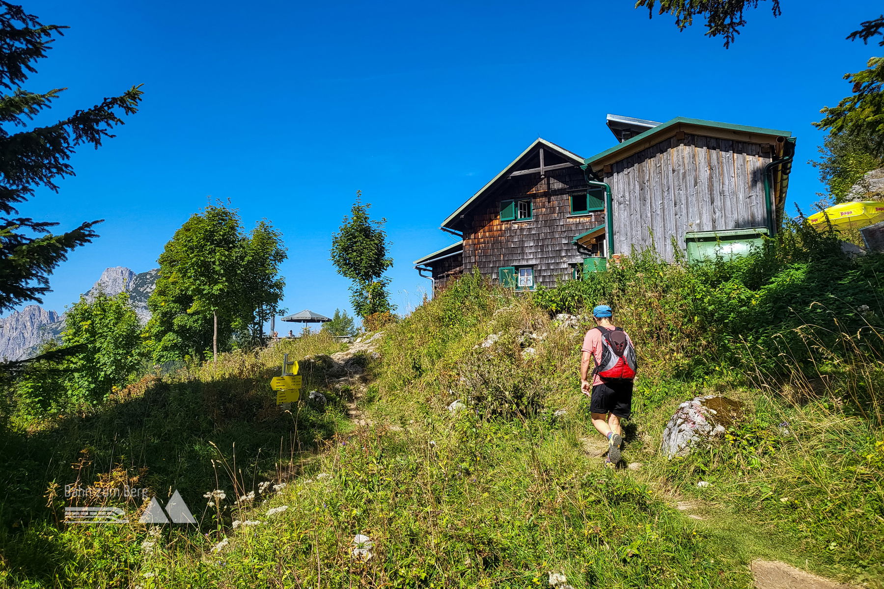 Bei der Ennstaler Hütte bleiben wir länger sitzen und lassen uns von den Hüttenleuten mit Kaltgetränken und köstlichem Essen versorgen. Somit sind wir gut gestärkt für den Rest des Abstiegs nach Gstatterboden. Der Weg ist stets gut markiert. Ein paar Mal queren wir wieder die Forststraße. Am Ende kommen wir noch an einer netten kleinen Kapelle vorbei.