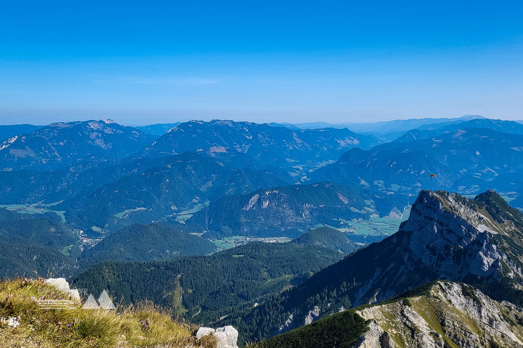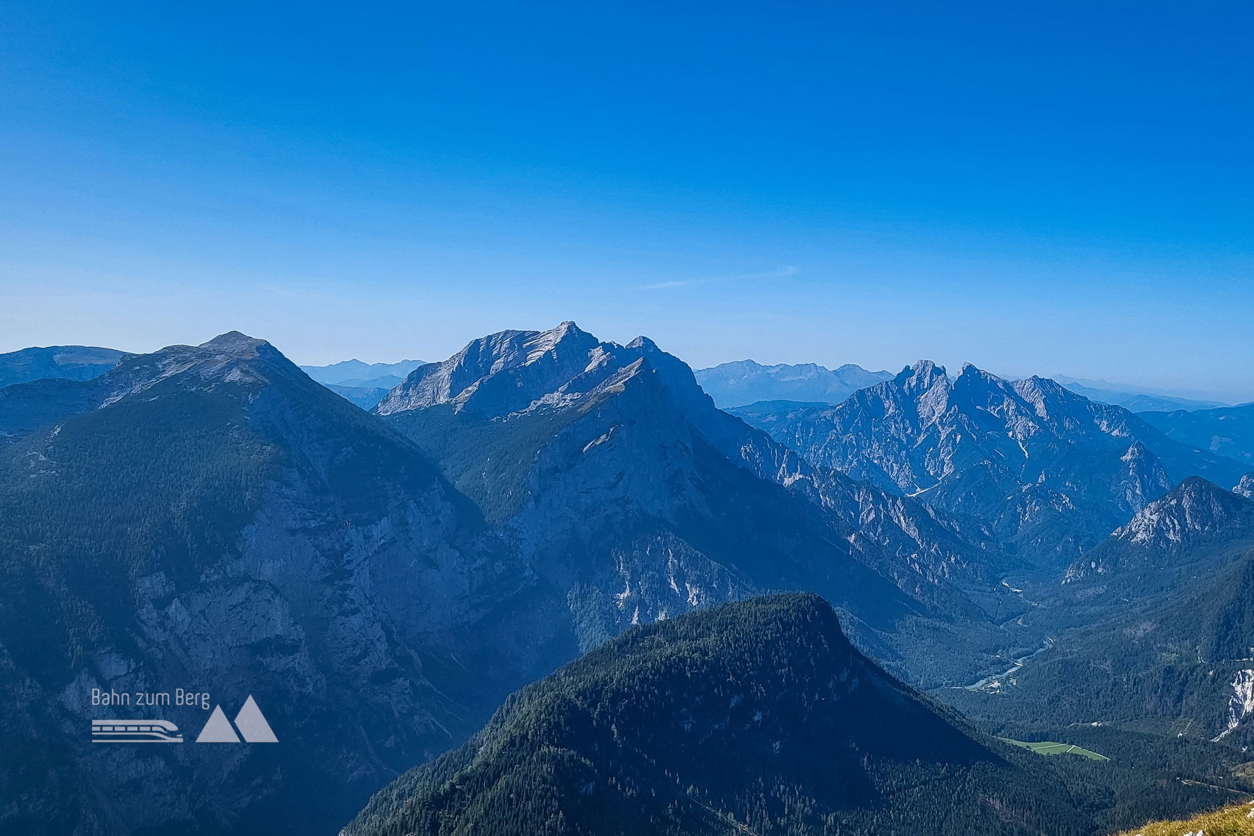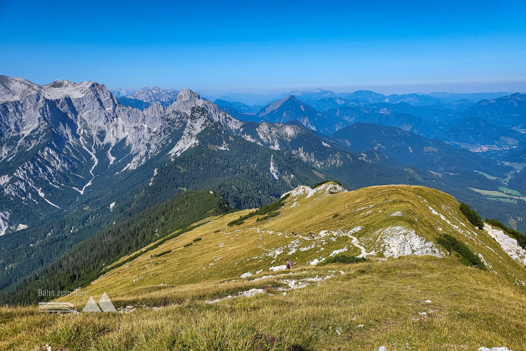 Nach dem Wald kommt man in einen Latschenbereich. Im Bereich unter dem Gipfel wird die Vegetation dann noch spärlicher, die Aussicht dafür immer besser. Vom Gipfel aus sieht man dann erstmals auch auf die andere Seite hinunter, Richtung Reifling, Landl, Sankt Gallen und noch weit darüber hinaus.