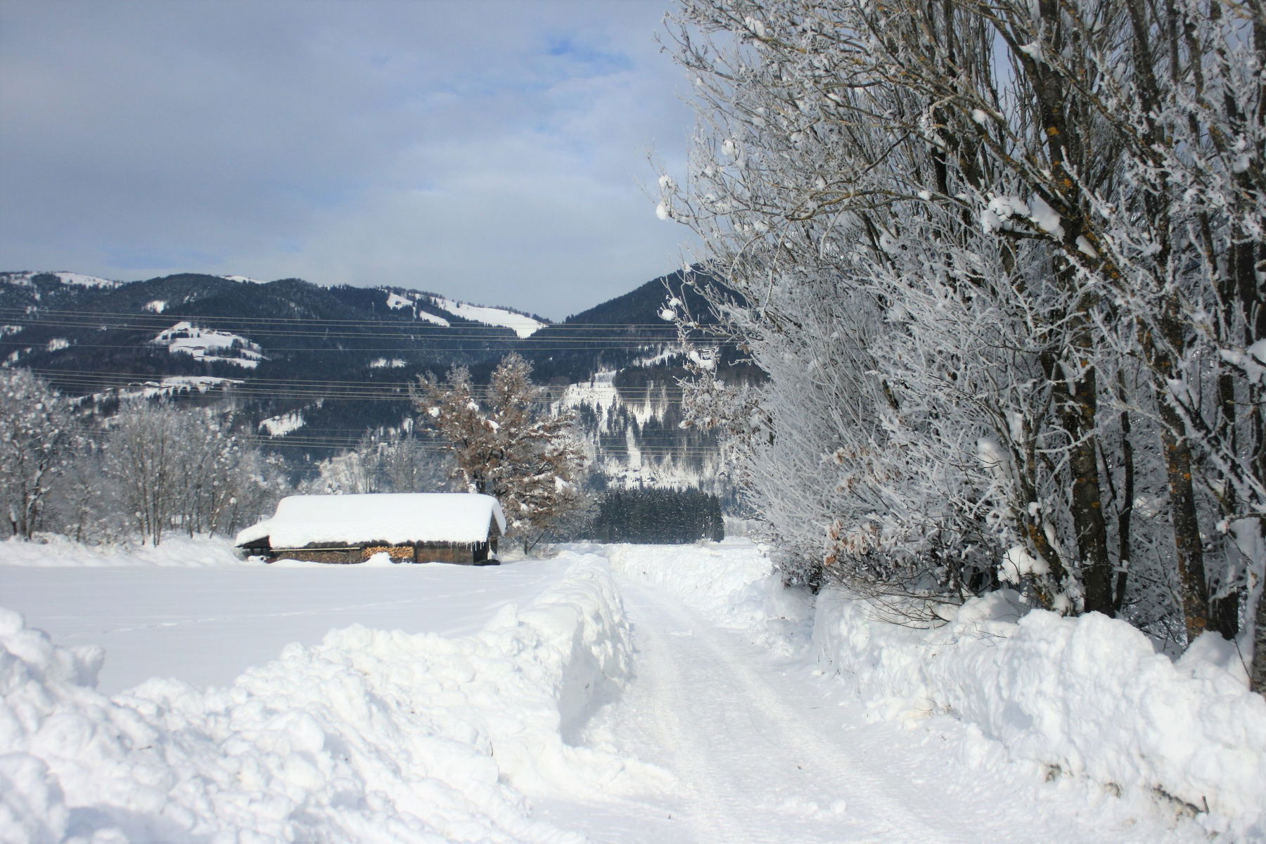 Es ist klirrend kalt, – 18 Grad Celsius in der Früh. Aber die Sonne scheint und mit der gleichmäßigen Bewegung wird mir bald warm.