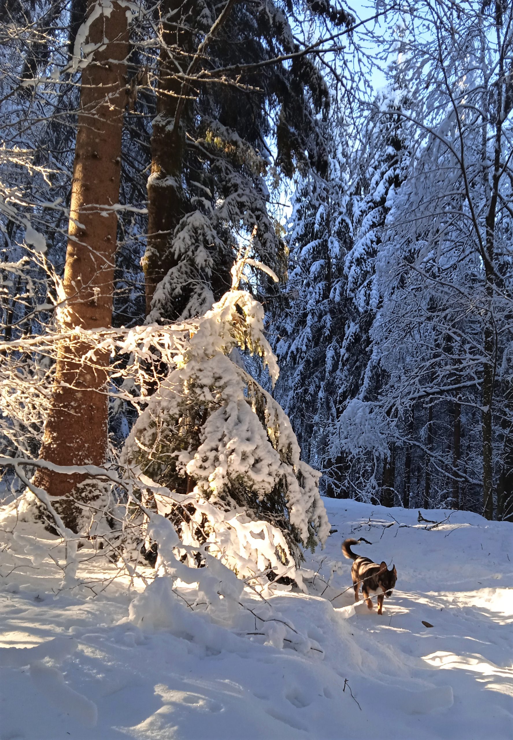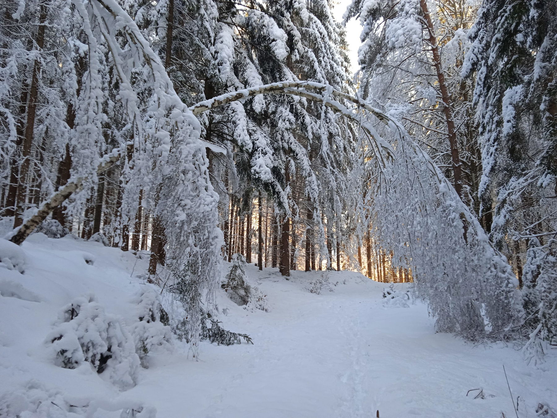 Die Strecke führt durch den Winterwald, die Sonne scheint zwischen den Bäumen durch und die Luft ist eisig kalt.