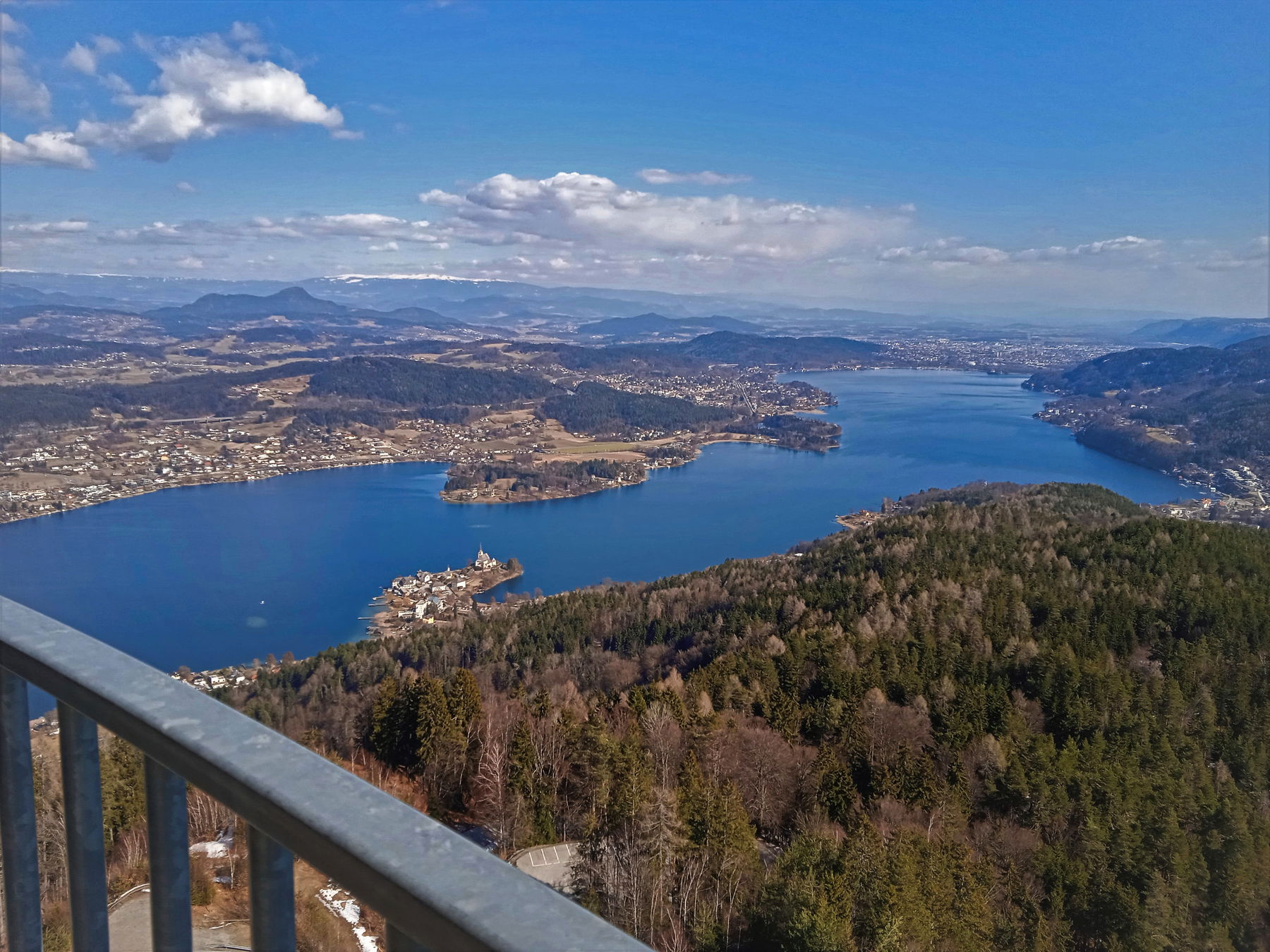 Der Aussichtsturm auf dem Pyramidenkogel ist eines der bekanntesten Ausflugsziele in Kärnten. Hier ist der Wörthersee zu sehen, der Blick geht weiter bis zur Saualpe, und auf der anderen Seite ins Seental, Rosental, zu den Karawanken und den Nockbergen.