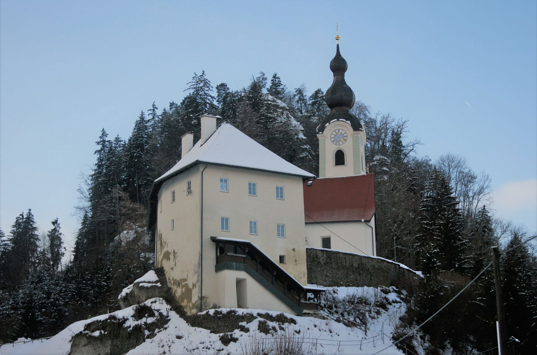 Mich fasziniert der Anblick immer wieder, wie die Kirche auf einem Ausläufer des Sattnitz steht. Sie erinnert an eine mittelalterliche Burganlage. Tatsächlich befindet sich auf einer Anhöhe hinter der Kirche die Ruine der ehemaligen Burg.