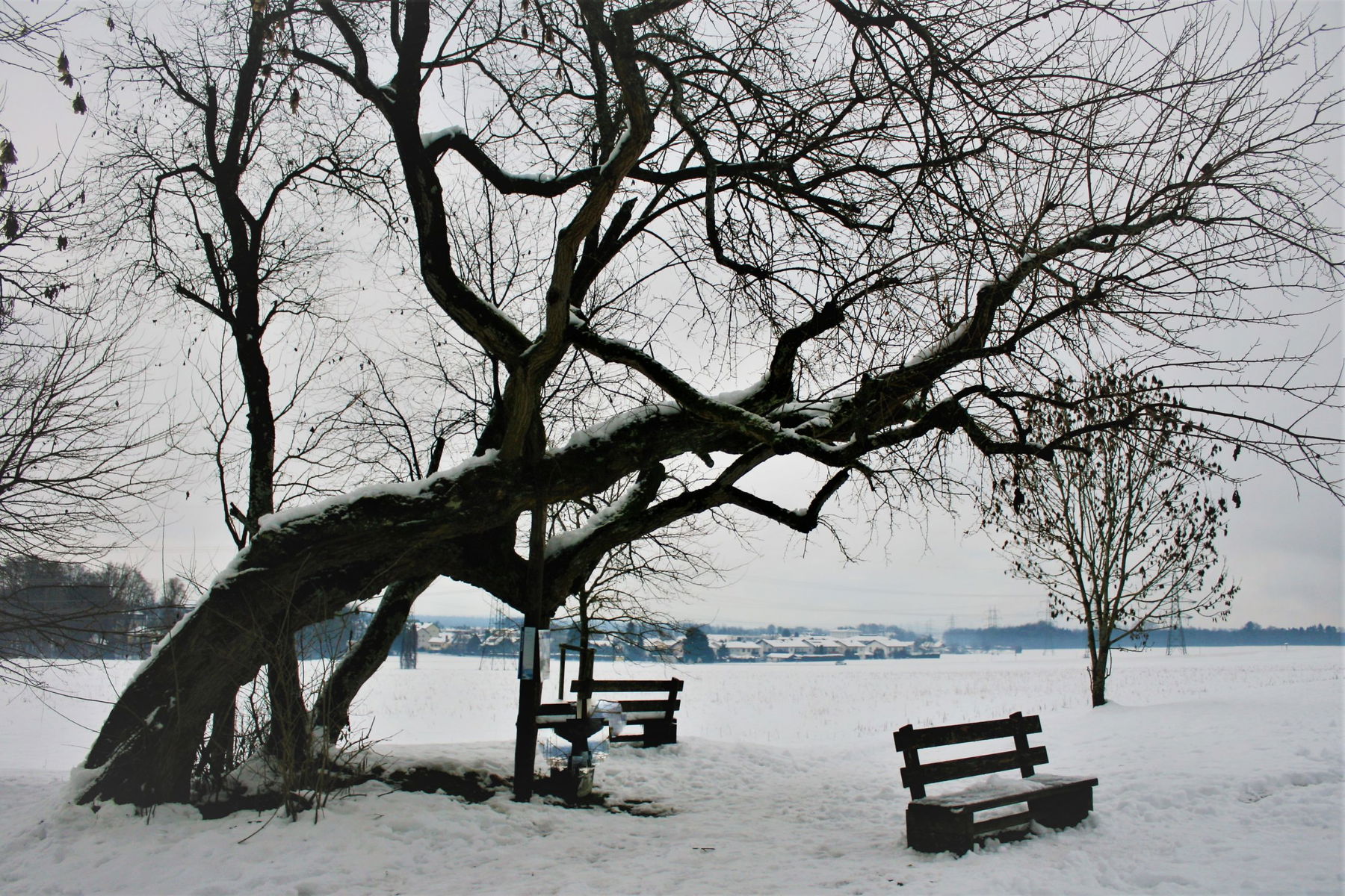 Der Weg führt ab jetzt bergab bis zu einem Feld, dort geht es immer am Waldrand entlang. Bei einem Bildstock wird die Straße überquert, danach geht es gleich auf dem Feldweg weiter. Am Ende des Weges trifft man auf das Naturdenkmal Maulbeerbäume, ein Überbleibsel der Seidenraupenzucht in Kärnten.