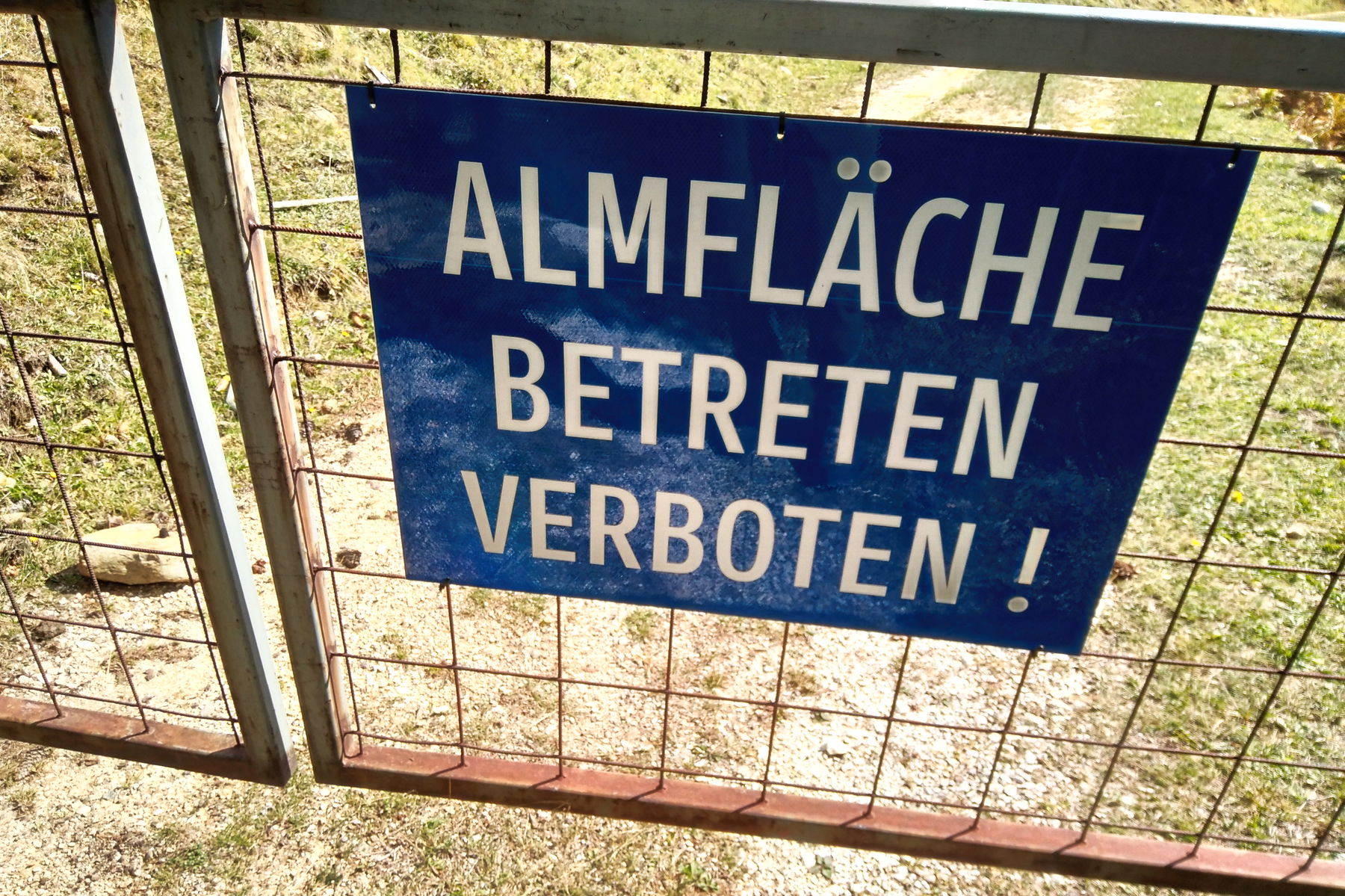 Schließlich mündet von links der Wandsteig in den Forstweg ein. Auf der Zauchenalm verliert sich die Markierung, anscheinend will man die Wanderer von der Alm fernhalten.