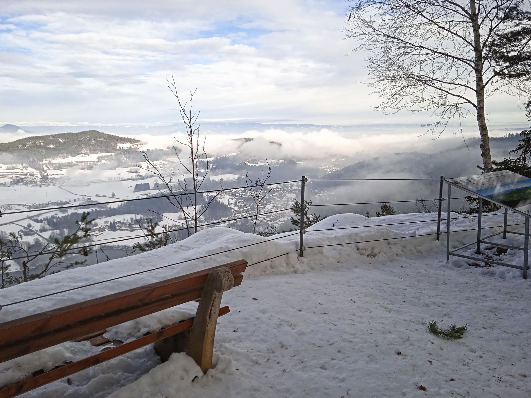 Um dem hartnäckigen Klagenfurter Nebel zu entgehen, mache ich eine kleine Wanderung in der Nähe auf dem Plöschenberg. Der 6 km lange Naturlehrpfad Zwergohreule führt in einer Runde um den Plöschenberg, vorbei an Gasthäusern und Buschenschenken.