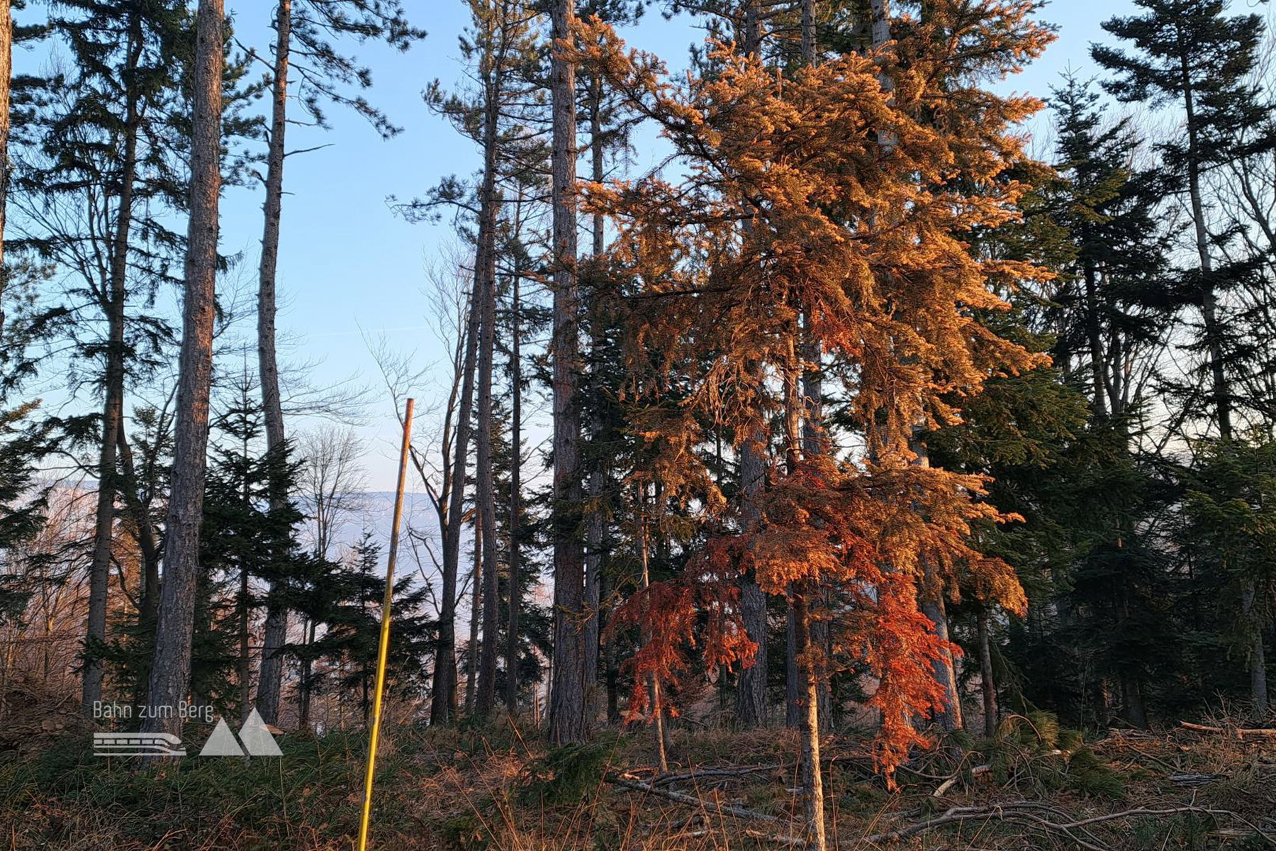 Den Sattel von Netting querend gehen wir die rote Markierung weiter. Ein optionaler Abstecher links zum Aussichtsplatz Dachenstein (443 Meter) wäre zwar nett, der Zutritt ist aber verboten. Zum „Gipfel“ des Blosenberg (484 Meter) führt kein Weg, gute Orientierer können’s zusätzlich zu dieser Route wagen.