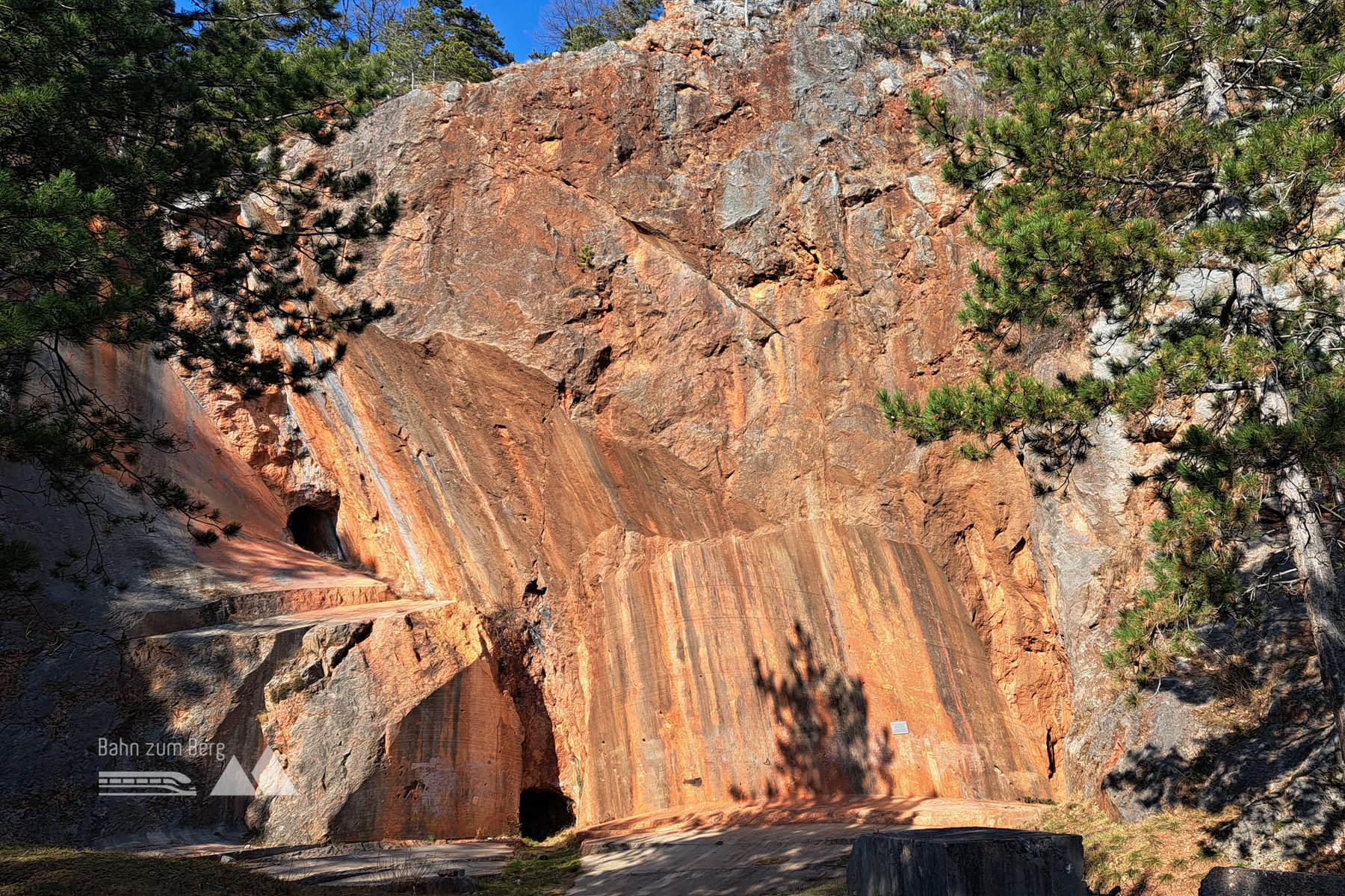 Dort kann man den roten glatten Fels und die Reste früherer Abbautechnik oder späterer Kunstwerke bewundern, sich in Schautafeln über die Geschichte dieses Steinbruchs informieren oder einfach mit Blick über das südliche Wiener Becken rasten. Der Marmor ziert übrigens u.a. den Stephansdom, früher auch den Südbahnhof.