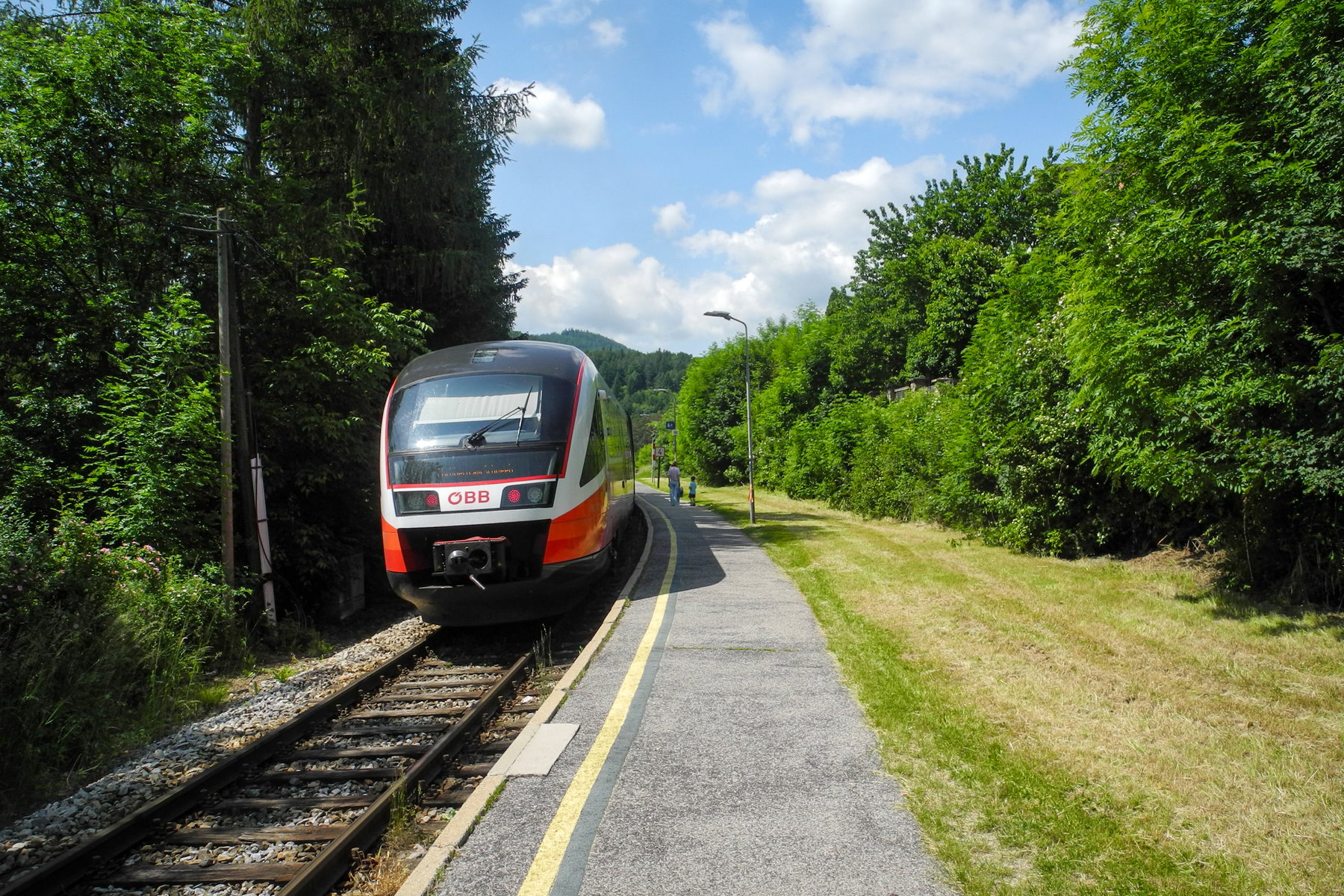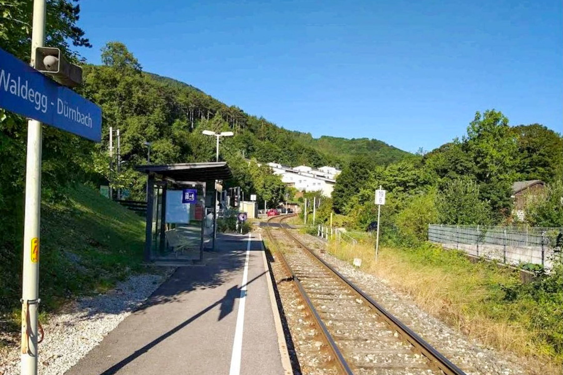 Die restlichen zwei Kilometer bis zum Bahnhof führen leider nur noch über die Straße, die aber zumindest großteils im Schatten liegt und immer leicht bergab führt. Nach einer knappen halben Stunde zweige ich nach dem Friedhof links ab und lande direkt bei der Haltestelle Waldegg-Dürnbach.  Ich habe Glück, dass der Zug, der nur stündlich fährt, bald kommt, denn eine Einkehrmöglichkeit, um die Wartezeit zu überbrücken, gibt es hier leider nicht.