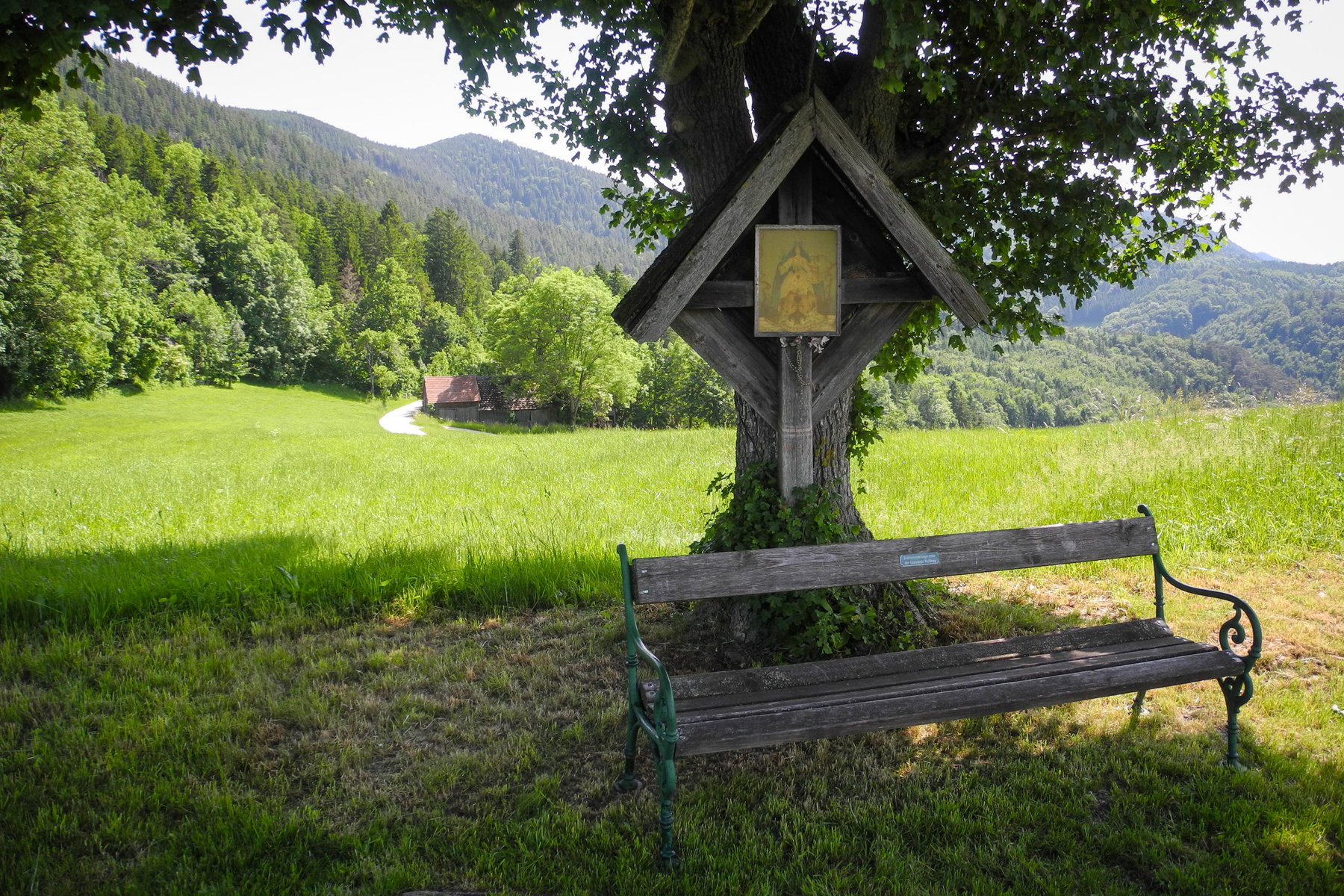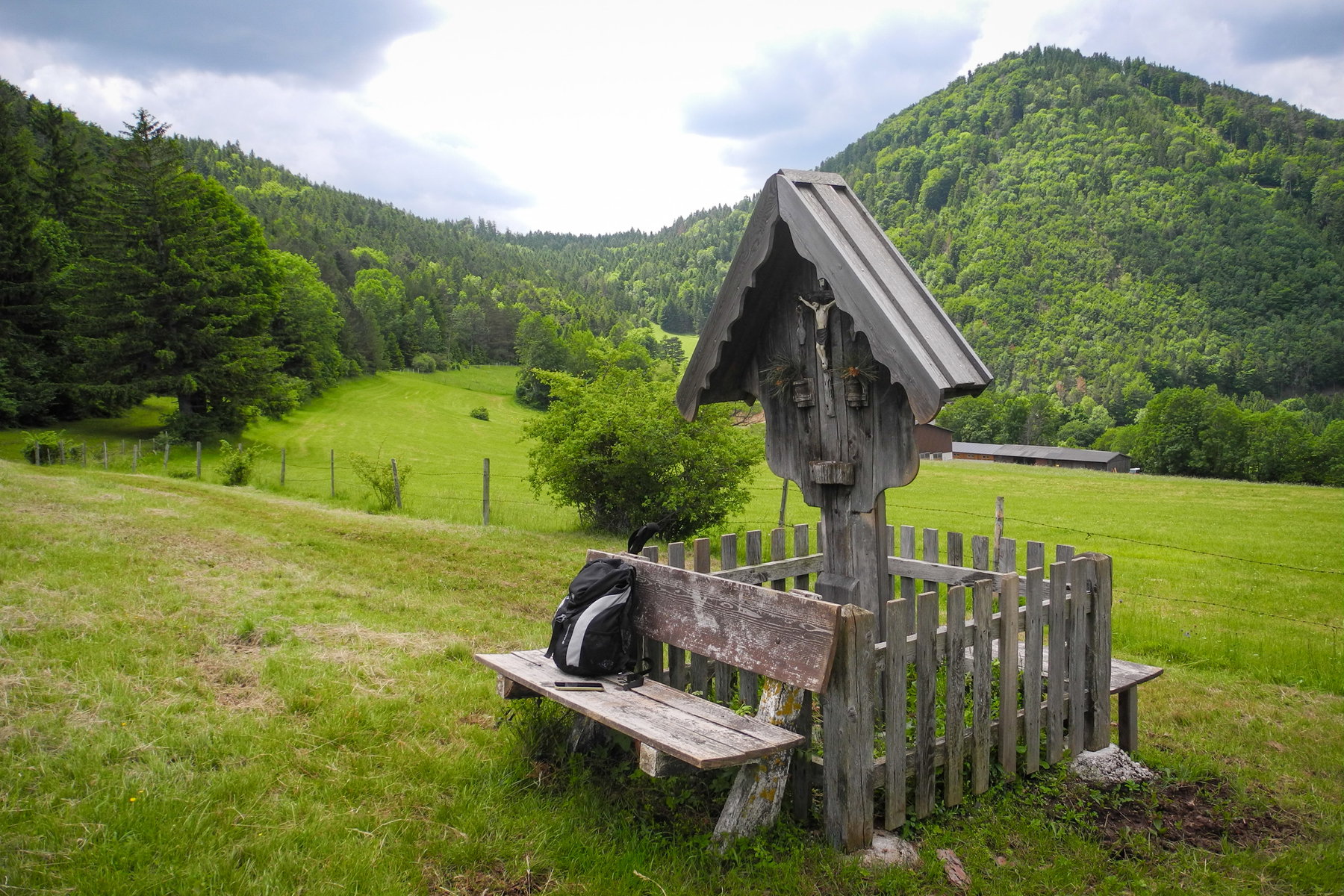 Der Weg ist offenbar sehr wenig begangen aber doch noch so weit erkennbar, dass ich schon bald den Weiler Lanzing erreiche und auf einer kleinen Straße durchqueren kann. Am Waldrand zweigt ein Wanderweg (beschildert mit „Scheimhütte“) rechts ab, dem ich bis auf die nächste Anhöhe folge. Dort lädt mich eine Sitzbank vor dem Kreuz zu einer ersten Rast ein. Leider hat sich gerade die Sonne versteckt, aber das tut der ländlich romantischen Stimmung – Kuhglockengebimmel inklusive – keinen Abbruch.