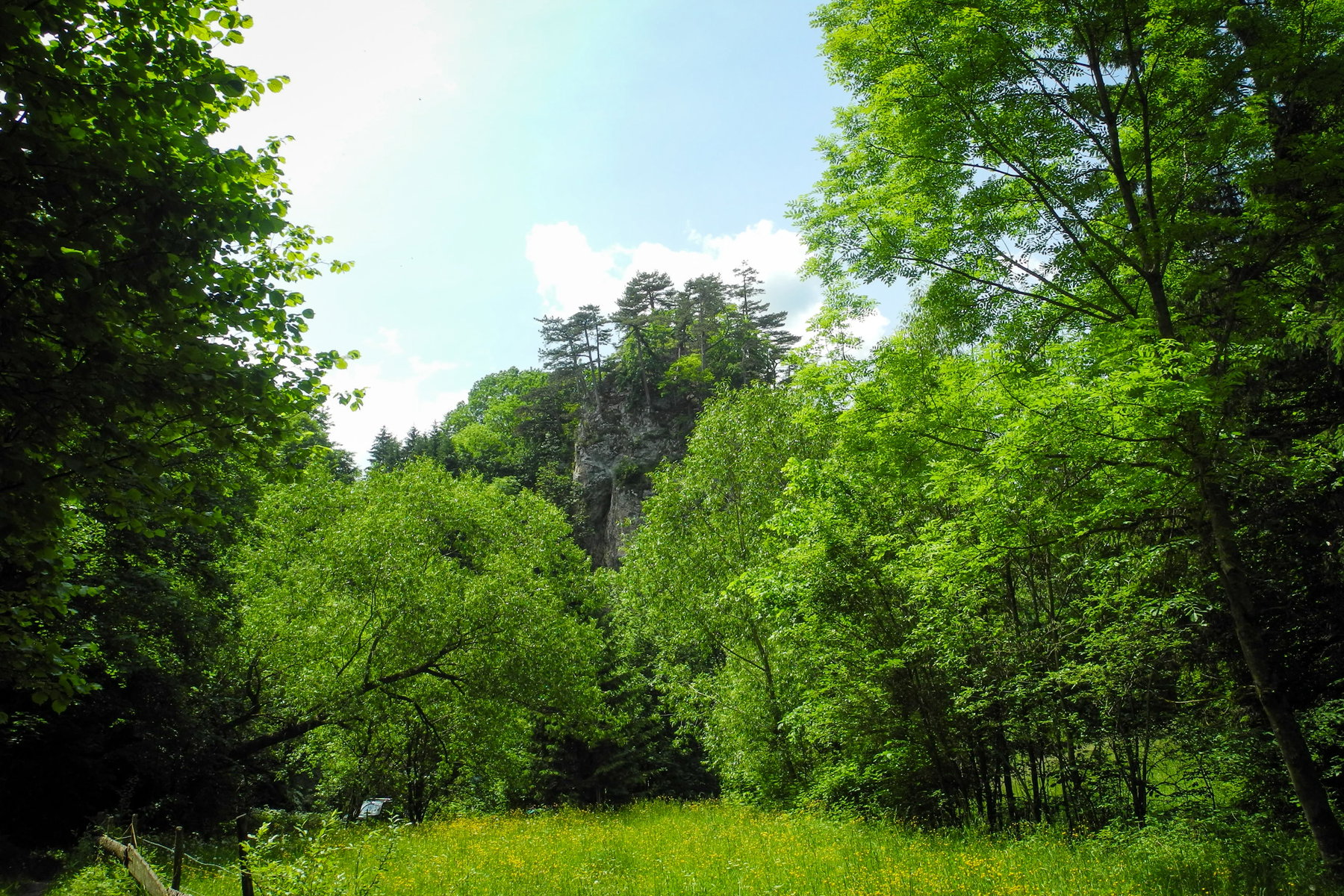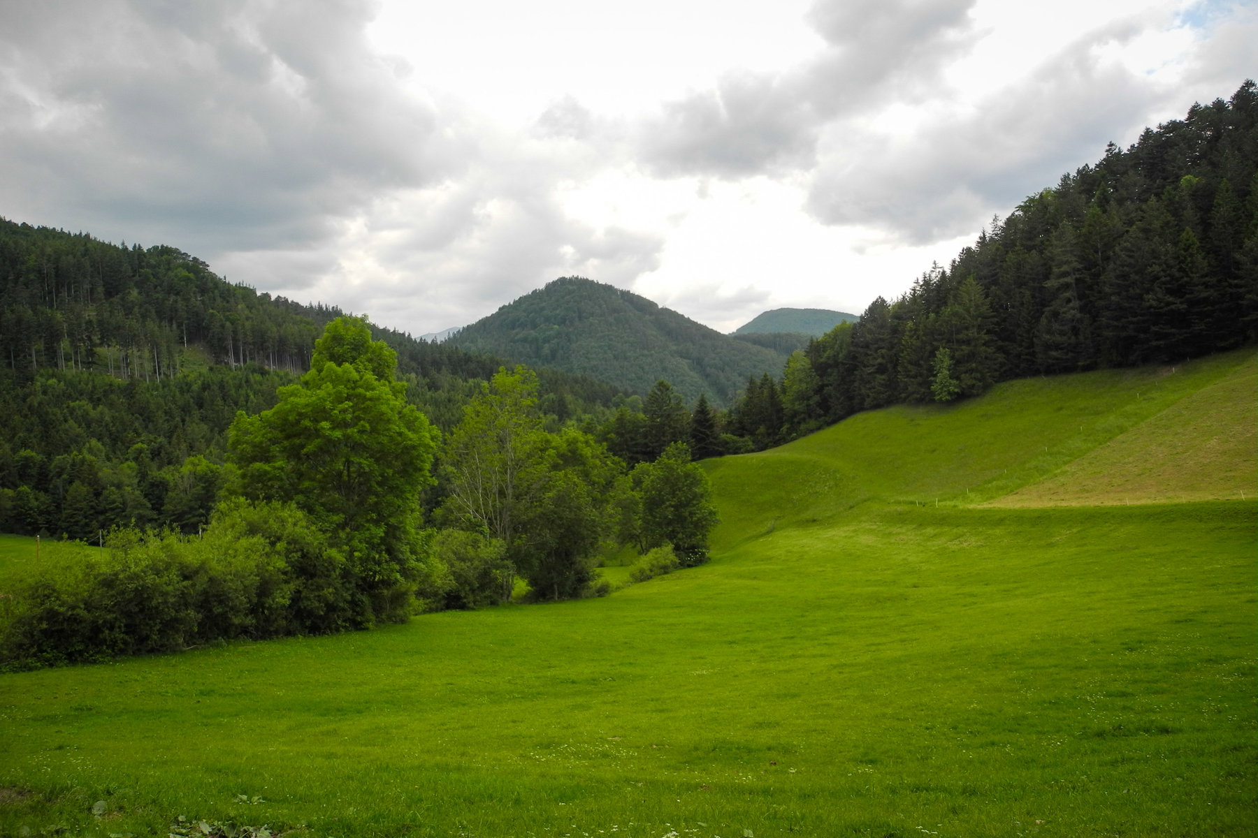 Wenn man auf Nummer sicher gehen will, kann man die Klamm aber auch umgehen, indem man auf dem Straßerl weitergeht. Dann kommt man auch am Zustieg zur Ruine Scheuchenstein vorbei, die man am Weg durch die Klamm leider nicht zu Gesicht bekommt. Kurz nach der Klamm mündet der Weg auf einen asphaltierten Güterweg, wo ich dem Schild „Panoramaweg“ folge. Der Weg, der offenbar wenig bis gar nicht begangen ist, zweigt wenig später links vom Güterweg ab und führt eine wunderschöne große Wiese hinauf zu einem alten Bauernhof, wo er wieder auf den Güterweg mündet. Zum Glück wurde die Wiese schon gemäht und ich folge einfach der Traktorspur und entdecke erst später, dass ich eigentlich ein bisschen vom Weg abgekommen bin.
