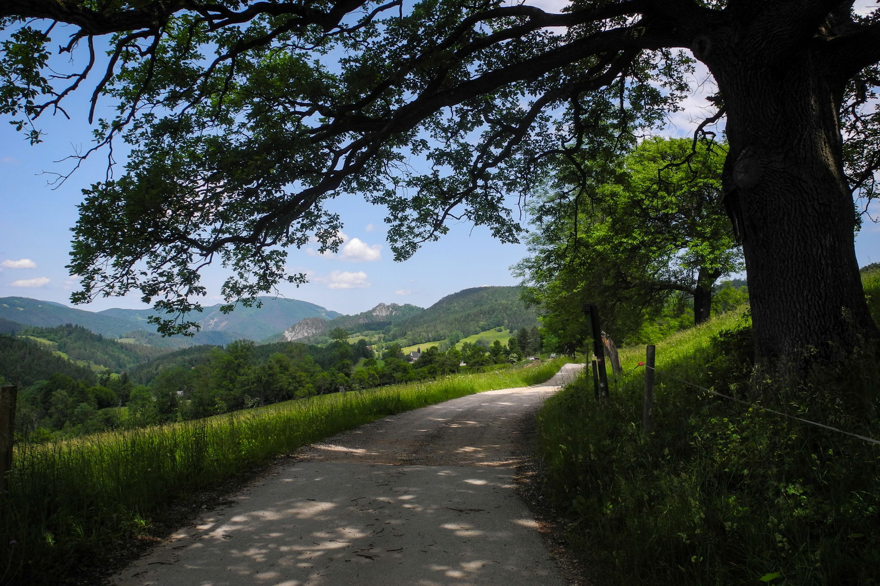 Annähernd eben geht’s jetzt durch eine idyllische bäuerlich geprägte Landschaft mit tollem Ausblick Richtung Norden. Die Gauermann-Eiche am Wegrand erinnert daran, dass der Biedermeiermaler Friedrich Gauermann hier geboren wurde. Angesichts der Schönheit der Gegend wundert es nicht, dass er mit den Bildern ländlich-bäuerlicher Szenen berühmt wurde. Der Feldweg endet im Ort Scheuchenstein, wo es auch ein Gauermann-Museum gibt, das aber ebenso wie der Kirchenwirt Perger nur am Wochenende geöffnet hat.
