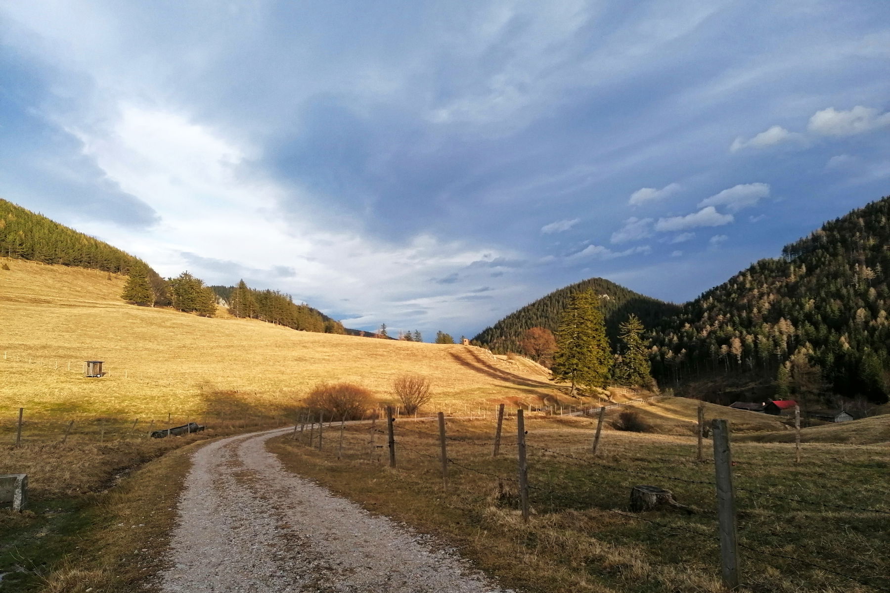 Hier ist auch schon das Öhlerschutzhaus mit zwei Stunden angeschrieben und ich stelle eine schnelle Zeitrechnung auf. Wenn ich weiter so gut vorankomme und sich die Sonne an ihre geplante Untergangszeit um kurz nach 17 Uhr hält, geht sich das noch aus. Alternativen gibt es grad ohnehin nicht so viele. Also rüber über die Straße, rein in den Wald und rauf auf den Berg!