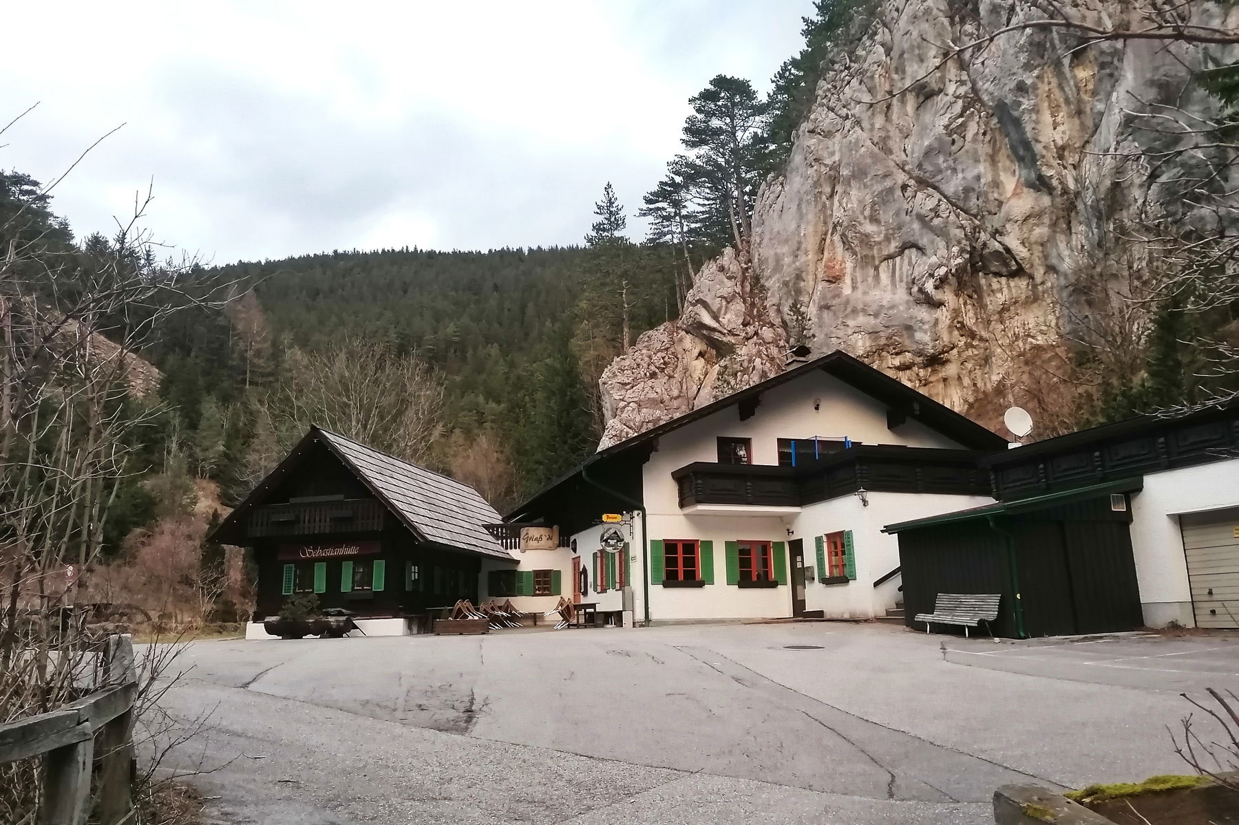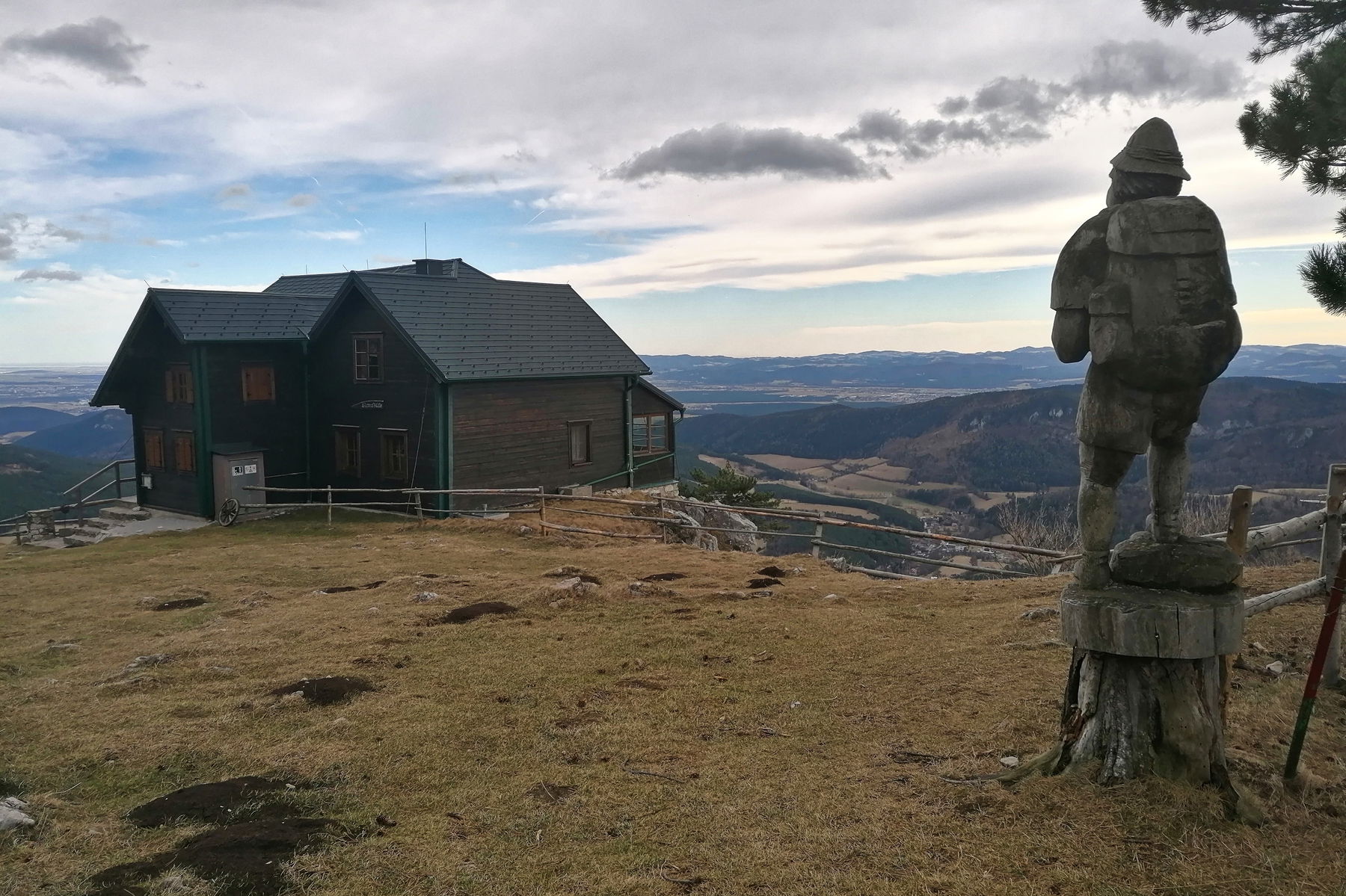 Irgendwann kann ich mich endlich lösen und stehe auch schon beim Öhlerschutzhaus, mit dem ich sehr gute Erinnerungen an die besagte Frühlingstour mit Freundinnen verbinde. Hier haben wir wunderbar geschlafen und einen sehr lustig-gemütlichen Abend verbracht. Im Winter ist die Hütte nur an den Wochenenden geöffnet, je nach Schneelage. Schnee liegt hier sowieso keiner, aber Wochenende ist es, insofern ist alles zu.