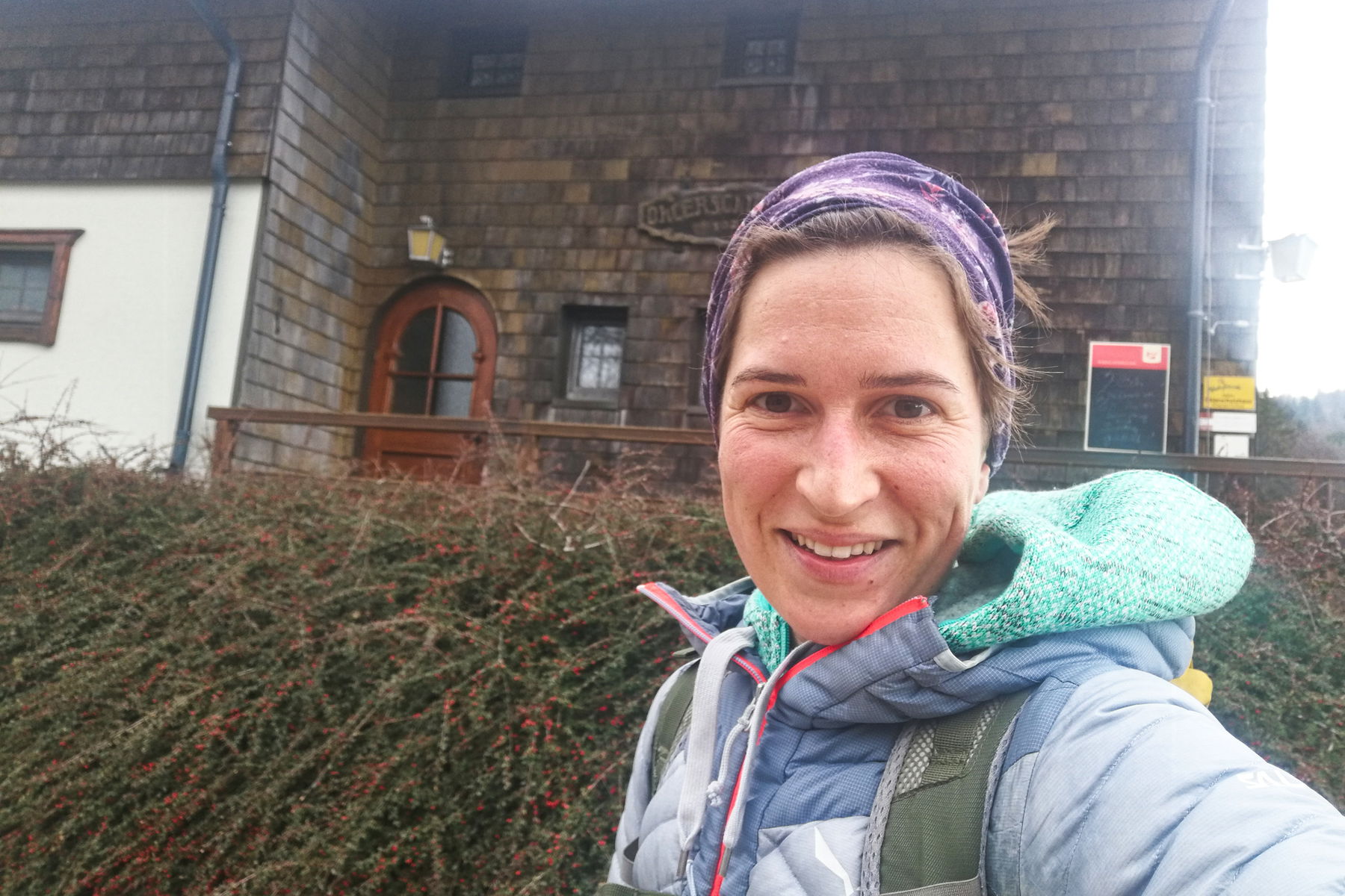 Es geht vom Bahnhof sehr direkt aufs Geländ hinauf. Ich finde zwar nicht genau den Weg, den ich mir in der Alpenvereins-App vorbereitet hatte, aber das macht nichts. Schließlich führen viele Wege nach oben (den Großteil des Weges bin ich am Judith Kremer Steig) und die Hütte winkt mir schon kurz nach dem Bahnhof entgegen. Es ist ganz schön stürmisch und ich bin ganz schön verschwitzt, als ich oben ankomme. Dafür unterbiete ich die beim Bahnhof angeschriebene Gehzeit von einer Stunde um gut 10 Minuten.