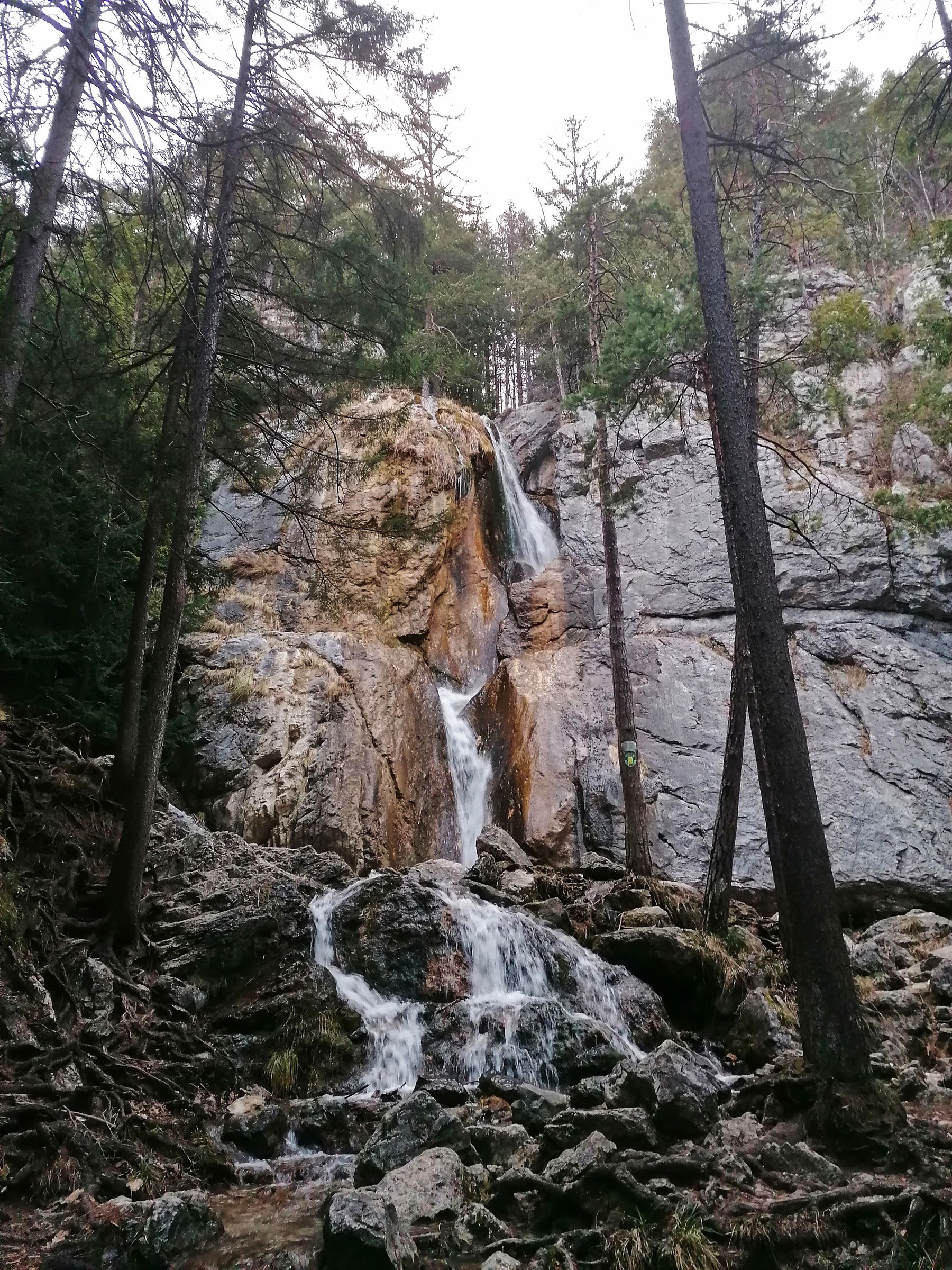 Der Weg führt im Wald direkt am Sebastianbach zuerst steil, dann sanfter bergab und ist wirklich schön. Sicher auch sehr empfehlenswert für heiße Sommertage und bestimmt auch im Aufstieg wegen der Kühle des Wassers im Wald empfehlenswert! Der Sebastian-Wasserfall ist tatsächlich sehr beeindruckend und kurz danach bin ich schon beim Wasserfall-Wirt.