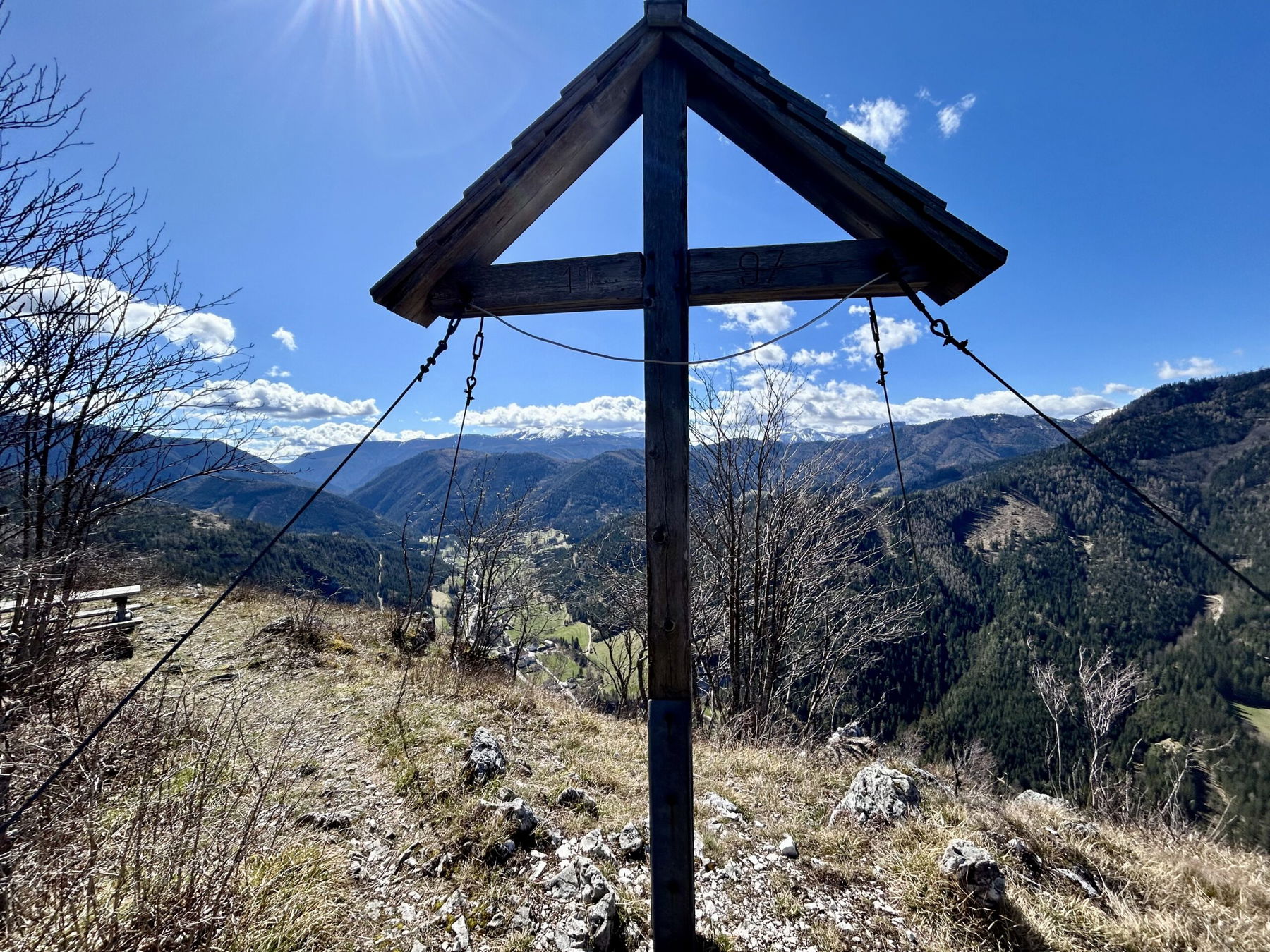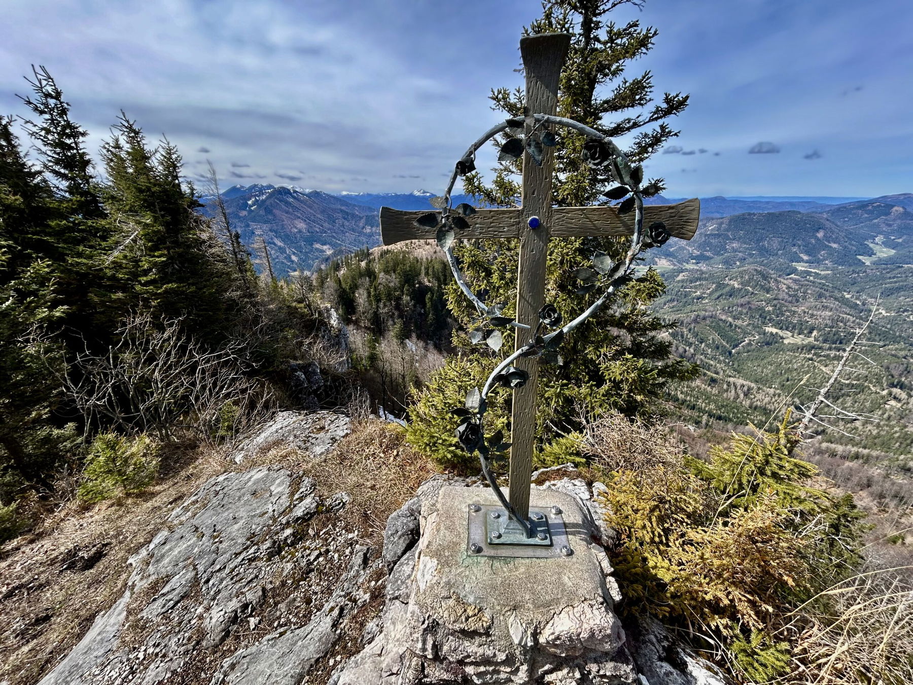Die Aussicht ist traumhaft. Auf dem Gipfel, der nach Südwesten steil und felsig abfällt, stehen neben dem hübschen Gipfelkreuz noch Bänke und ein Tisch – ein toller Jausenplatz! Jemand in meinem Inneren sagt laut: „Nusskipferl“.