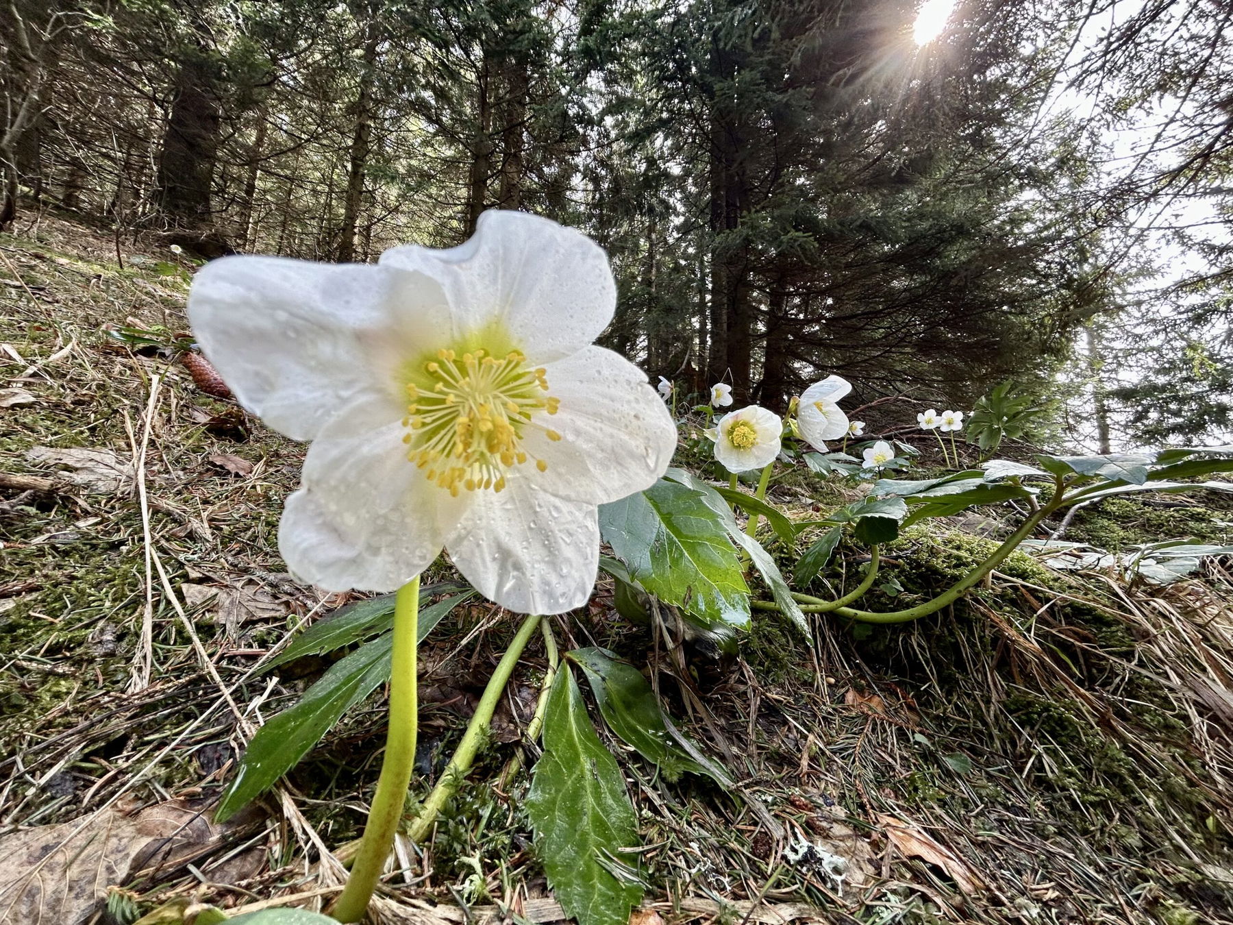 Wieder zurück zum Wanderweg, weiter steil durch einen schönen Wald und ein Meer aus Schneerosen.