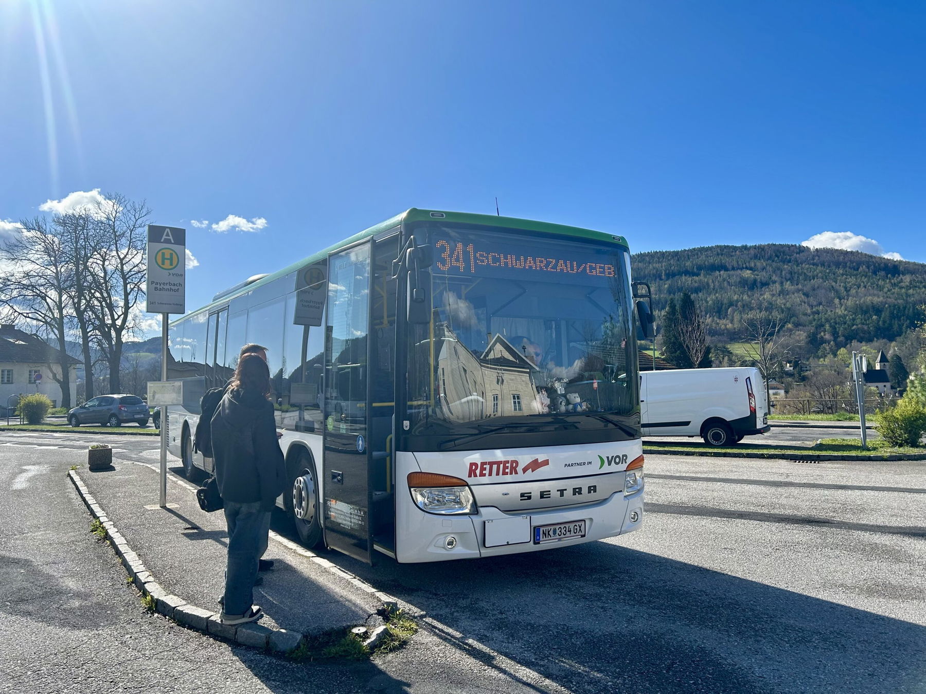 Entspannt steige ich in Payerbach am Bahnhof in den Bus nach Schwarzau um. Die Fahrt durch das landschaftliche beeindruckende Höllental ist immer ein Erlebnis (auch ohne die Stichfahrt nach Hinternasswald). Ab dem Weichtalhaus bin ich allerdings der einzige Fahrgast. #fahrtmehrbus 🙂