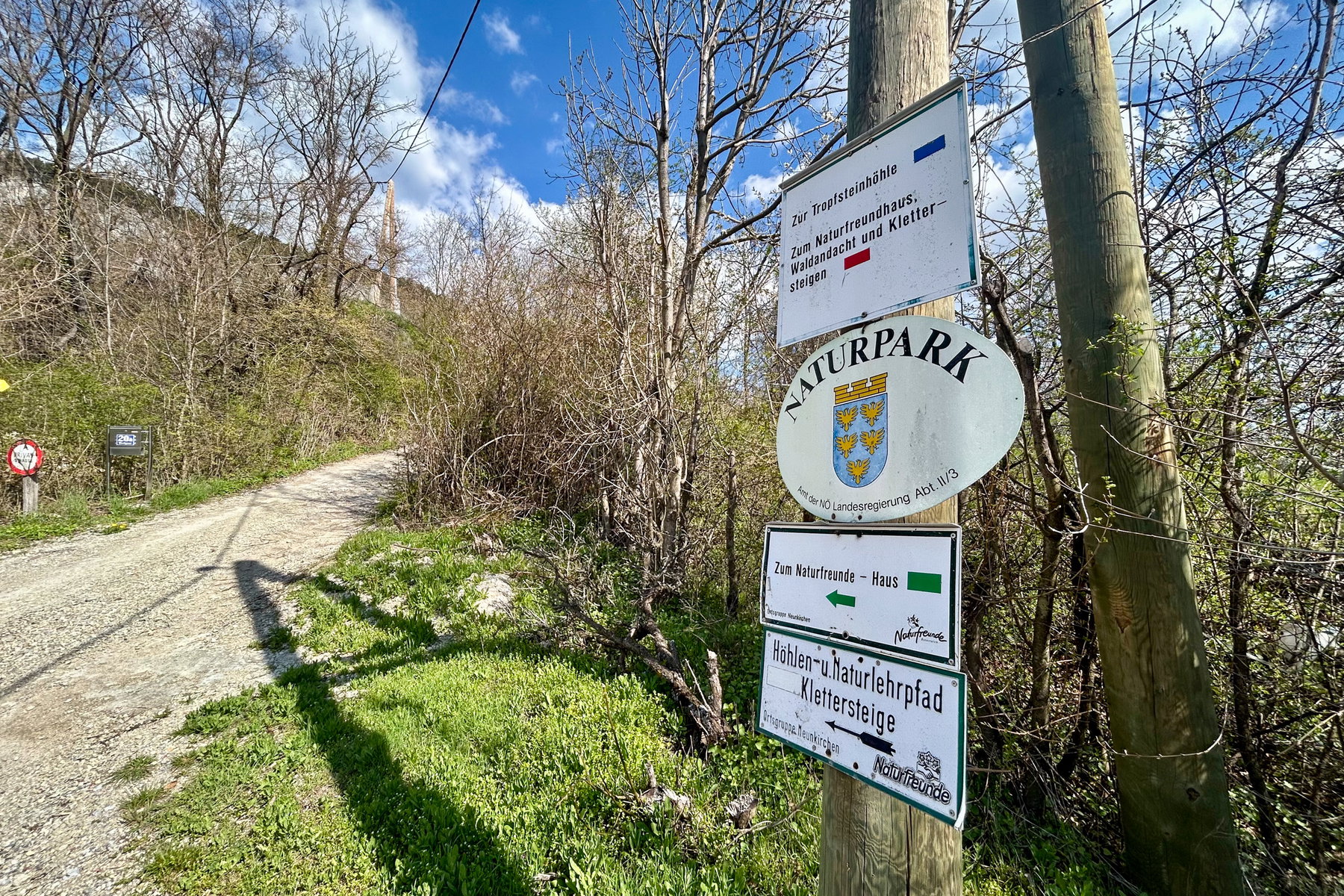 Ich überquere die Straße vorm Bahnhof und gehe durch den Stadtpark Richtung Friedhof. Hier beginnen die Wanderwege in den Naturpark Sierningtal-Flatzer Wand. Ich halte mich an die Markierung Richtung Neunkirchner Hütte um dann nach Flatz mit gelber Markierung abzubiegen.
