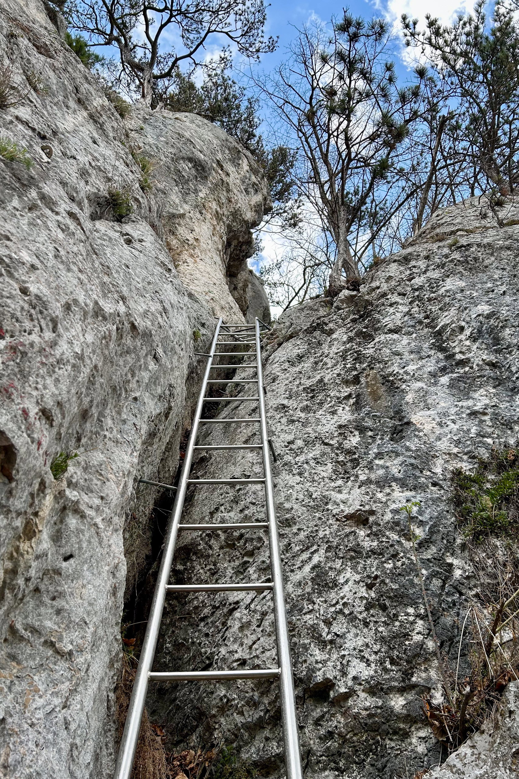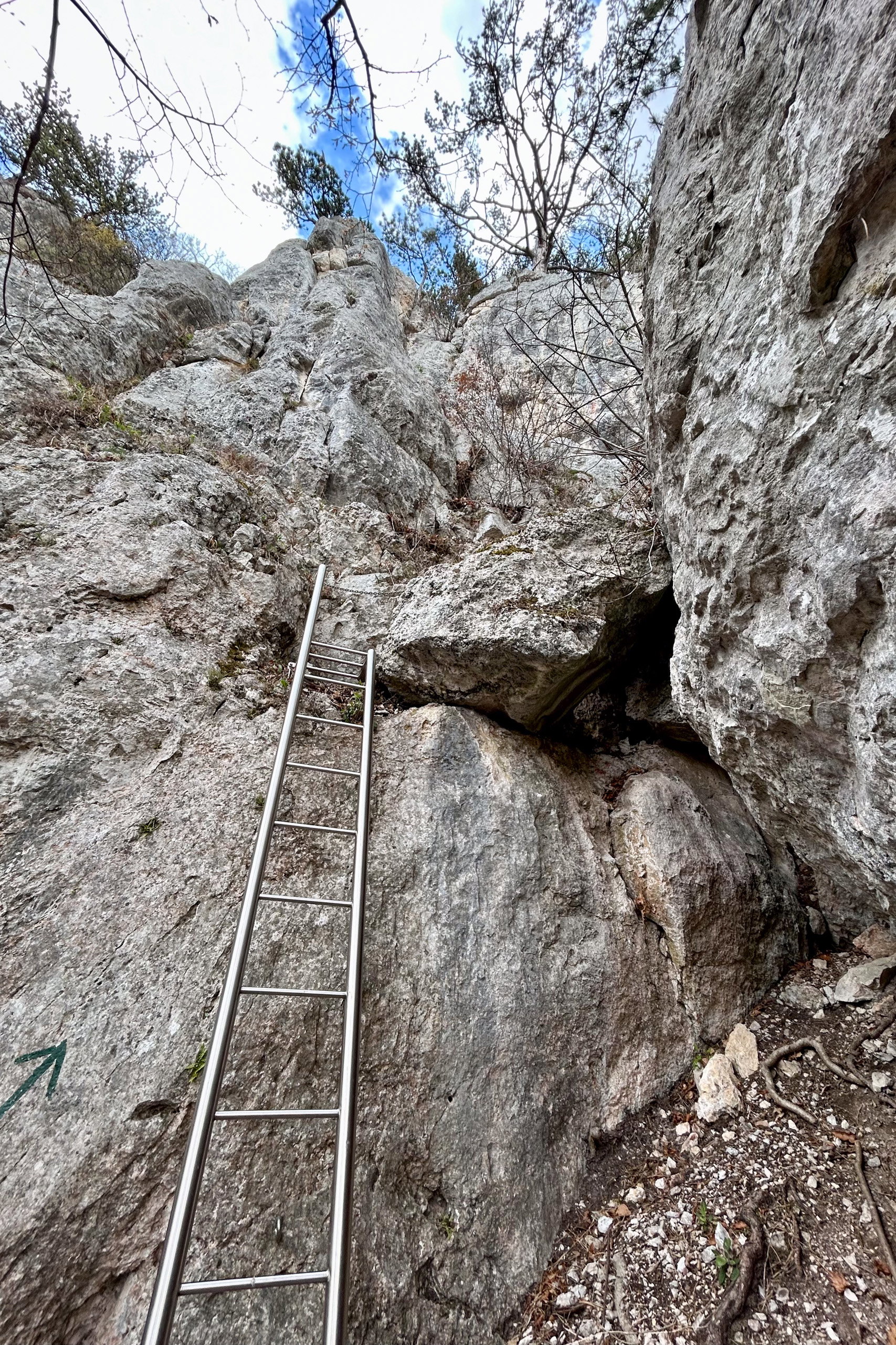 Der Klettergarten, Steige und Höhlen sind dann schon angeschrieben. Ich erreiche die Wandstraße – von hier führen viele Wege nach oben. Ich entscheide mich für den Jubiläumssteig. Das Gelände ist wirklich sehr ähnlich wie auf der Hohen Wand. Nach einem kurzen steilen Zustieg sehe ich schon die erste Leiter. Der Steig ist super angelegt und gut ausgestattet mit Leitern und Ketten. Ein paar luftige Tiefblicke und kleine Kraxelstellen verschönern das kurze Abenteuer.