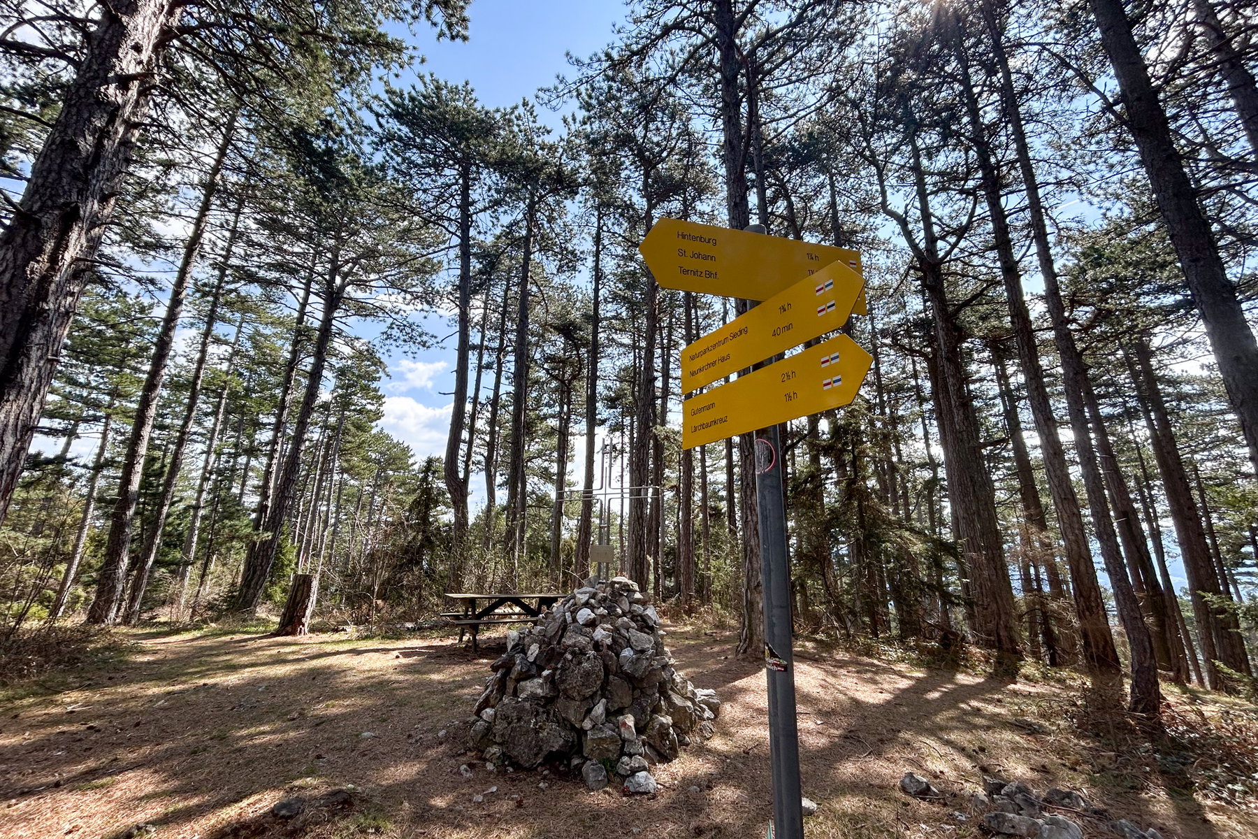 Am Gipfel des Gösings gibt es auch noch einen Jausenplatz und mehrere Abstiegsmöglichkeiten. Ich wähle den Weg zurück zum Bahnhof in Ternitz.