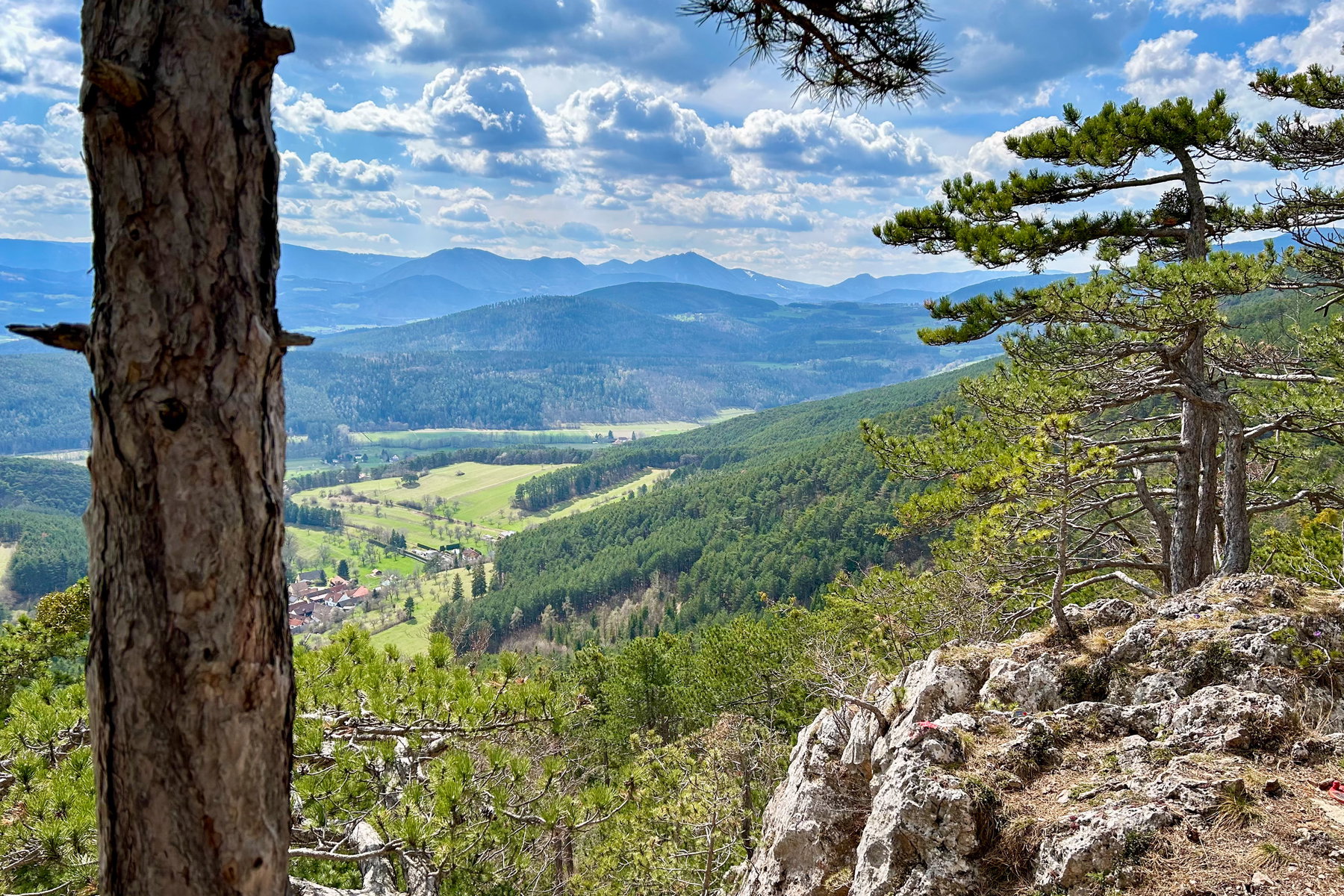 Am Weg hinauf gibt es einen schönen Aussichtsplatz mit Blick Richtung Schneeberg, dort mache ich Pause. Meine Jause ist zwar heil angekommen, aber dass ich fürs Verzehren eines Griesbreis auch eine Löffel gebraucht hätte, fällt mir erst beim Auspacken ein. So muss ein Finger herhalten. Schaut eh niemand zu. (Titelbild)
