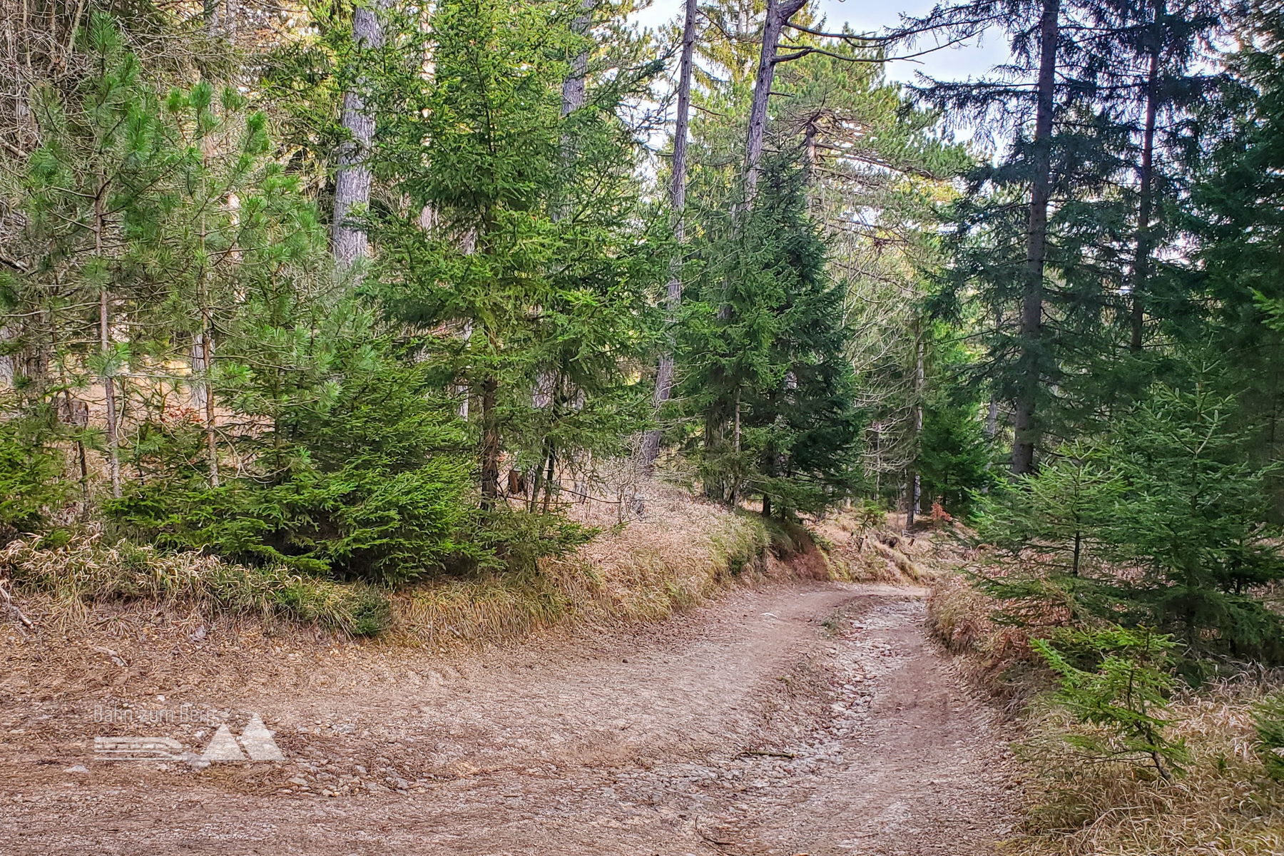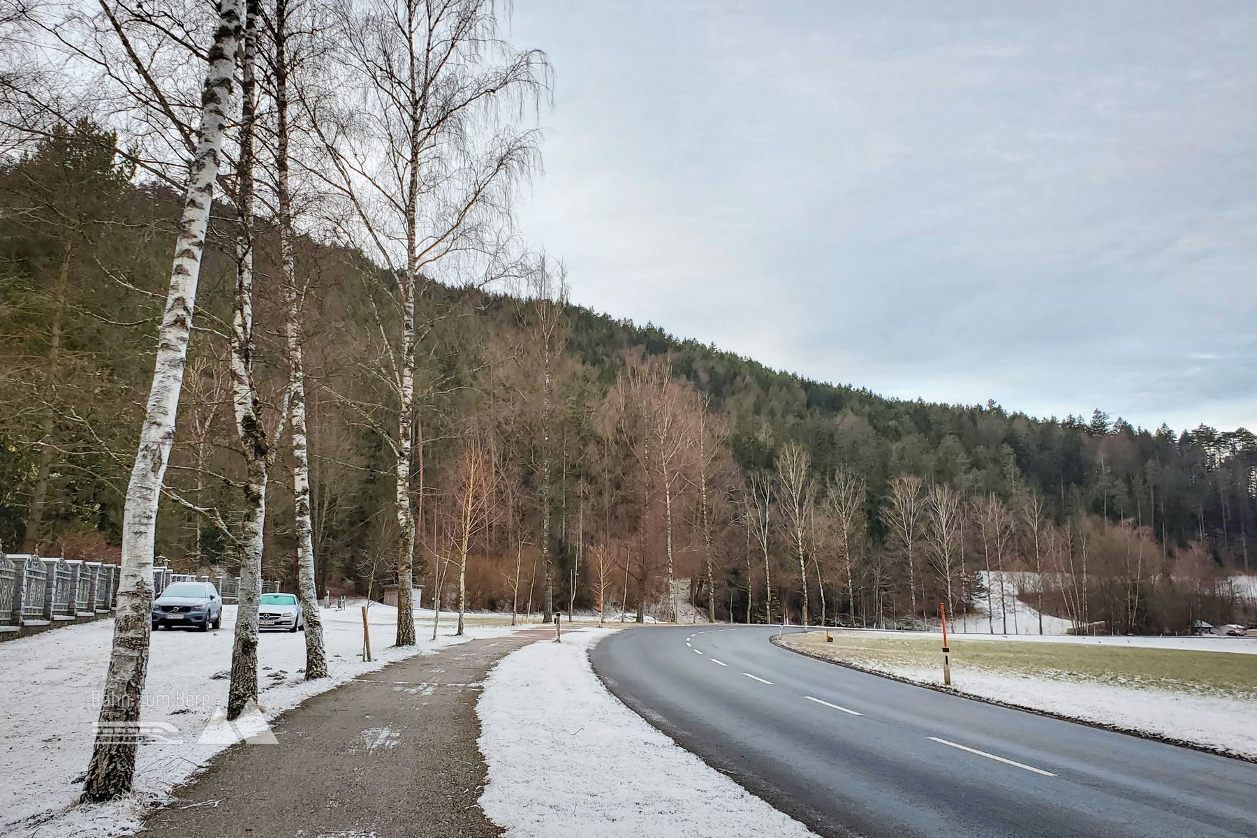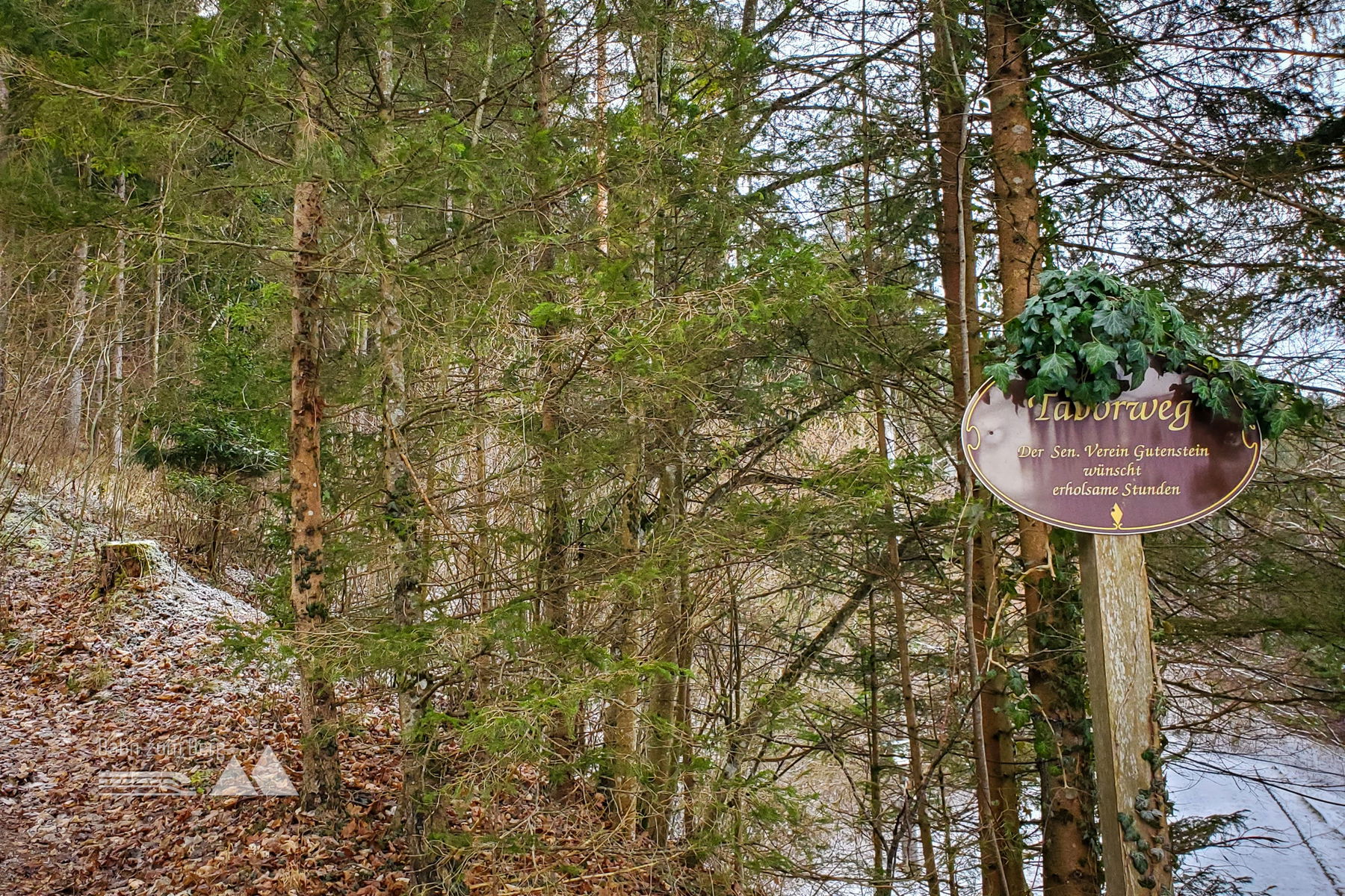 Vom Bahnsteig geht es erst mal links auf die Bundesstraße für knapp 200 Meter. Sobald ich eine gelbe Villa sehe, biege ich leicht links von der Bundesstraße auf eine Forststraße ab. Es geht vorbei an der Villa und leicht hinauf auf den Taborweg (mit einem Schild gekennzeichnet).
