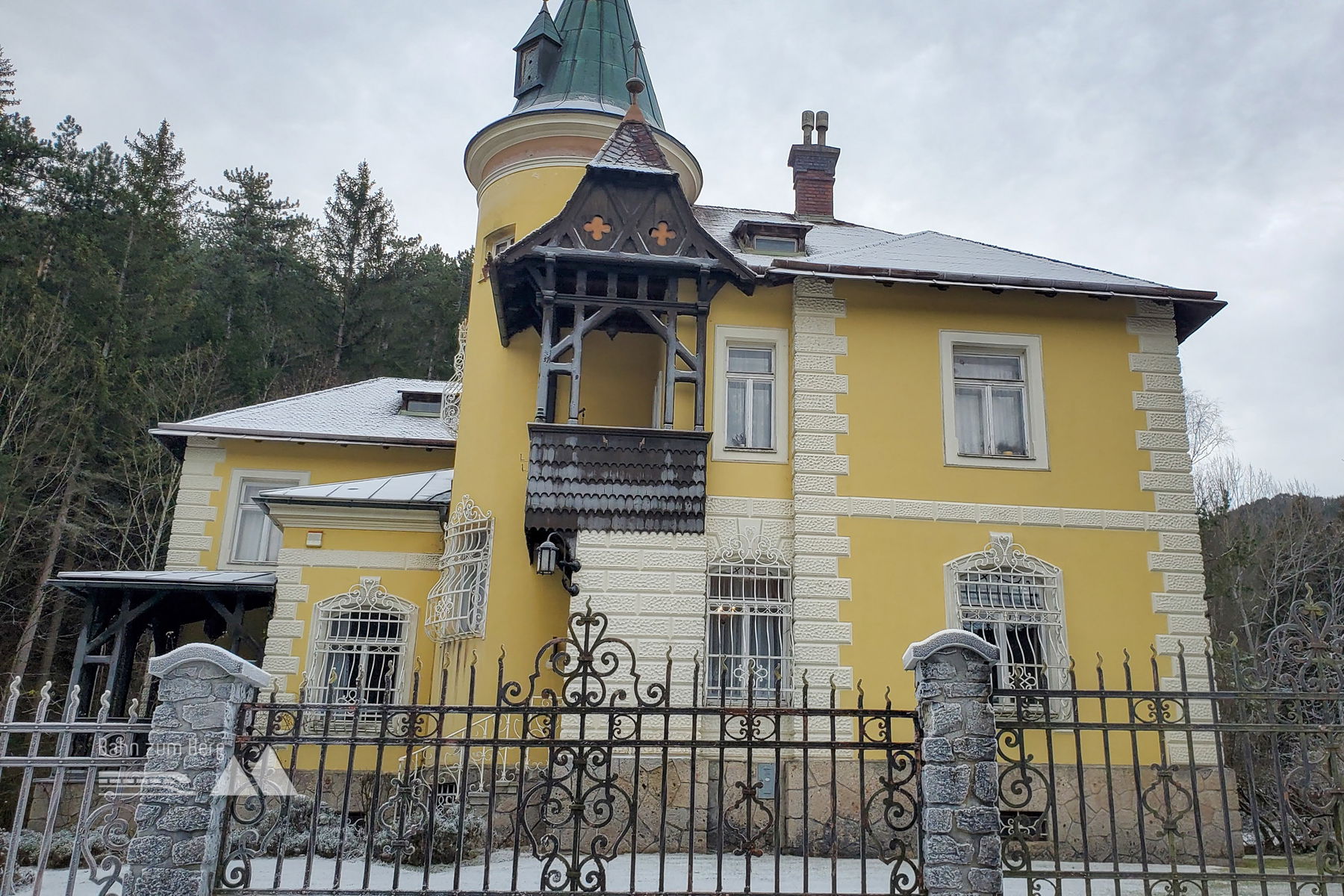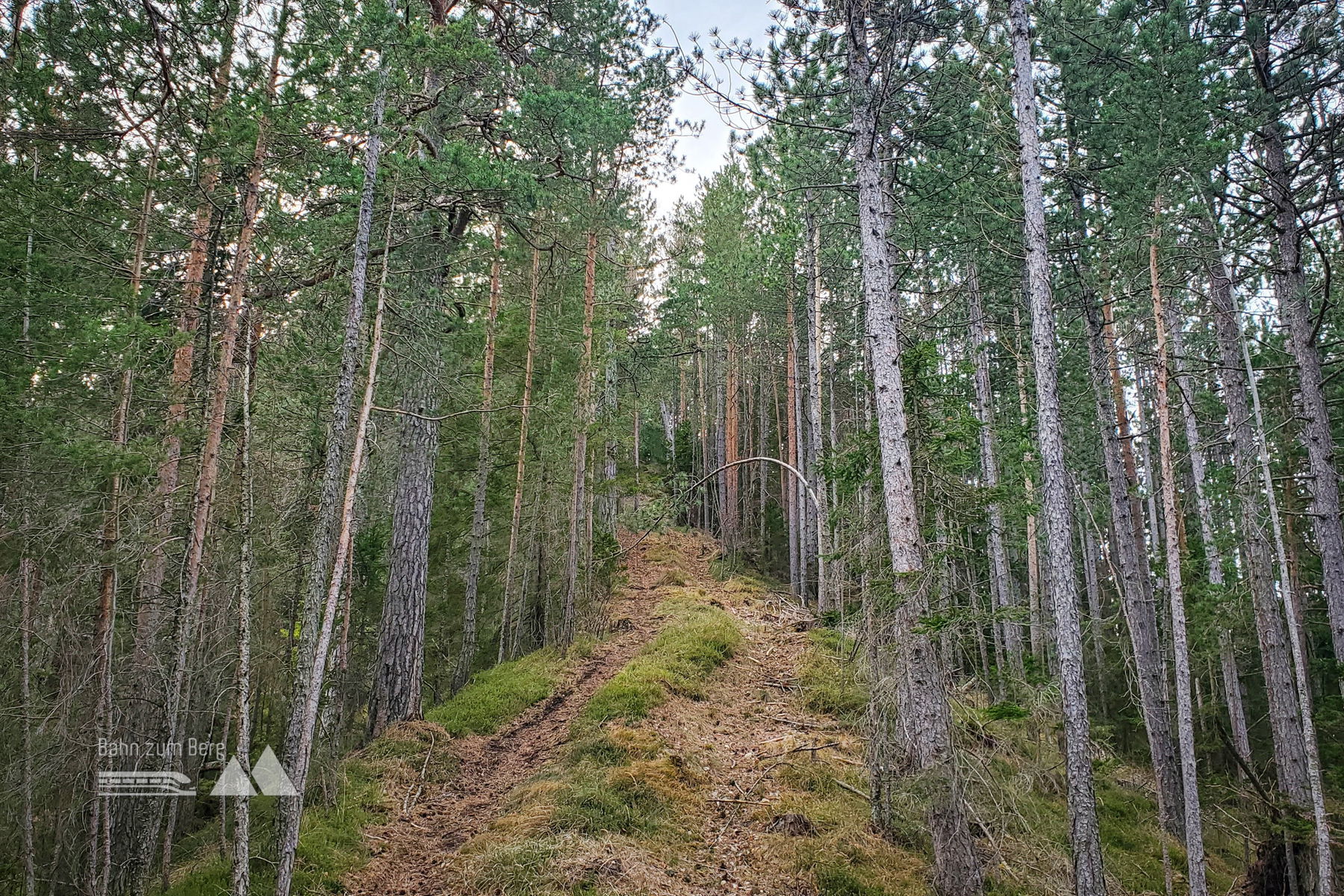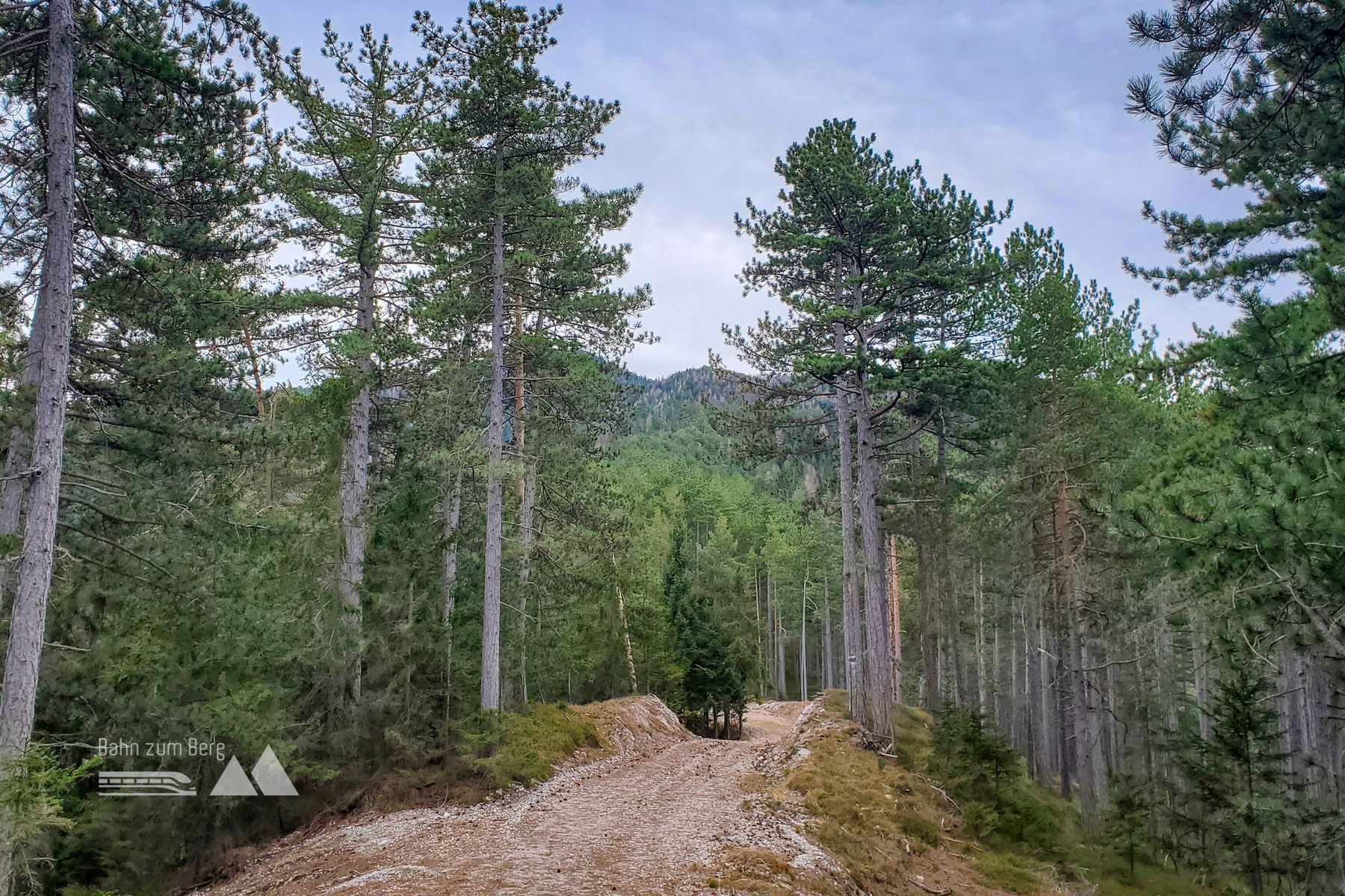 Vom Bahnsteig geht es erst mal links auf die Bundesstraße für knapp 200 Meter. Sobald ich eine gelbe Villa sehe, biege ich leicht links von der Bundesstraße auf eine Forststraße ab. Es geht vorbei an der Villa und leicht hinauf auf den Taborweg (mit einem Schild gekennzeichnet).