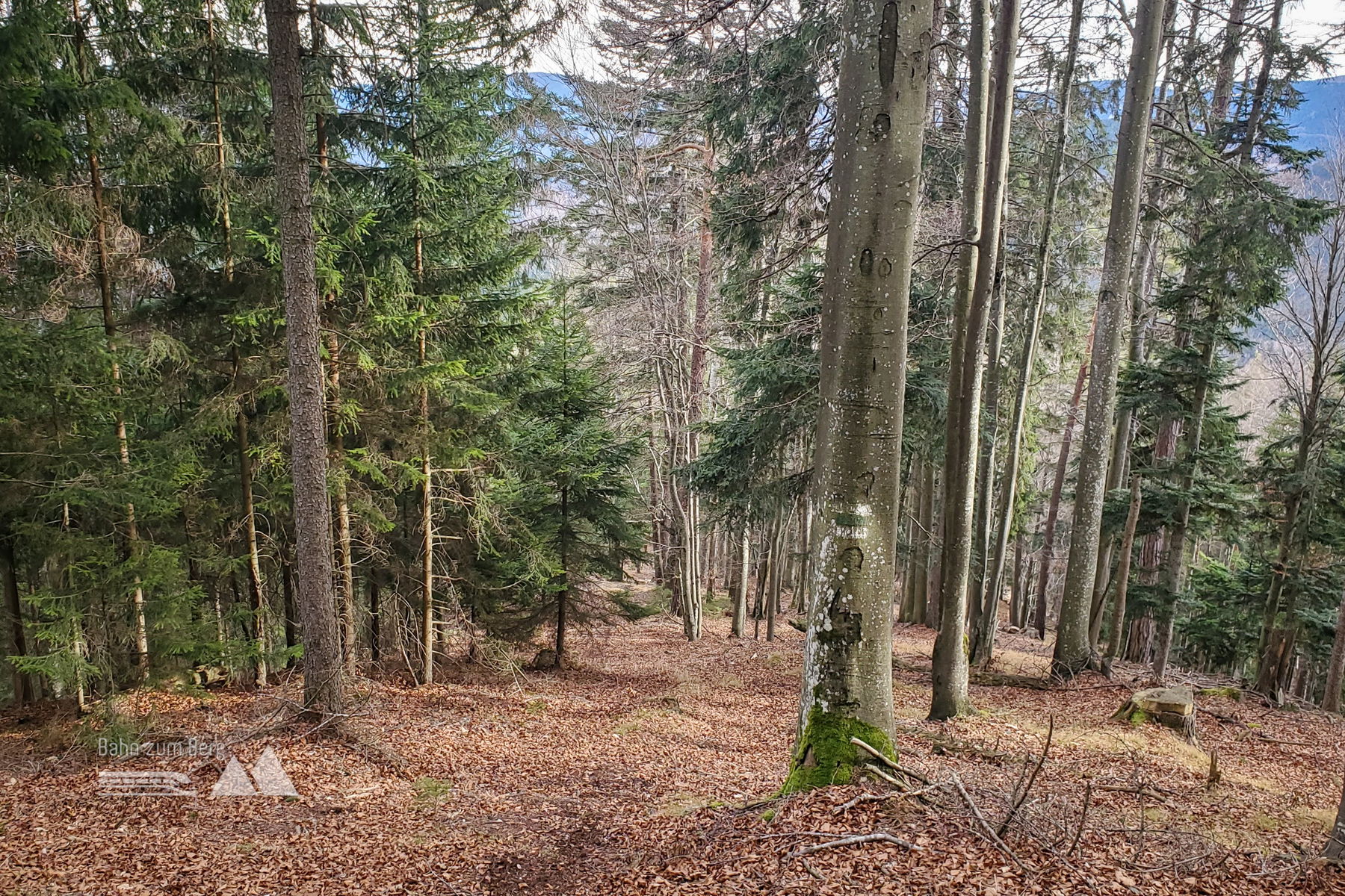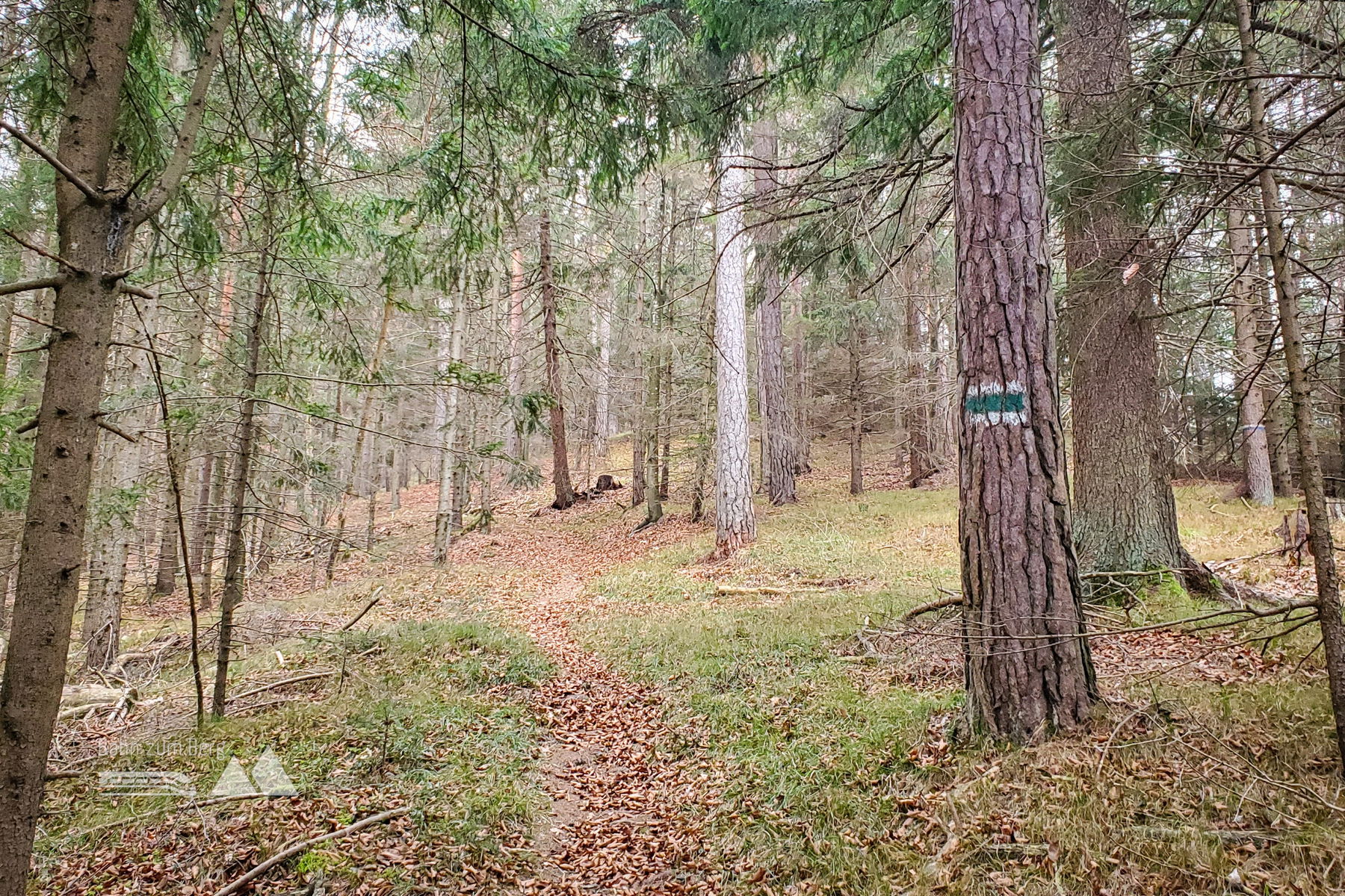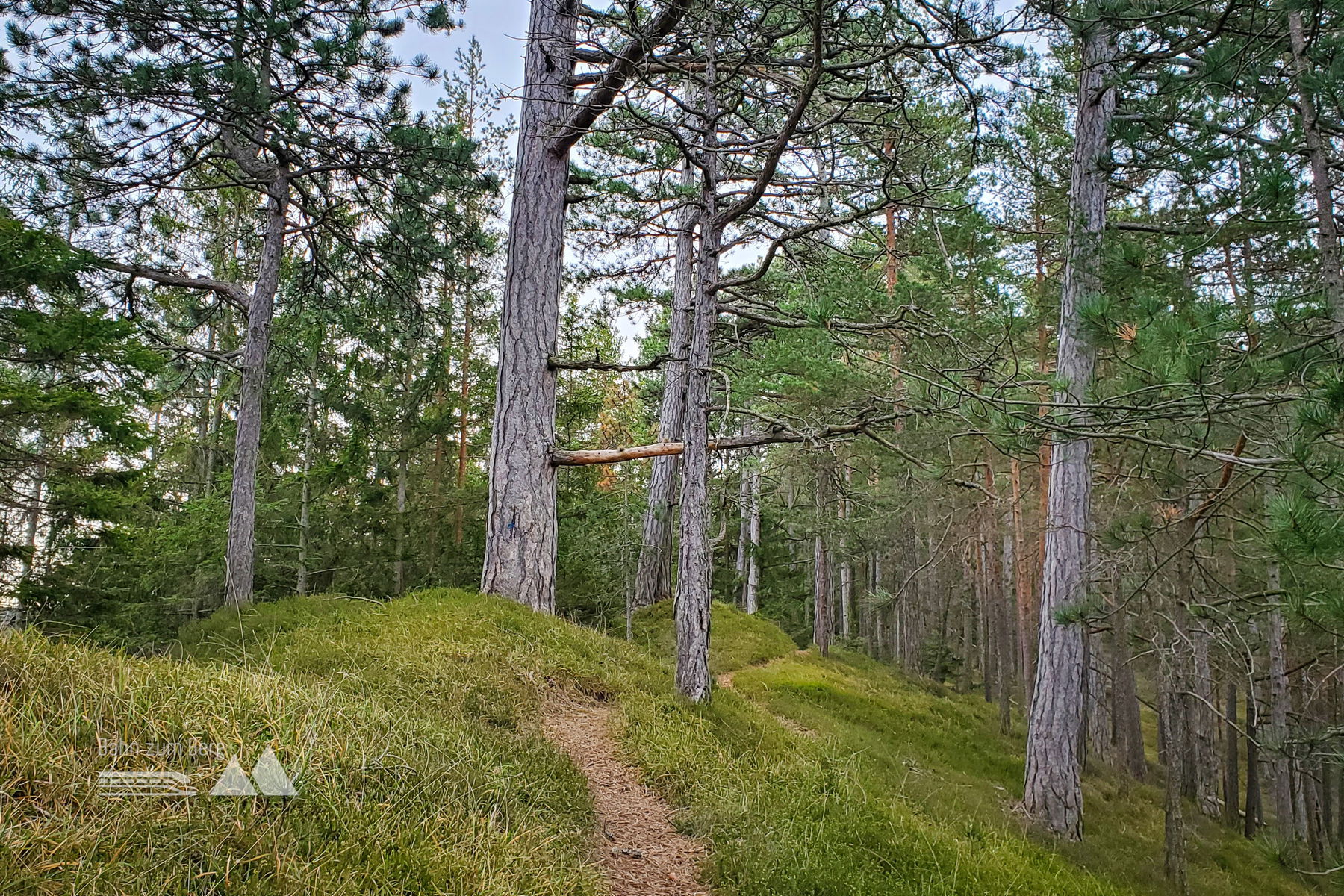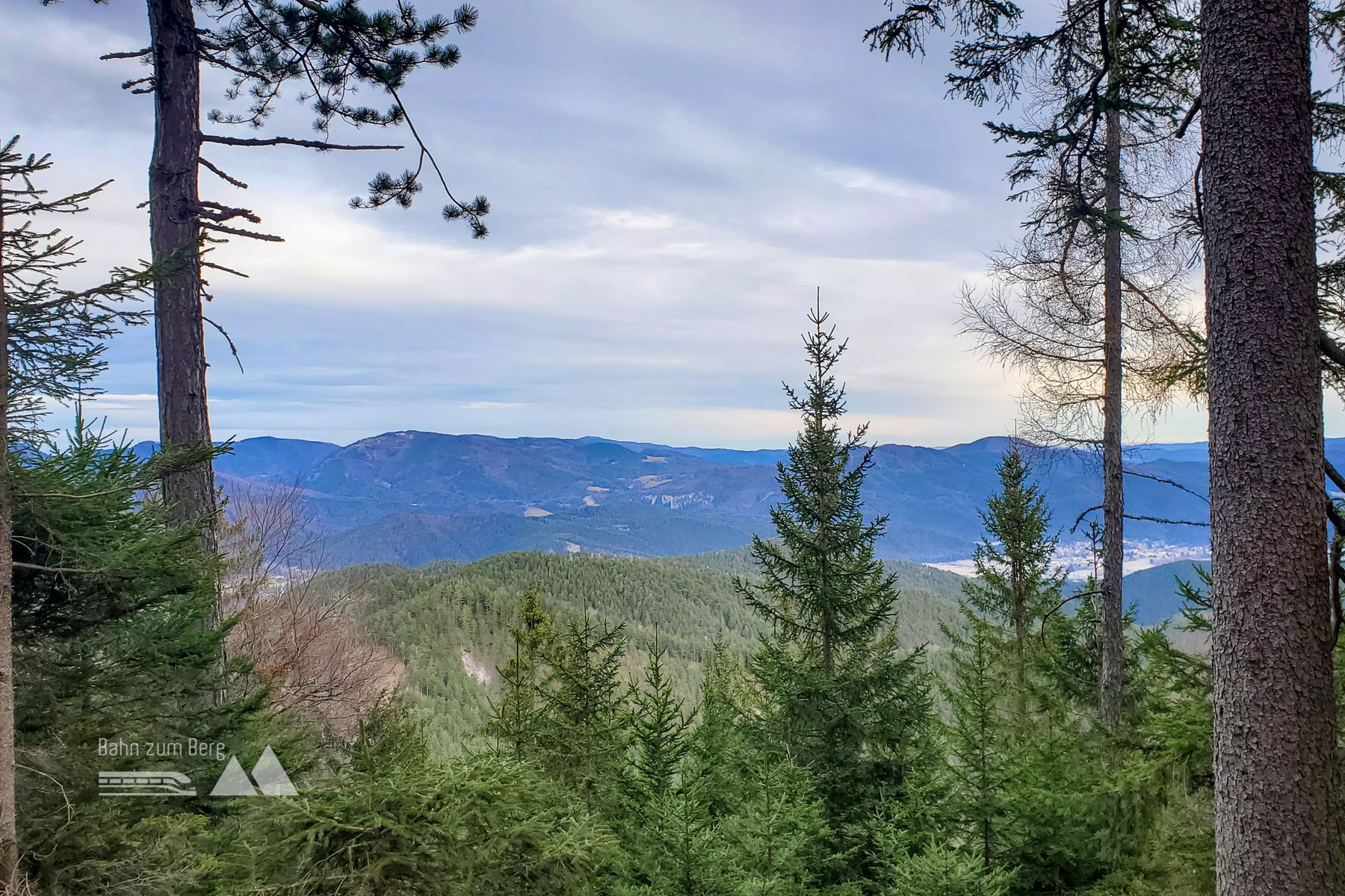 Schnell geht es für mich weiter vorbei am Gipfelkreuz und ich beginne mit dem Abstieg Richtung Reichental. Auch hier ist der Weg weiterhin gut markiert (grün/blau) und man kommt nicht schnell vom Wege ab. Zwischendurch gibt es immer wieder einen Ausblick auf die Gutensteiner Alpen.