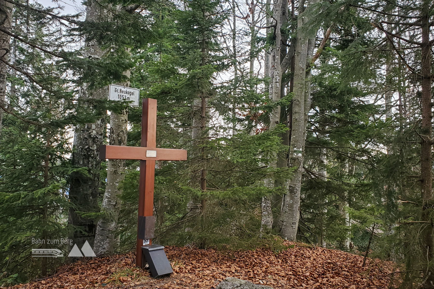 Ich kreuze die Forststraße und es geht weiter steil bergauf durch den Wald. Nach weiteren circa 500 Metern komme ich erneut für kurze Zeit an eine Forststraße, aber schnell biege ich wieder leicht links in den Wald ab (Markierung folgen). Von hier aus gibt es nur noch den einen steilen und gut markierten Weg hinauf auf den „Großen Neukogel“. Am Großen Neukogel angekommen werde ich mit einem Gipfelkreuz und einen Gipfelbucheintrag belohnt.