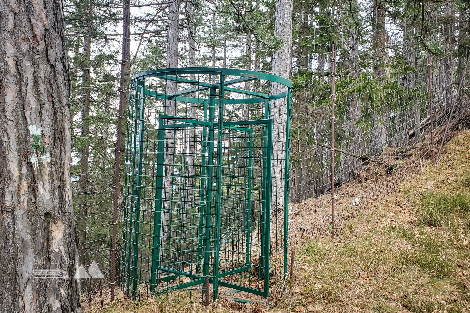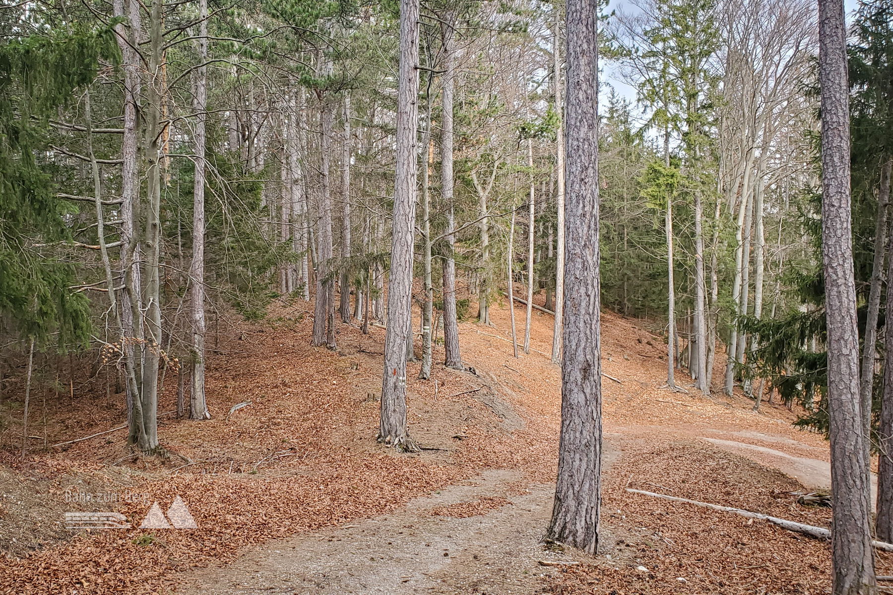 Der Weg führt außerdem zuerst entlang eines Wildgeheges, welches man an einem Punkt durch ein Drehkreuz betritt (die Markierung zeigt auch hier, dass man ins Gehege muss). Nach gut 3 Kilometern Abstieg erfolgt ein erneuter steiler, aber kurzer Aufstieg auf den Hauskogel und man bewegt sich wieder entlang des Zaunes des Wildgeheges. Nach etwa 800 Metern nach dem Aufstieg verlasse ich das Wildgehege (erneut durch ein Drehkreuz) und folge dem Pfad geradeaus weiter bis zu einer Kreuzung mit 4 Forststraßen. Hier biege ich nach rechts auf die Forststraße ab.