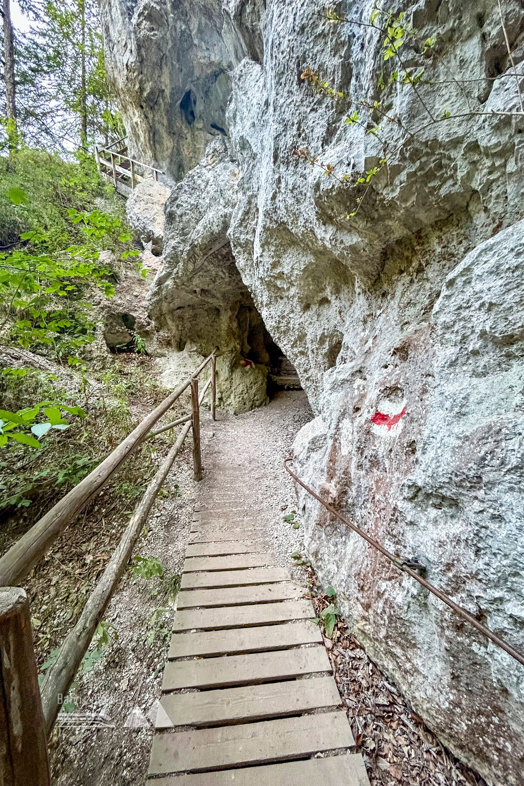 Ich komm zur Abzweigung Rudolf-Decker-Steig – einem kurzen Klettersteig mit einigen Leitern und Durchgangshöhlen. Bei trockenen Verhältnissen recht einfach, bei Nässe bitte gut aufpassen. Alle Geübteren nehmen den Steig, der Rest bitte den Weiterweg durch die Klamm. Kurz vorm Türkenloch treffen wir uns dann wieder.