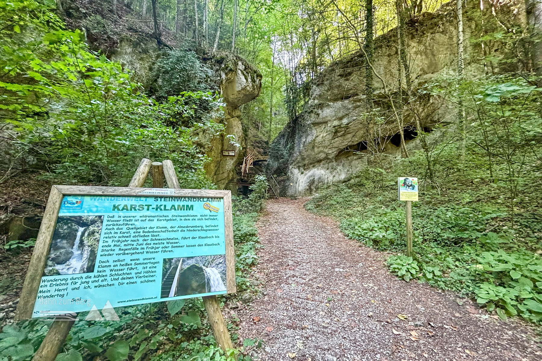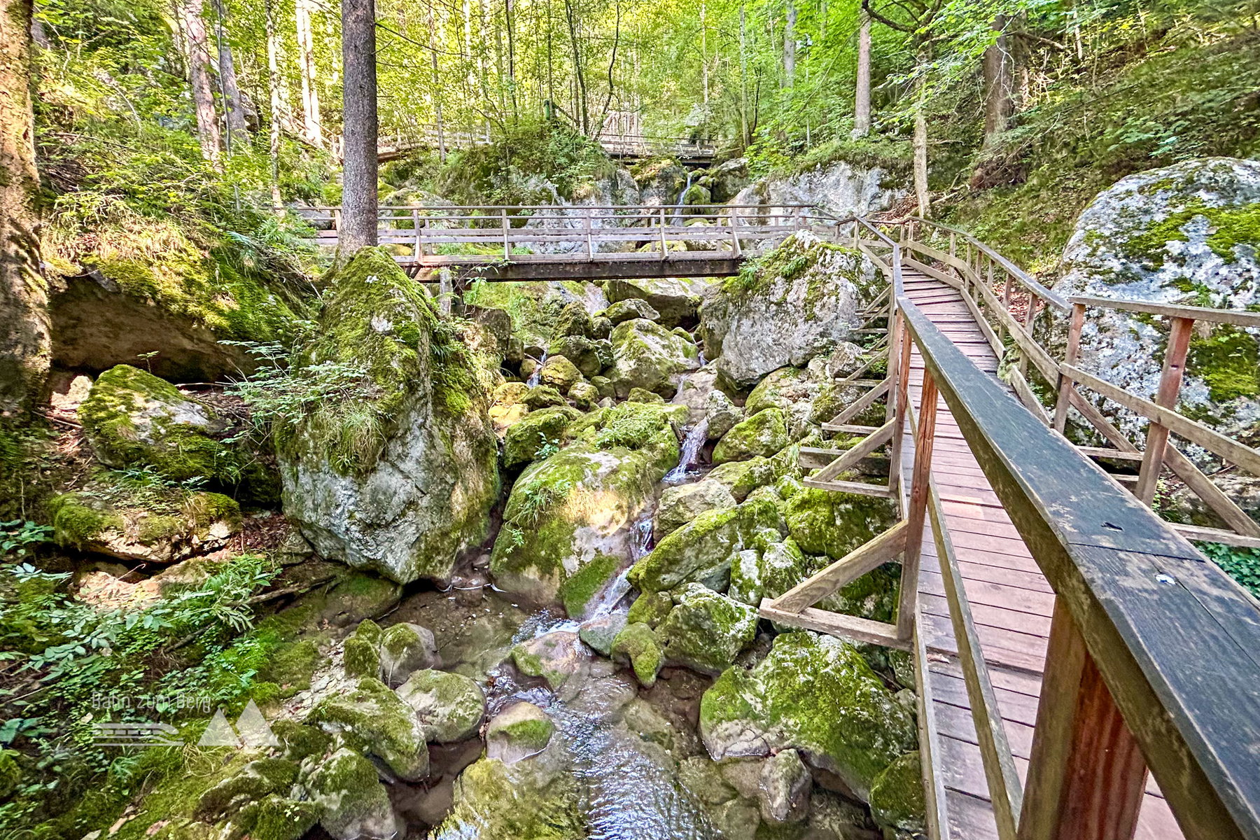 Mit dem Bus fahre ich vom Bahnhof Pernitz-Muggendorf direkt bis zu den Myrafällen. Die riesigen Parkplätze lassen erahnen, wie viele Leute sich hier am Wochenende tummeln. Dementsprechend ist der Eingang zur Klamm gesichert. Ohne Eintrittskarte kommt man weder rein noch raus. Dafür ist der Weg samt Holztreppen und Rampen top gepflegt und sauber – WC am Eingang im Preis inkludiert.