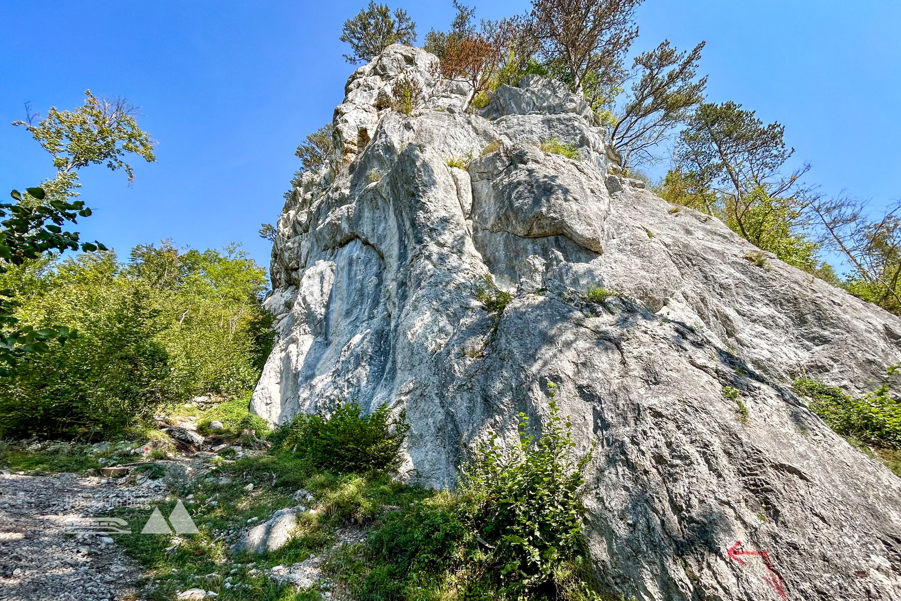 Der Wanderweg führt mich weiter durch den Wald zu einer großen Wiese mit Rastplatz. Hier zweigt der Pfad zum Gipfel des Haussteins ab. Sein Gipfelkreuz steht auf einem pittoresken Kalkfelsen, der aus dem Föhrenwald herausragt. Schon die Kelten, die den Hausstein als „Schutzberg“ erkannten, wählten ihn als eine der vordersten Bastionen gegen die im Tiefland ansässigen Römer. Neben dem Gipfelkreuz finde ich eine Panoramakarte und genieße den schönen Blick ins Tal und in die Berglandschaft ringsum.