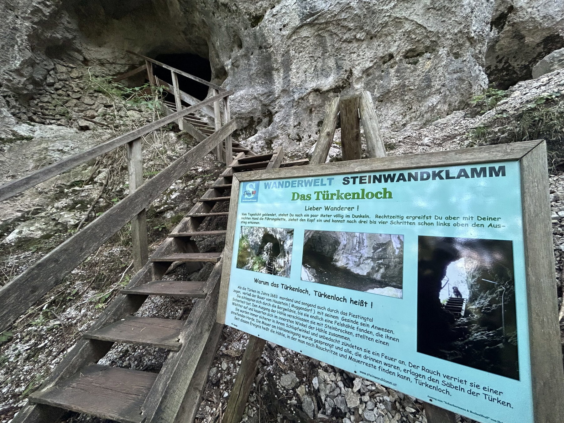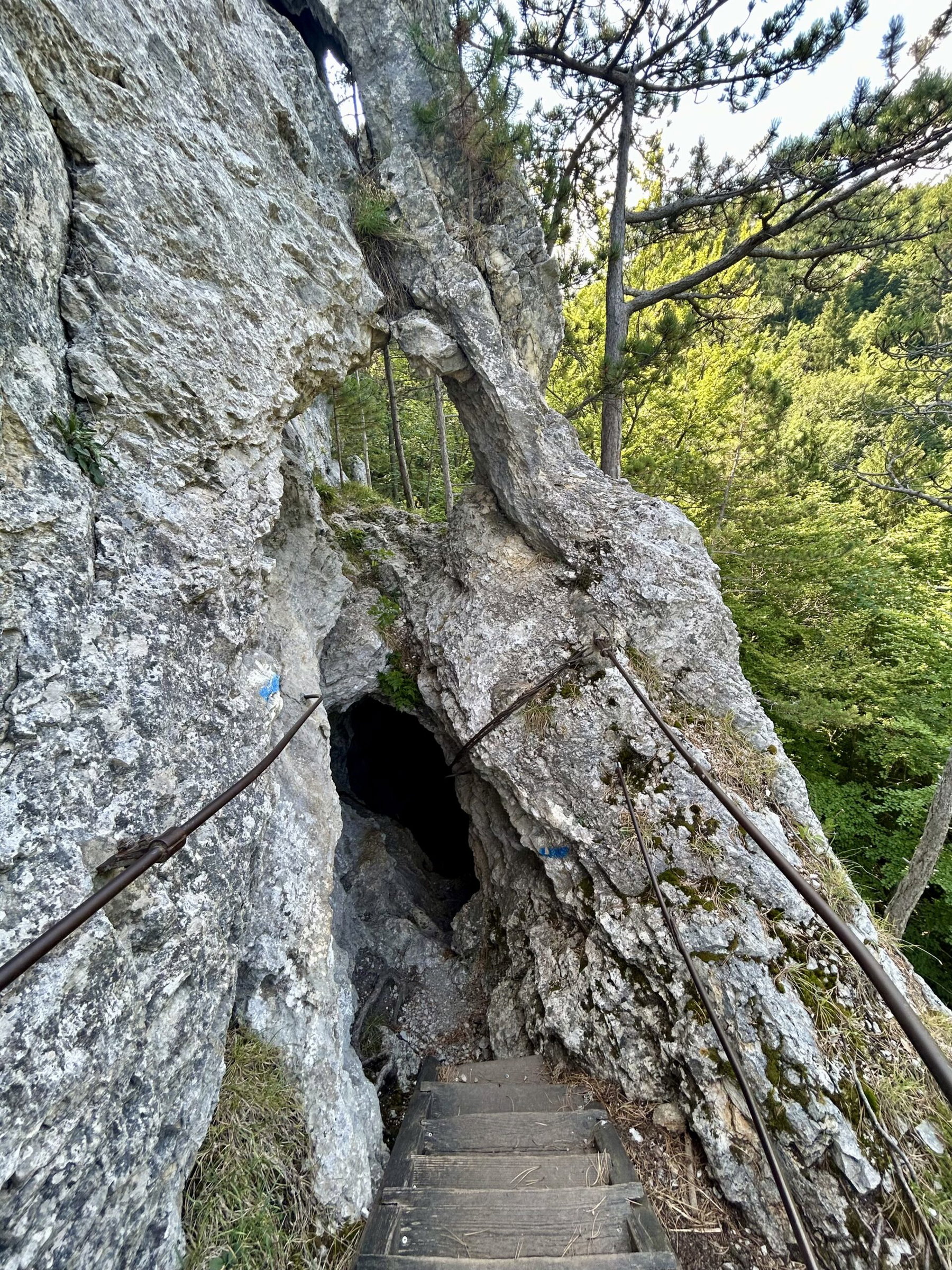 Mehr Leitern, eine weitere Durchgangshöhle – Achtung: Kopf einziehen und schon bin ich am Ende des Steigs und treffe wieder auf den Wanderweg. Für alle gemeinsam geht es jetzt durchs Türkenloch. Das war in meiner Kindheit immer eine Gaudi, weil unsere Oma sich beim Durchgehen sehr gefürchtet hat oder zumindest eine gute Schauspielerin war.